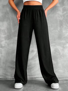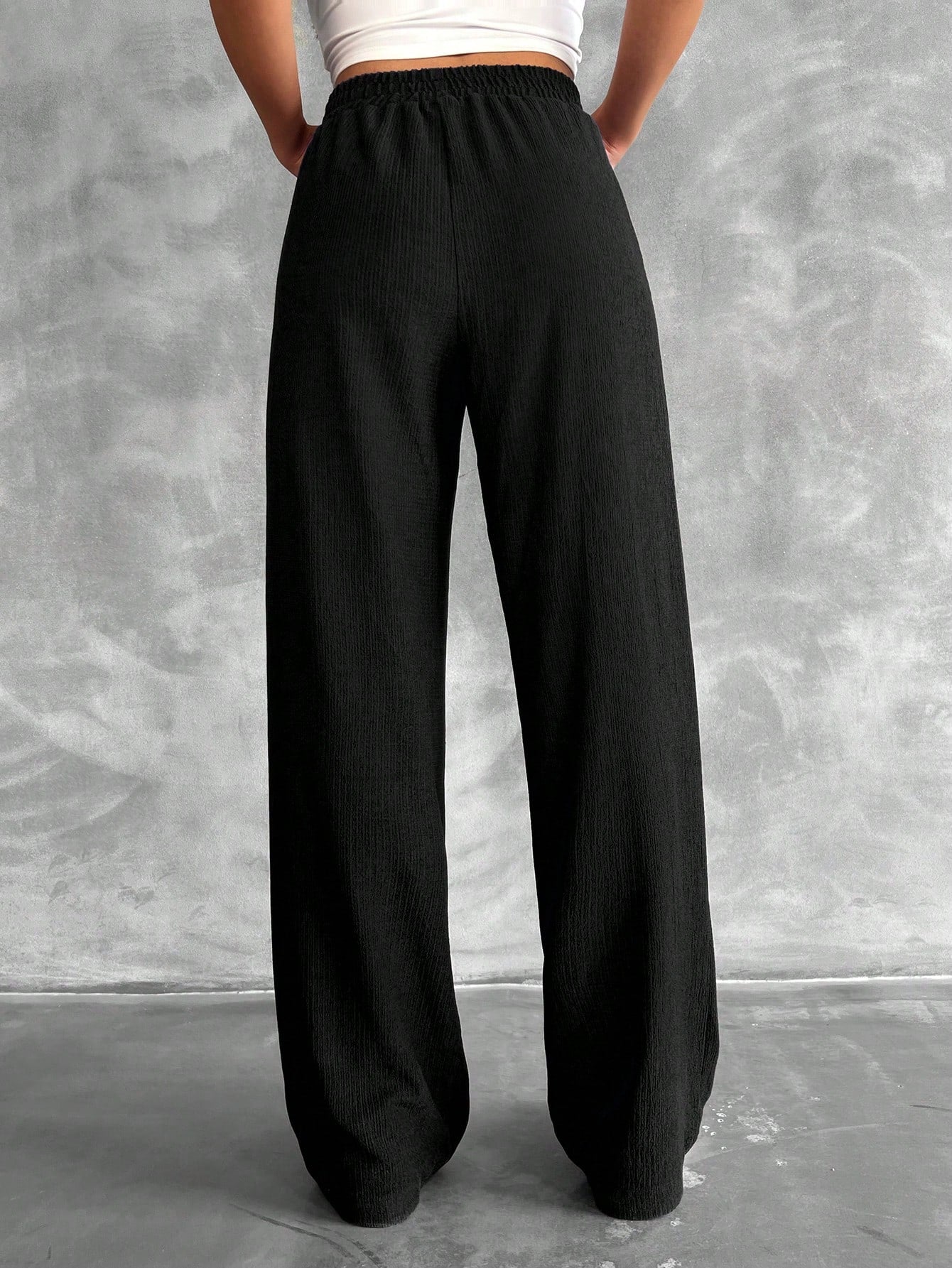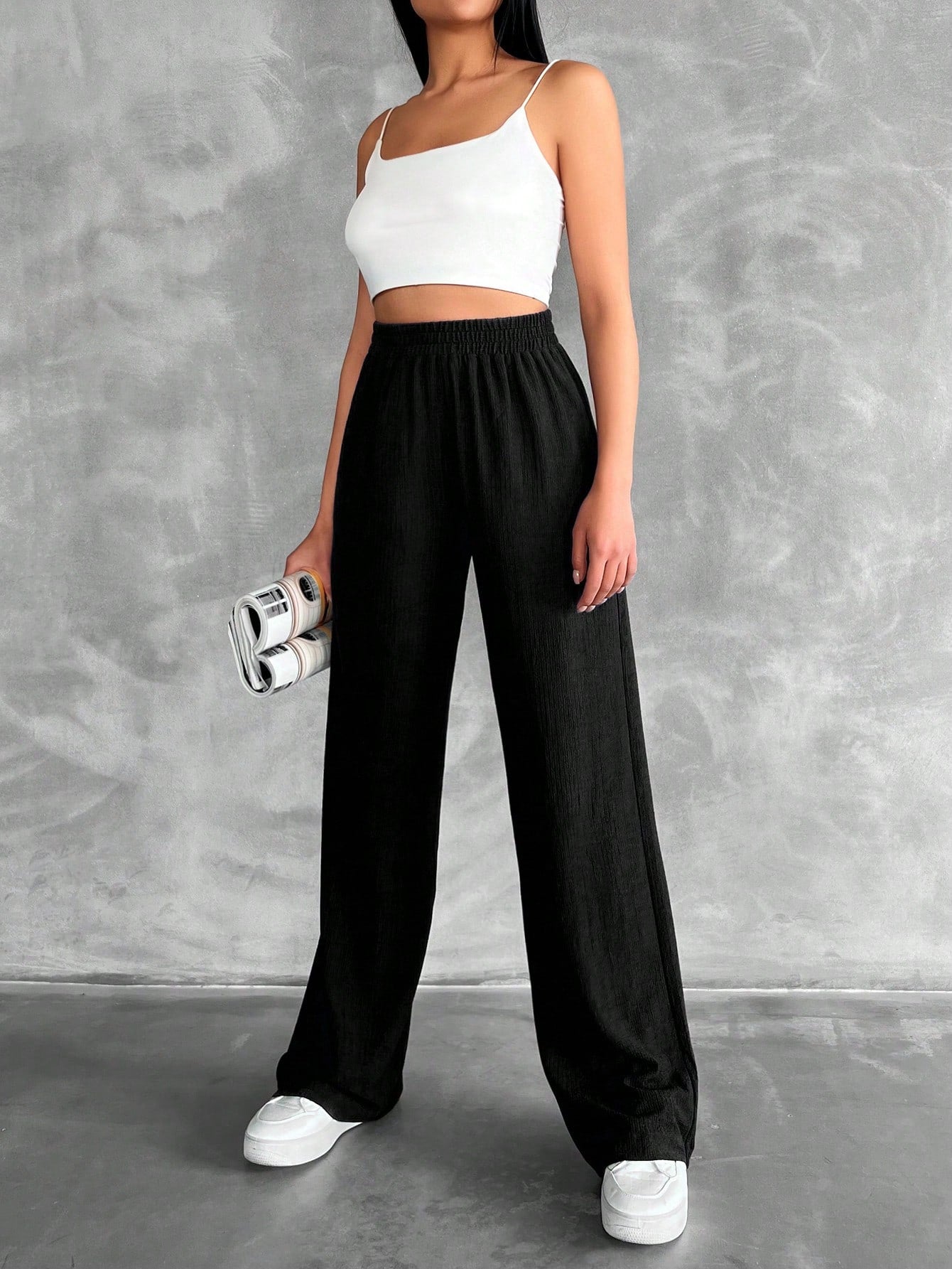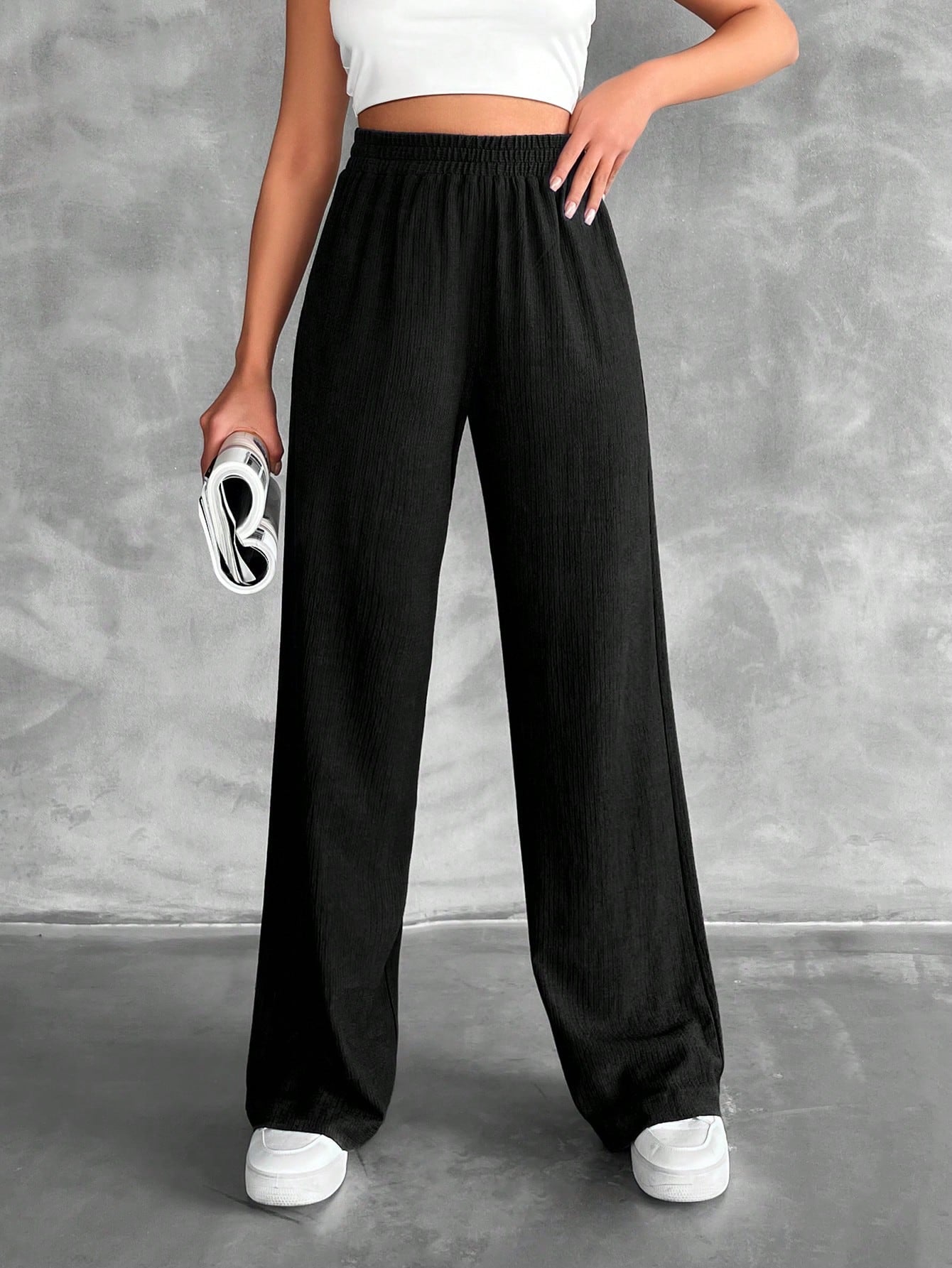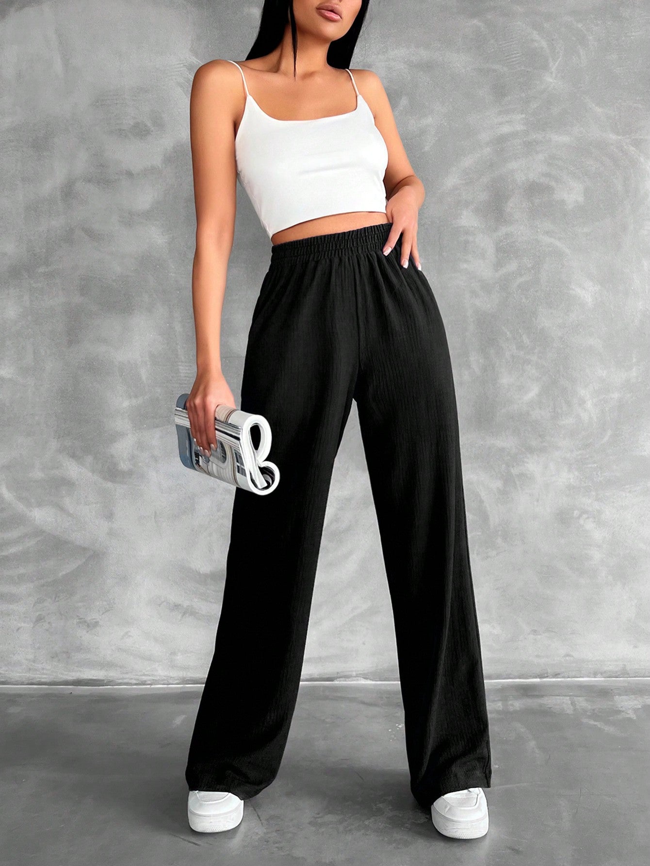 بنطال طويل القامة، بخصر مطاطي سادة وقصة مستقيمة