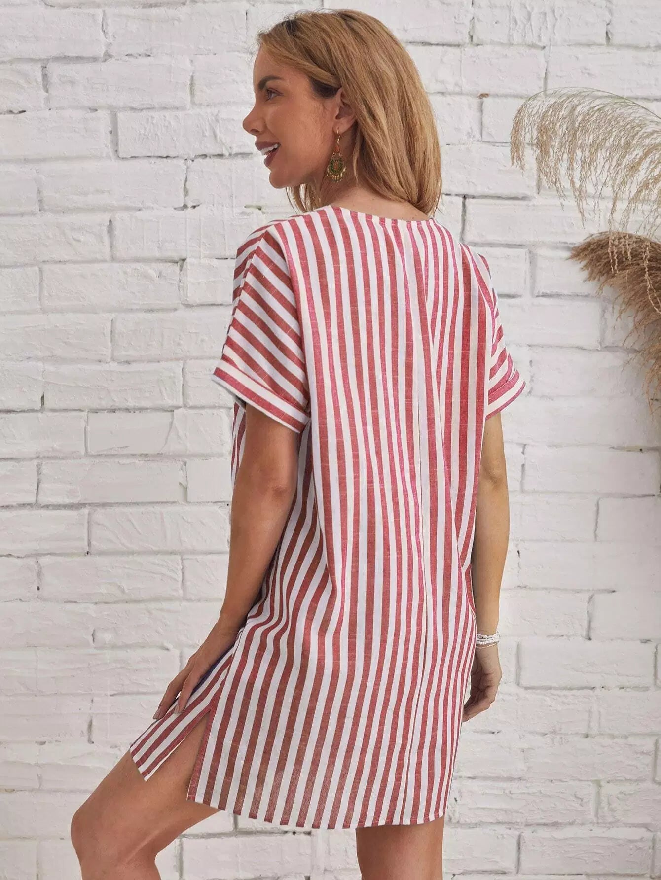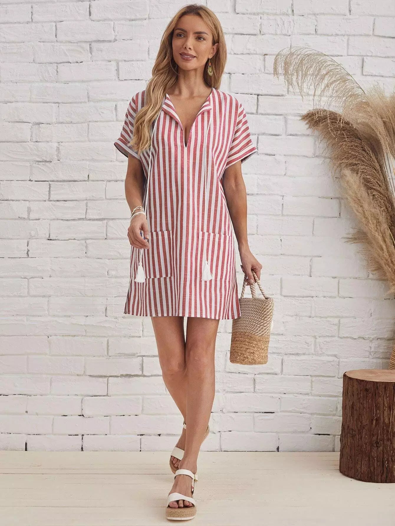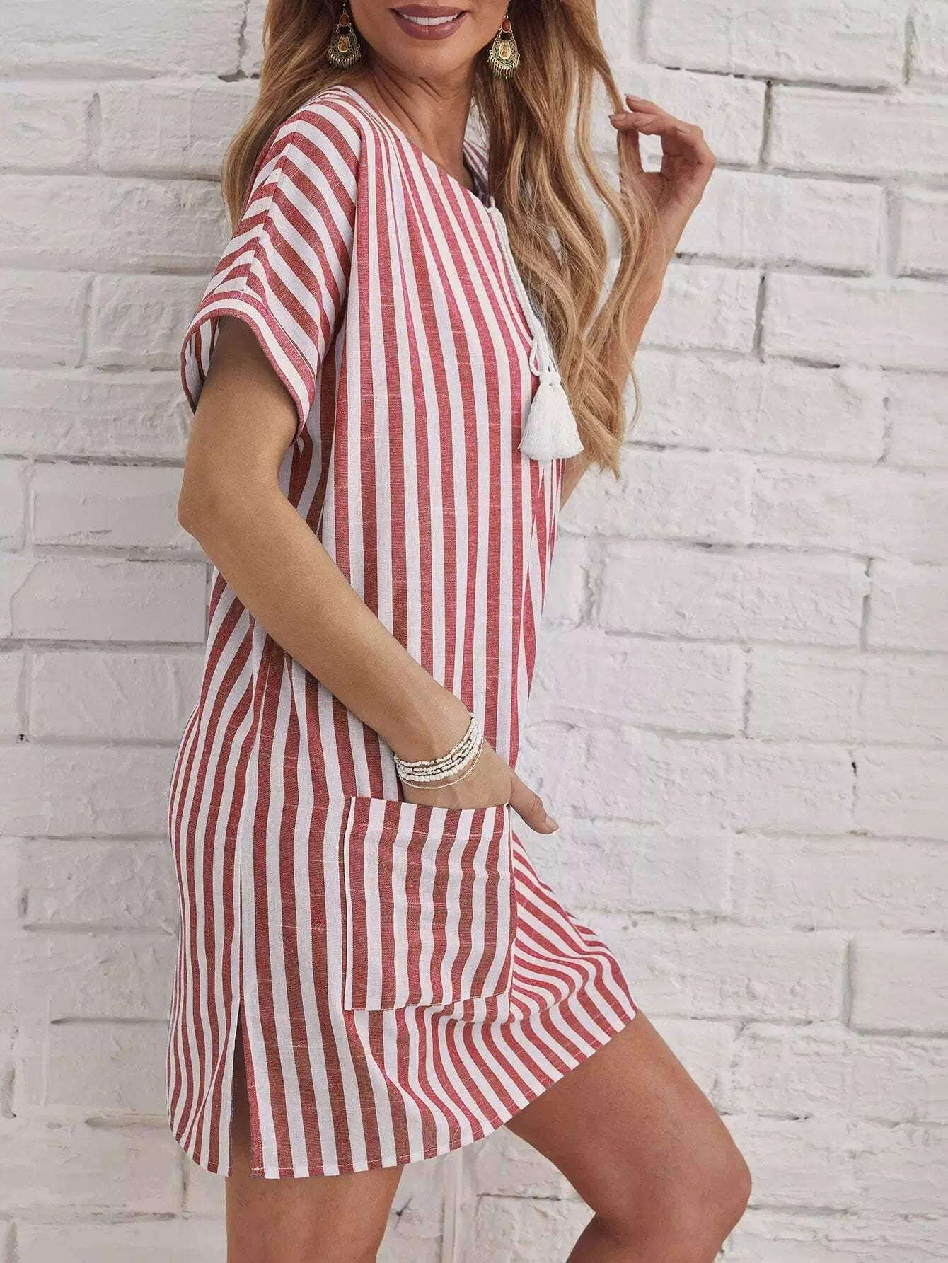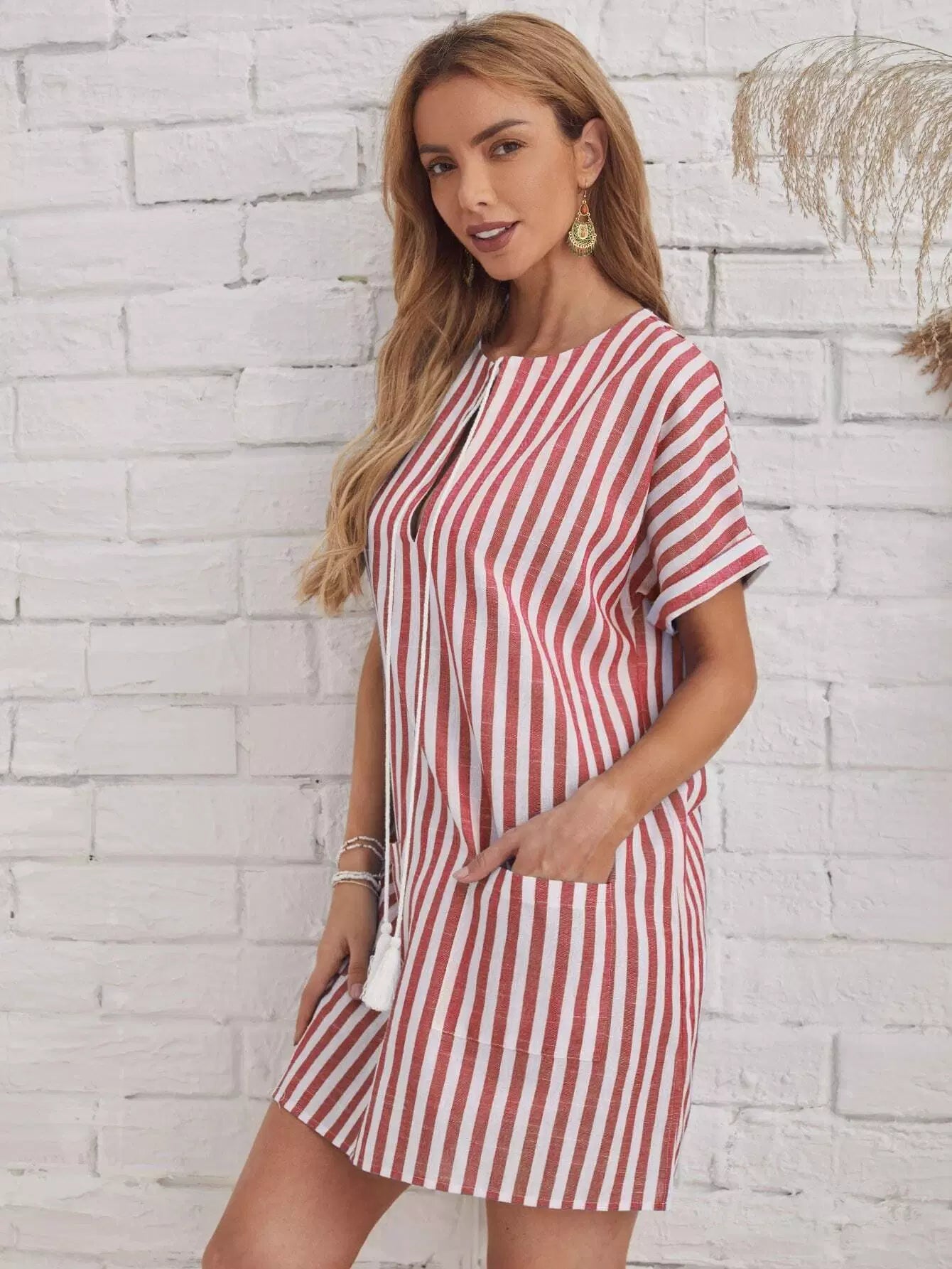 فستان مخطط برباط على الرقبة وجيب جانبي