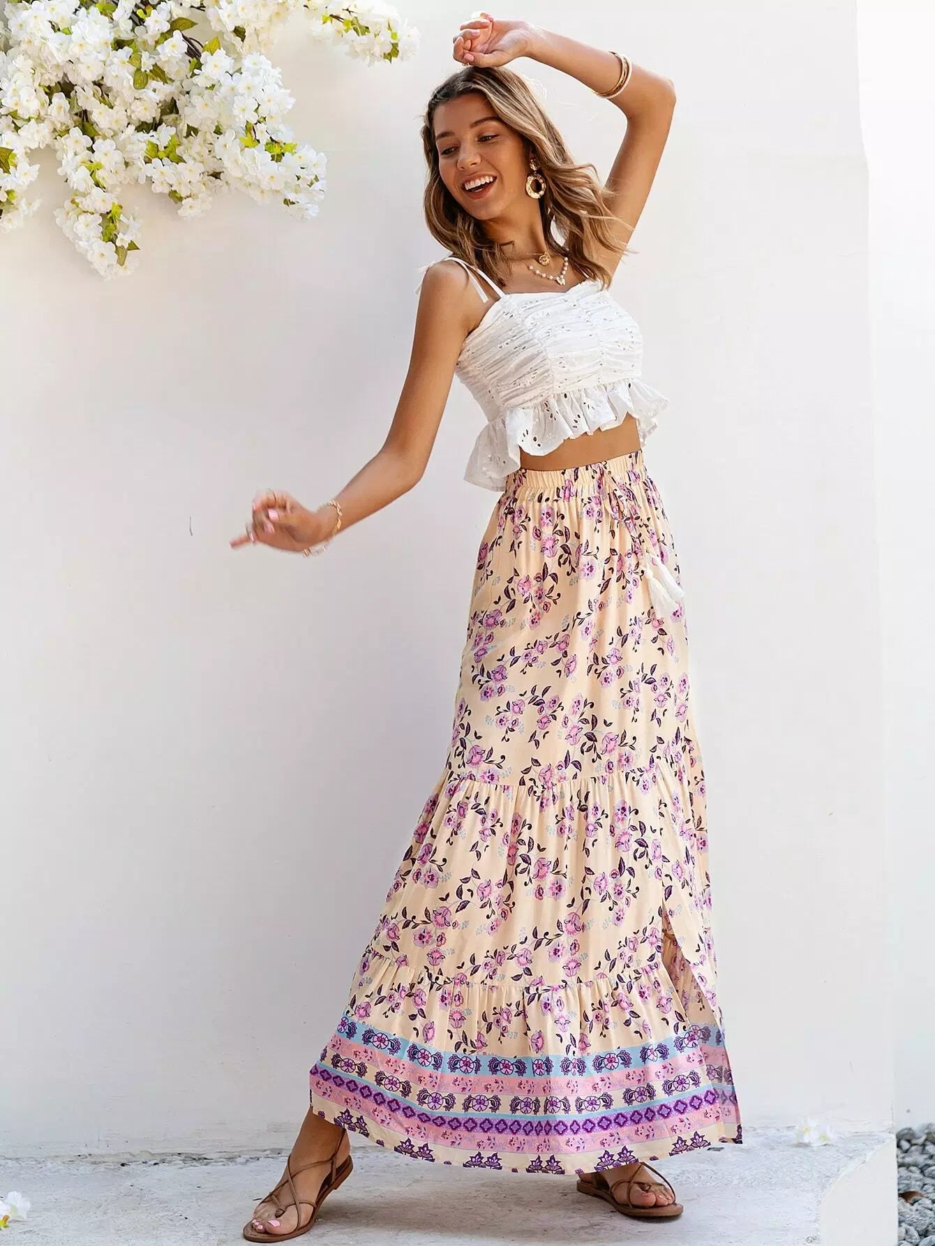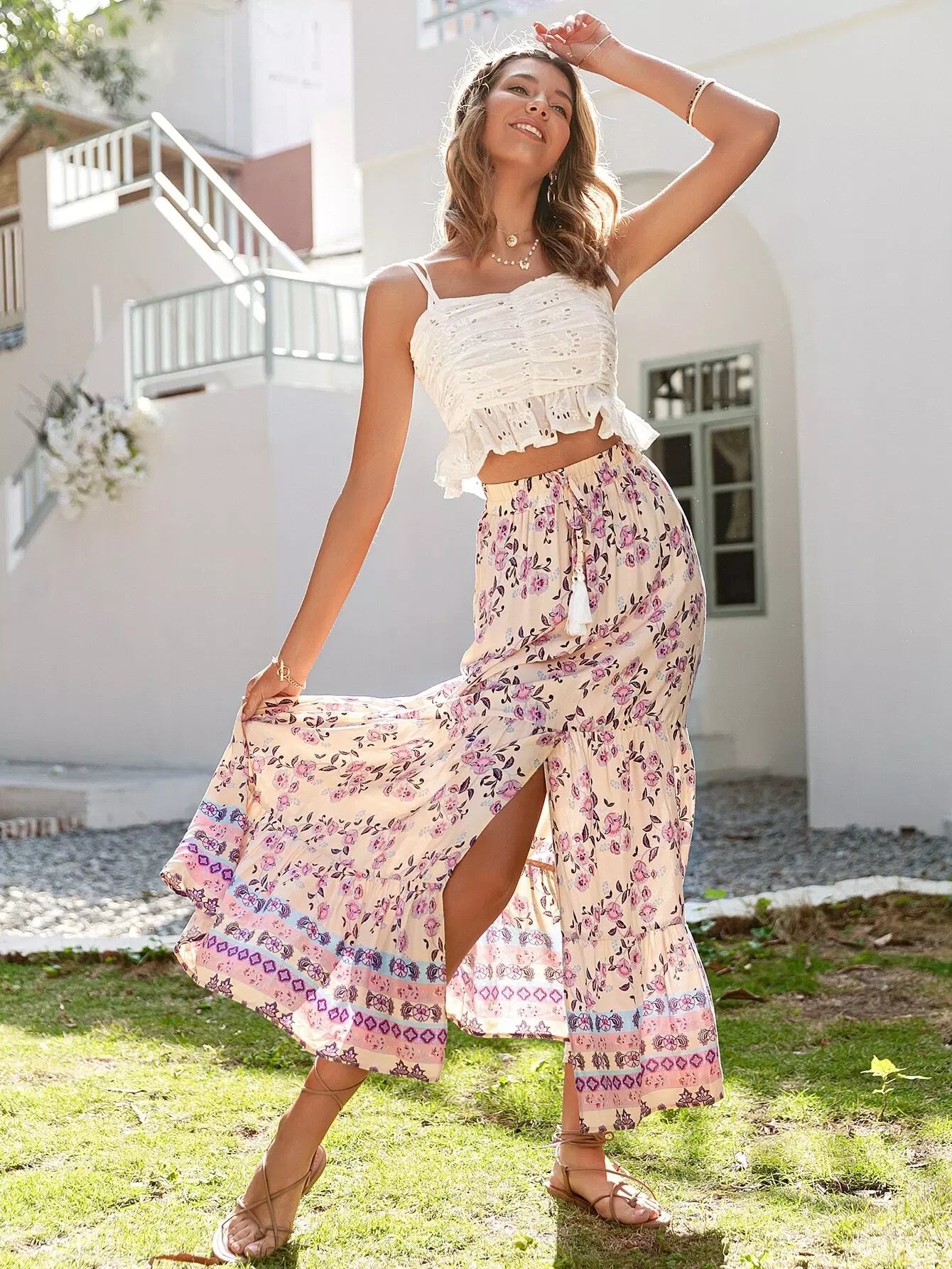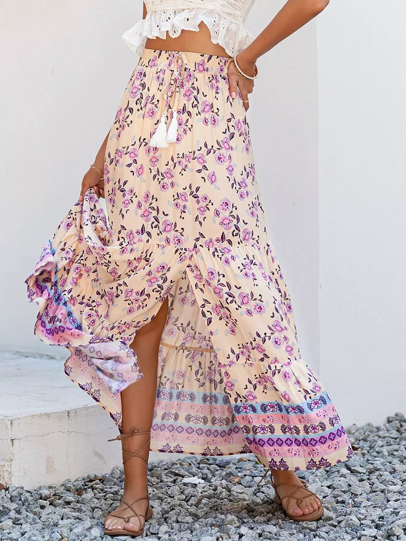 تنورة زهرية مزينة بشرابة بربطة خصر مشقوقة بحاشية كشكش