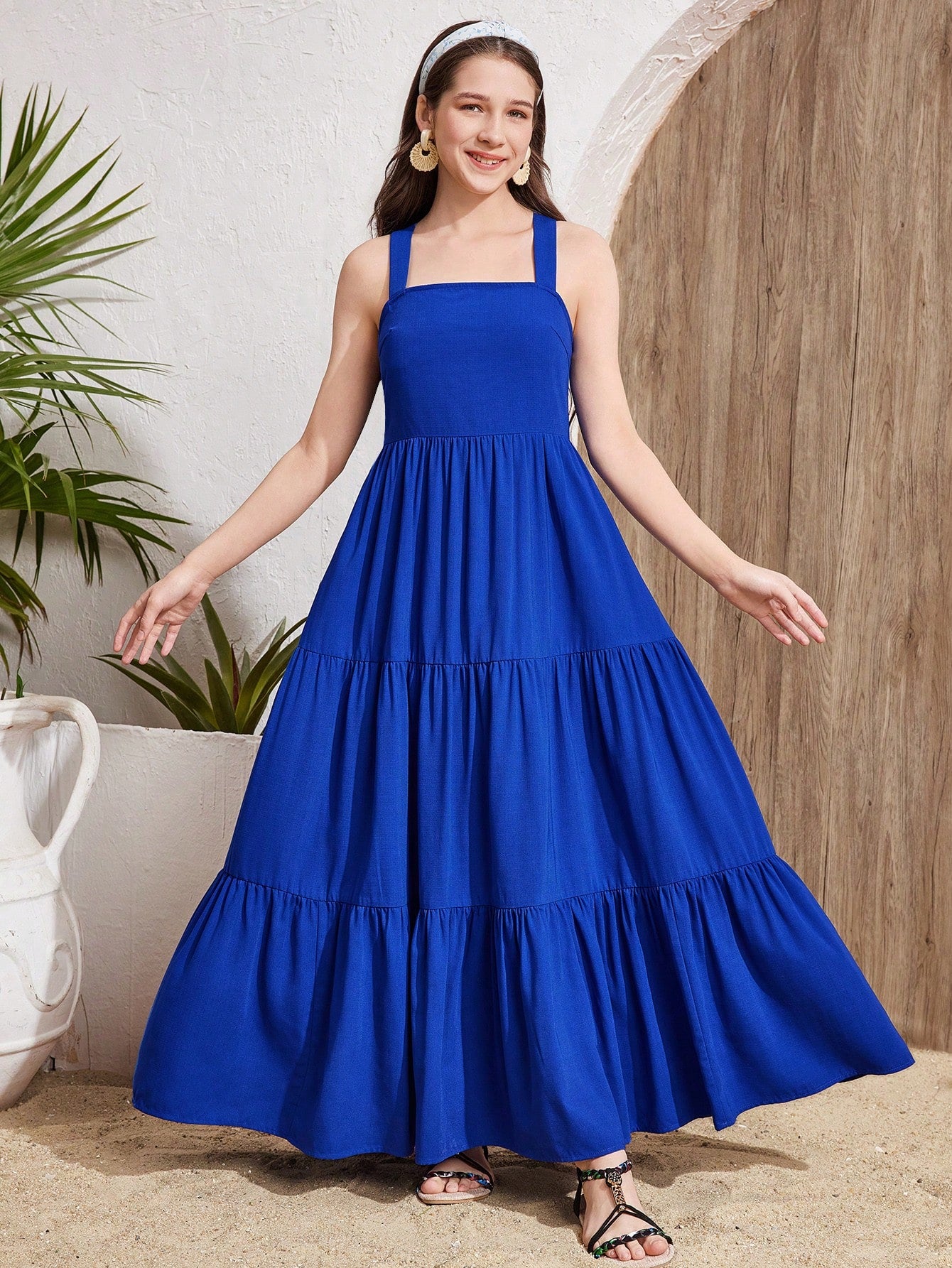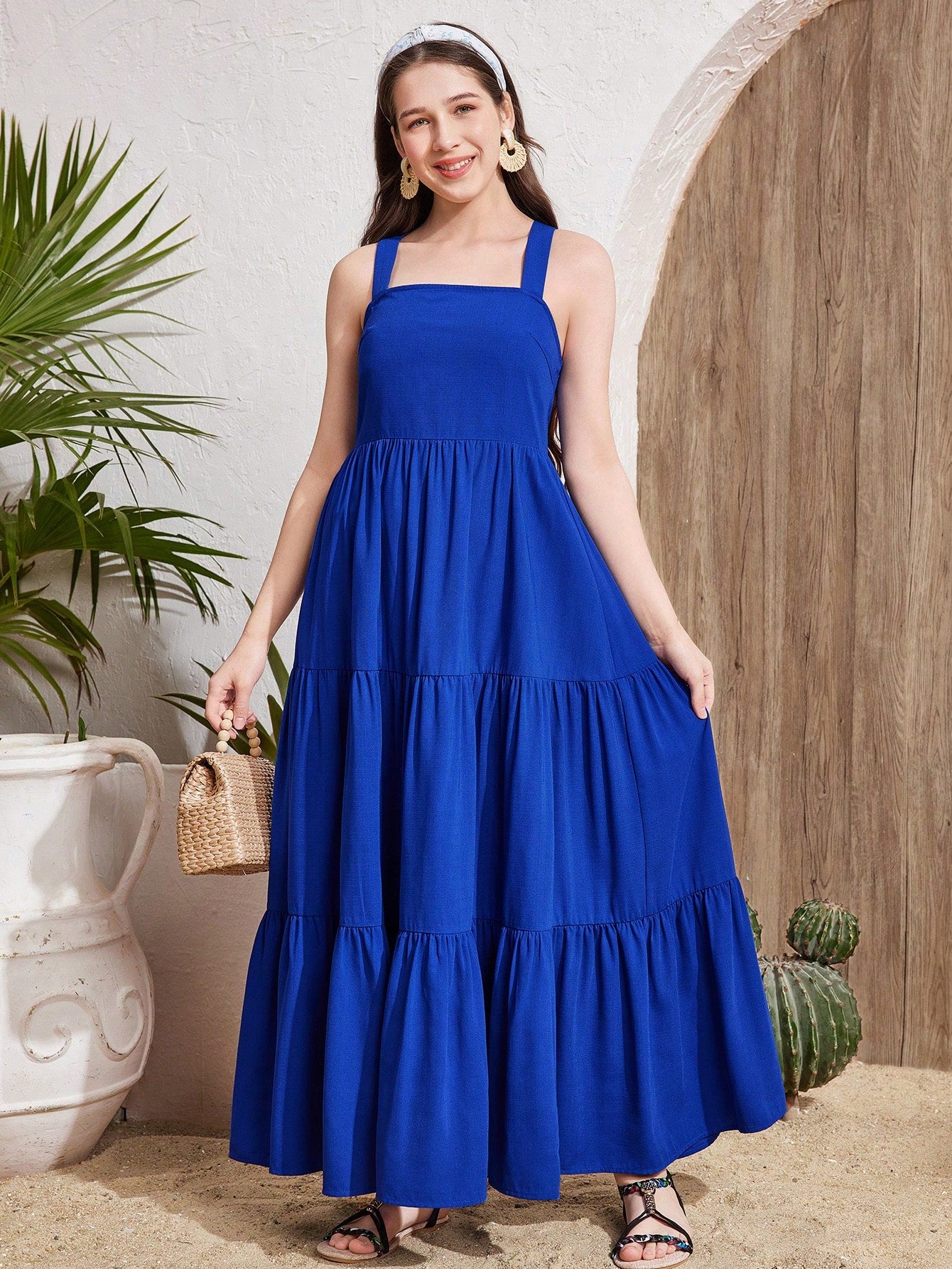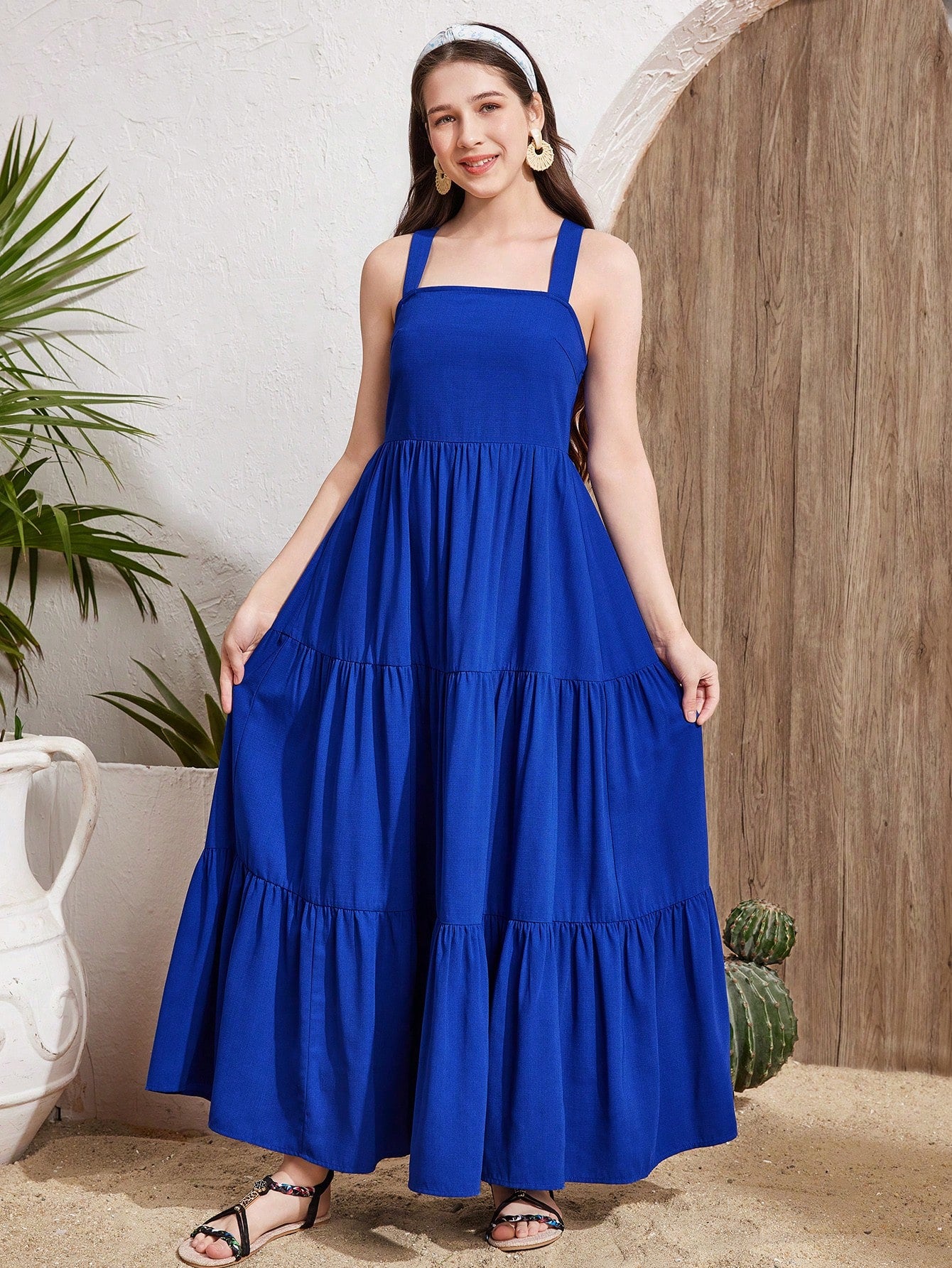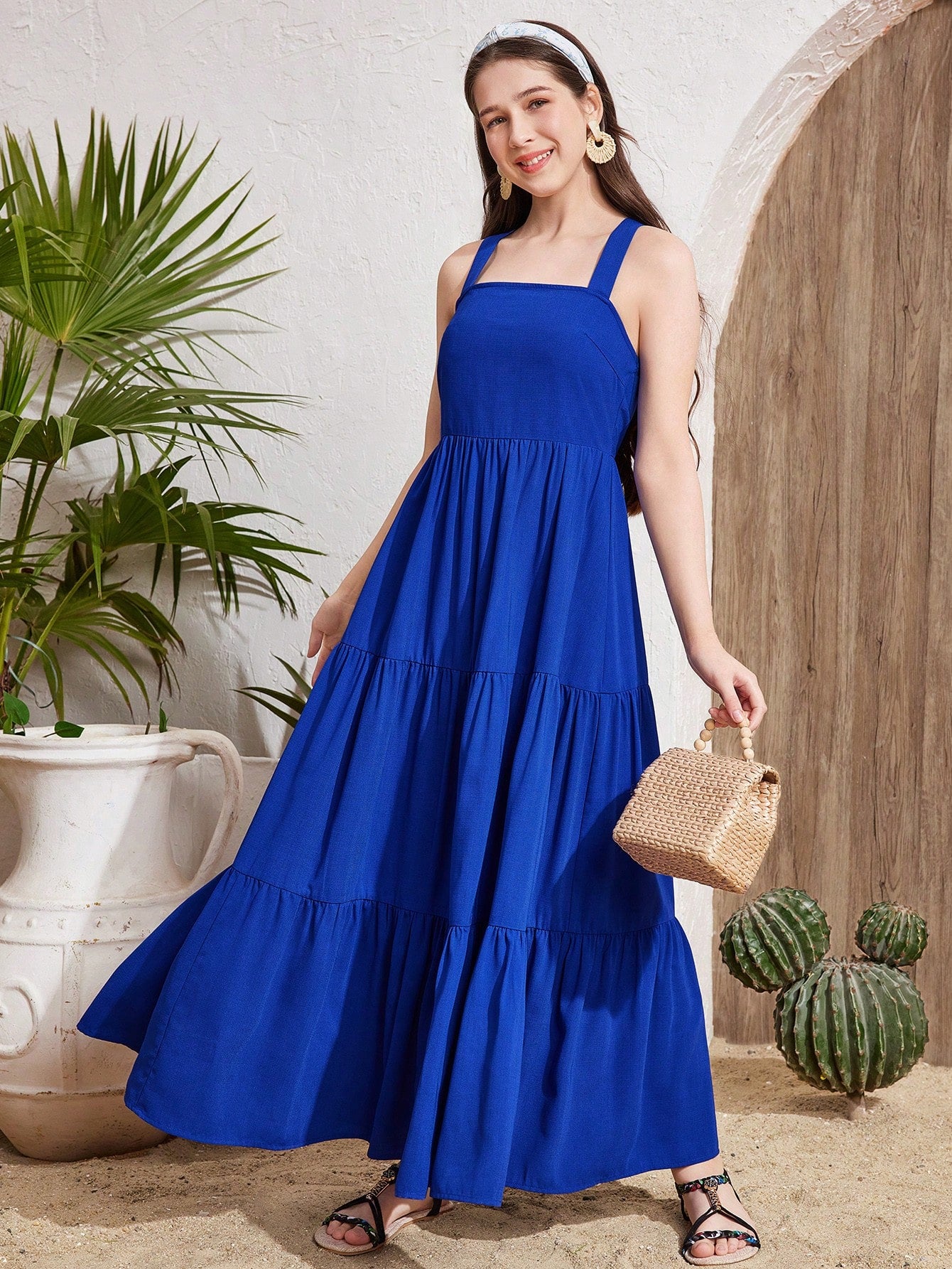 Teen Girls' Casual Vacation Wide-Flare Ruched Spaghetti Strap Crisscross Back Dress