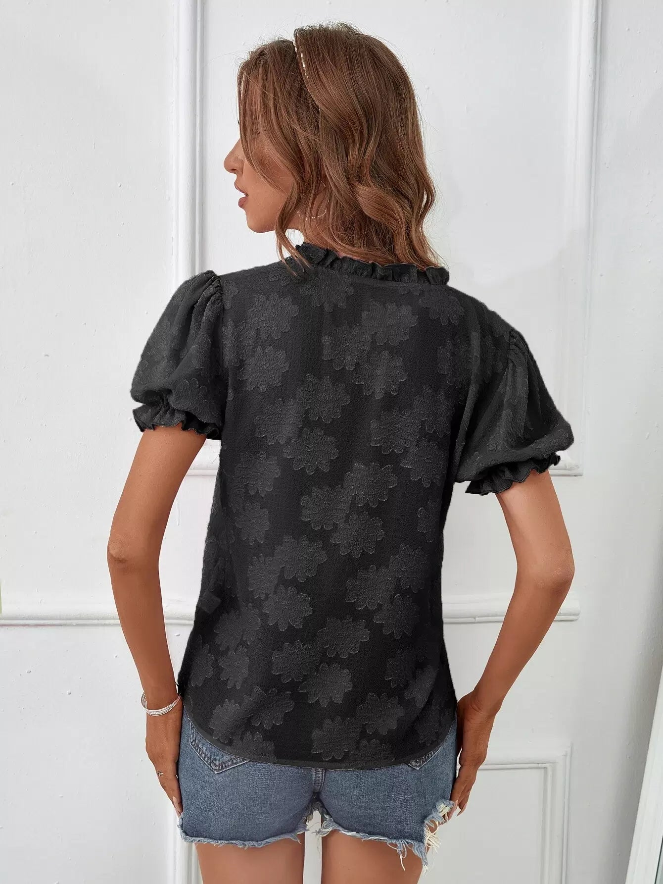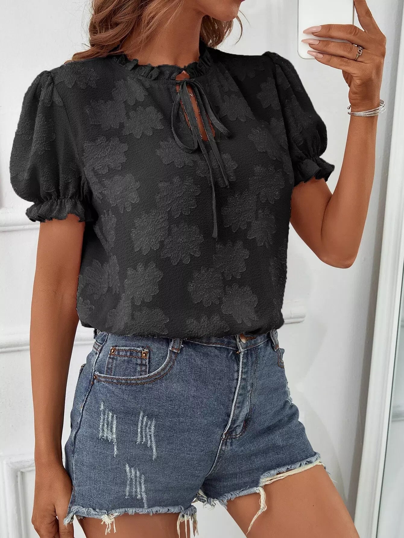بلوزة ذات رباط حول الرقبة وأكمام منفوخة ومزخرفة