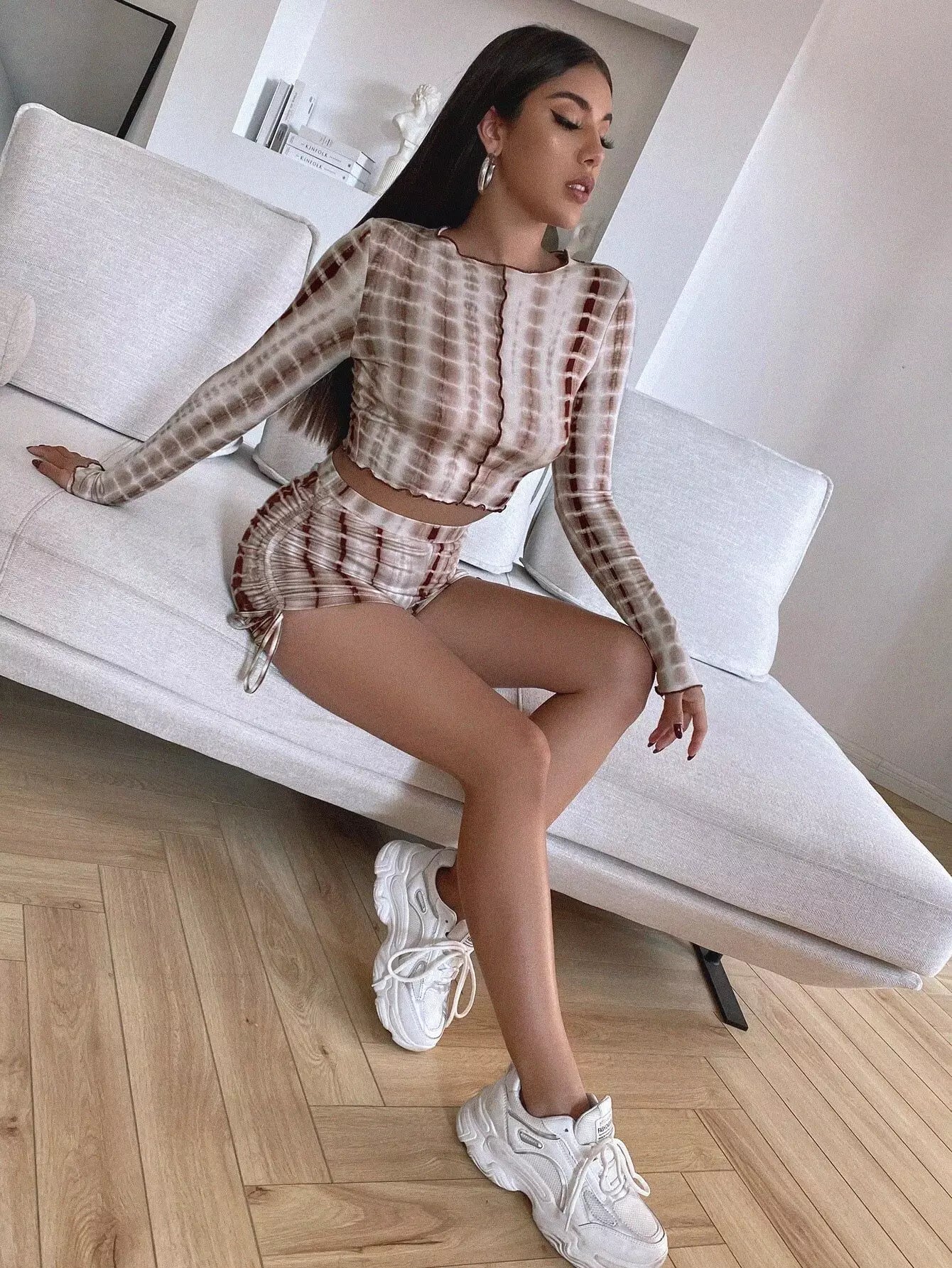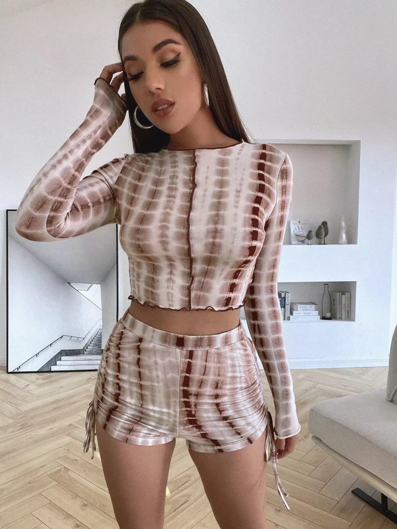 طقم بلوزة قصيرة مزينة بنقشة الخس وشورت جانبي مكشكش برباط سحب