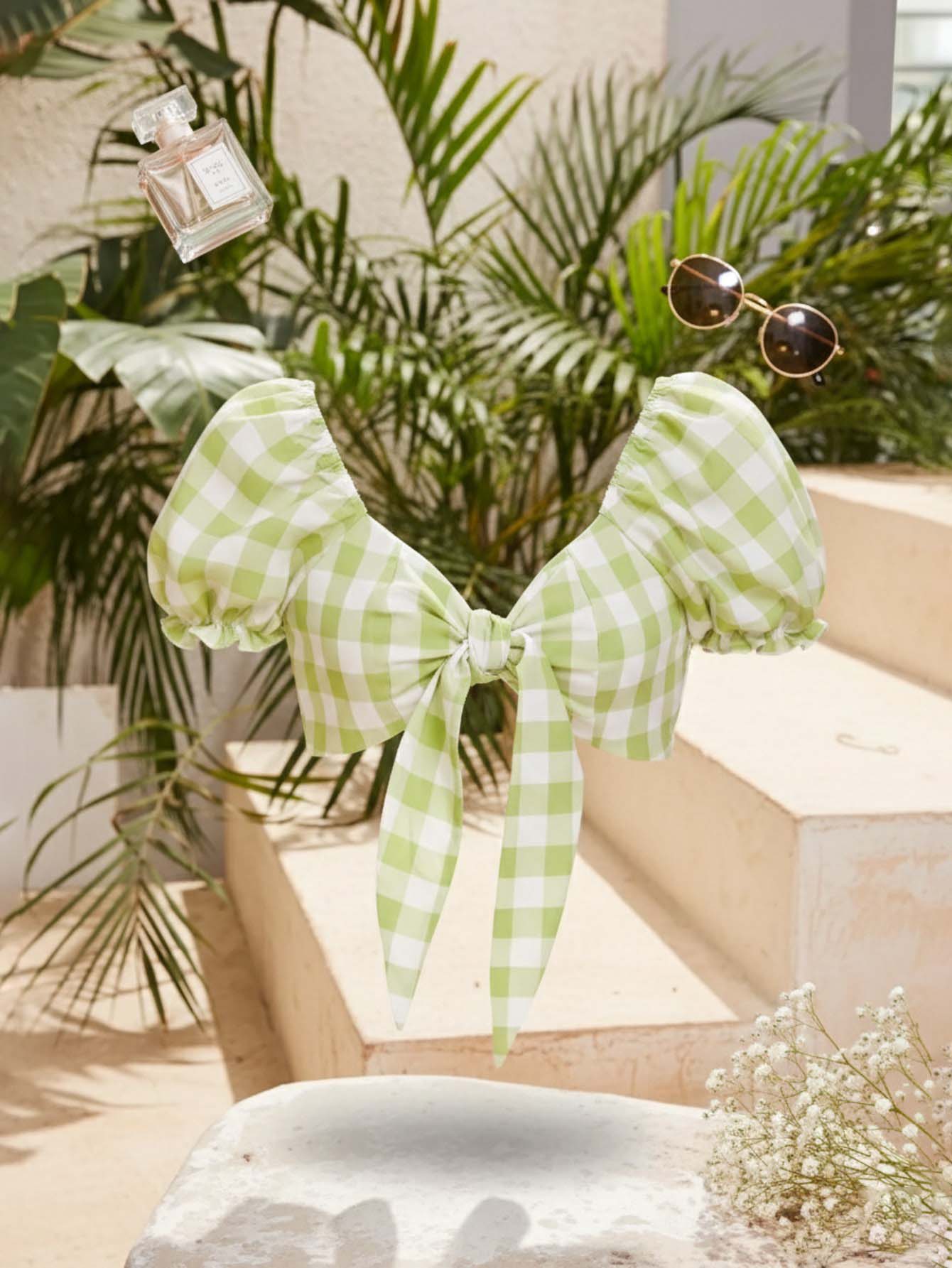 بلوزة قطنية قطنية بأكمام منفوشة من الأمام بربطة عنق ومنفوخة من الأمام وشيرد من الخلف