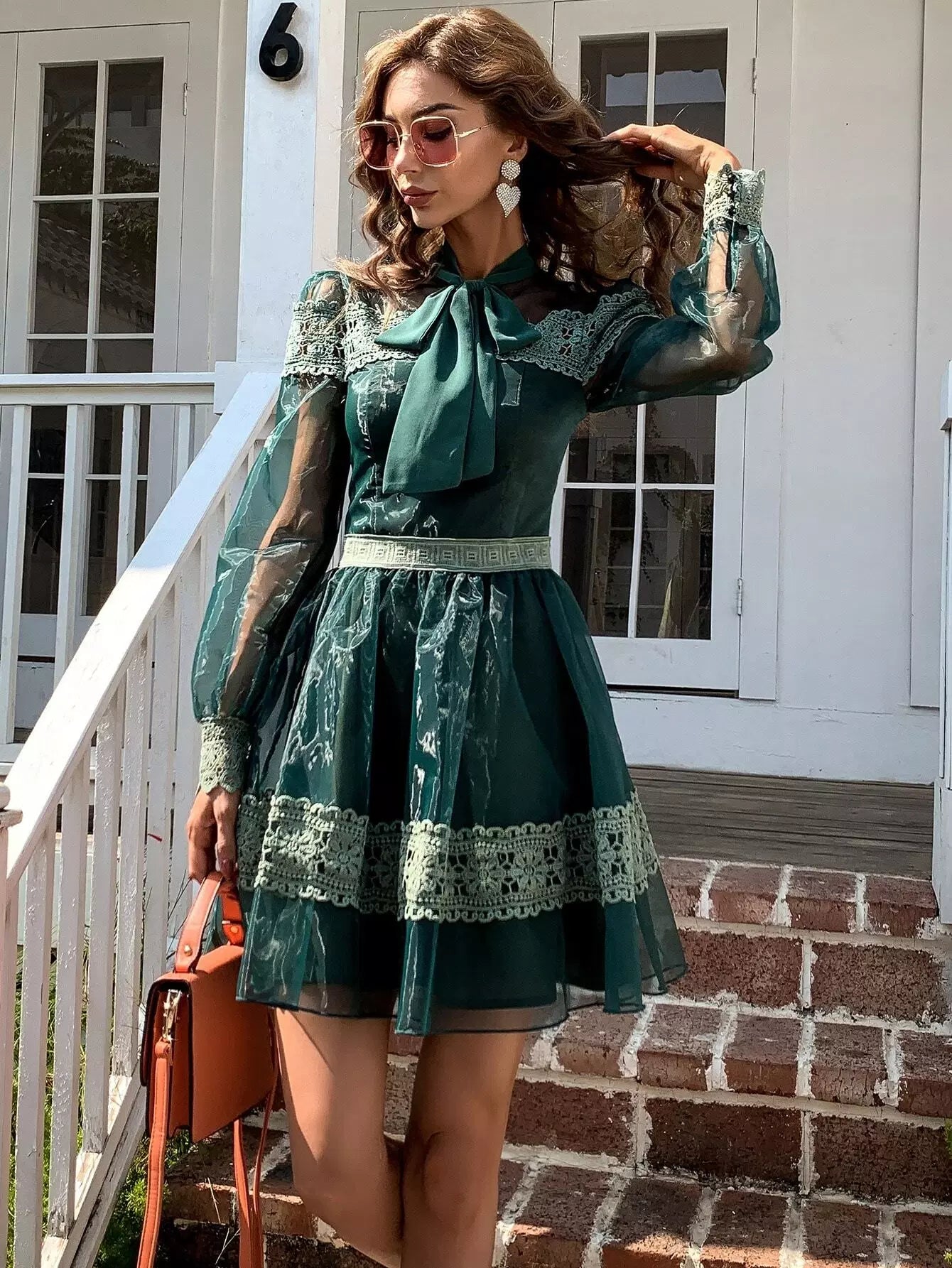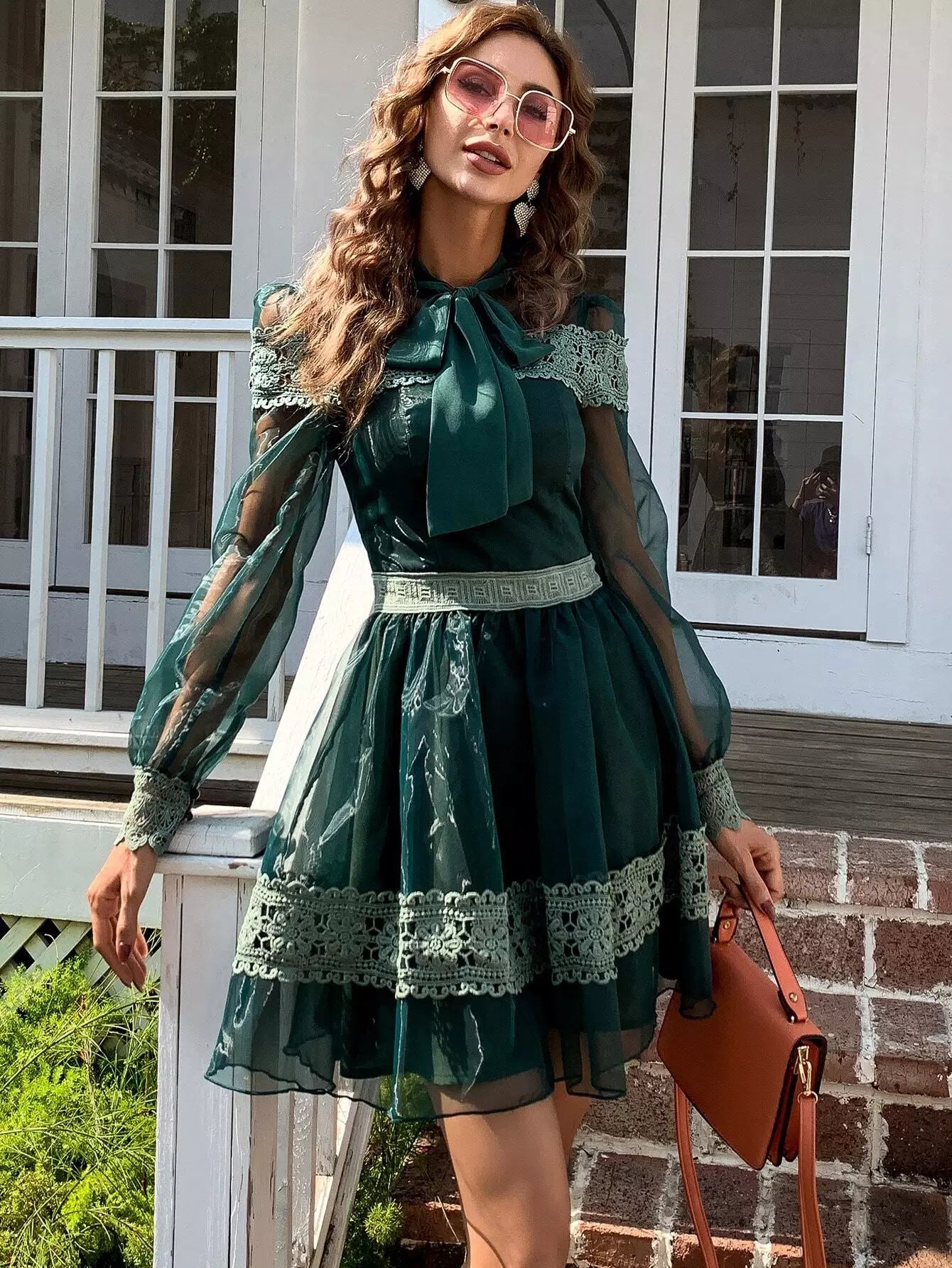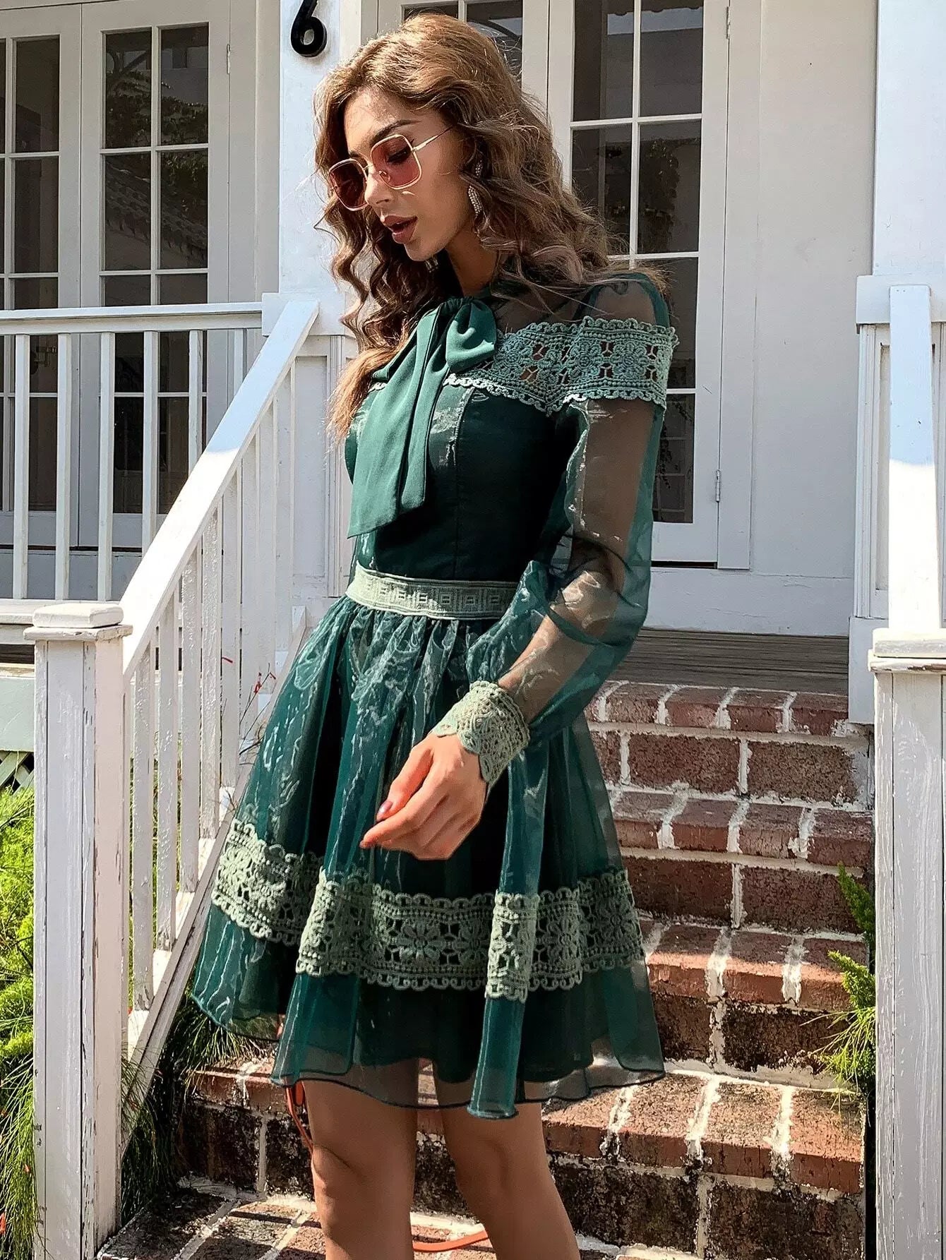فستان من الدانتيل المخرّم بربطة عنق من الدانتيل المخرّم المداخل من الأورجانزا