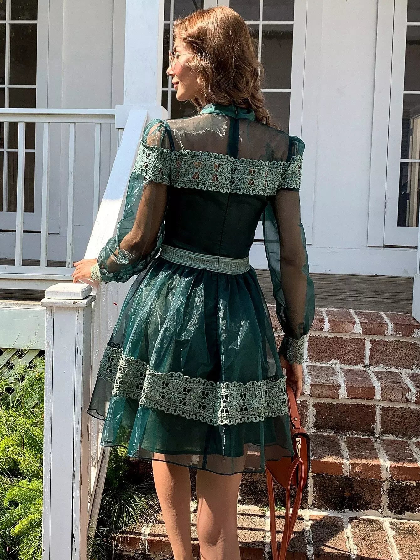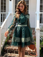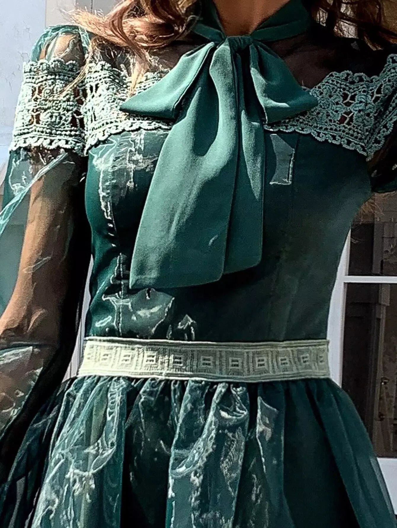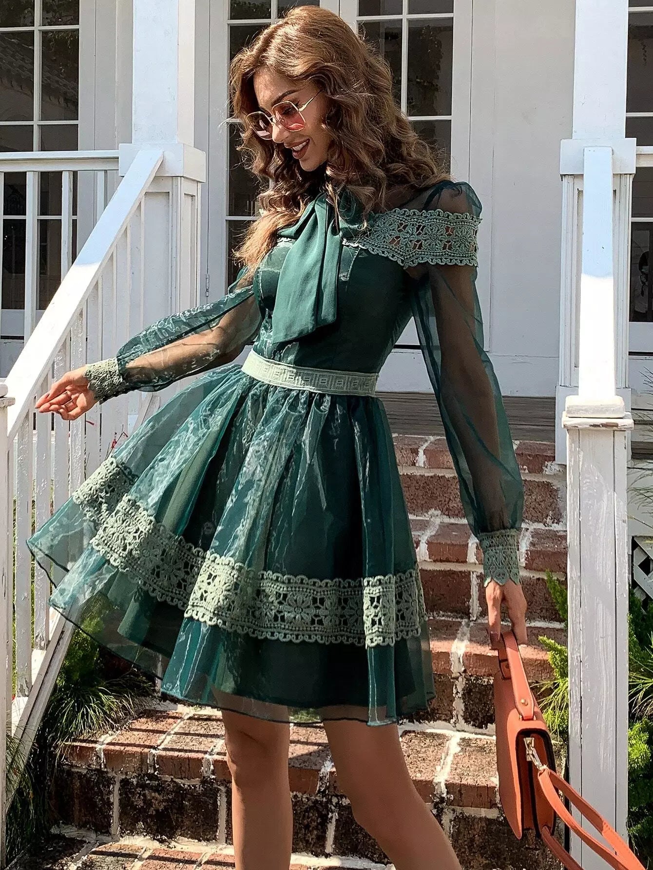 فستان من الدانتيل المخرّم بربطة عنق من الدانتيل المخرّم المداخل من الأورجانزا