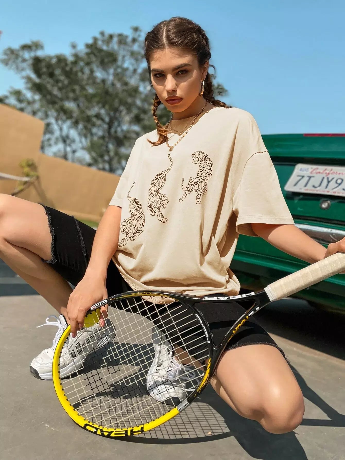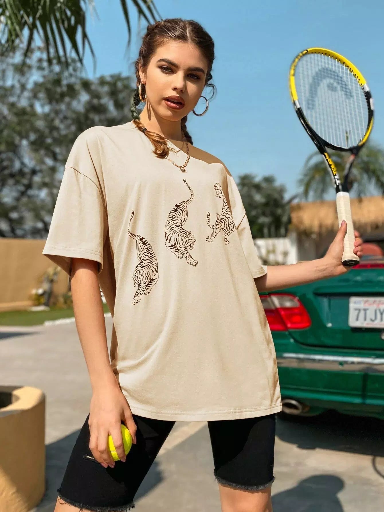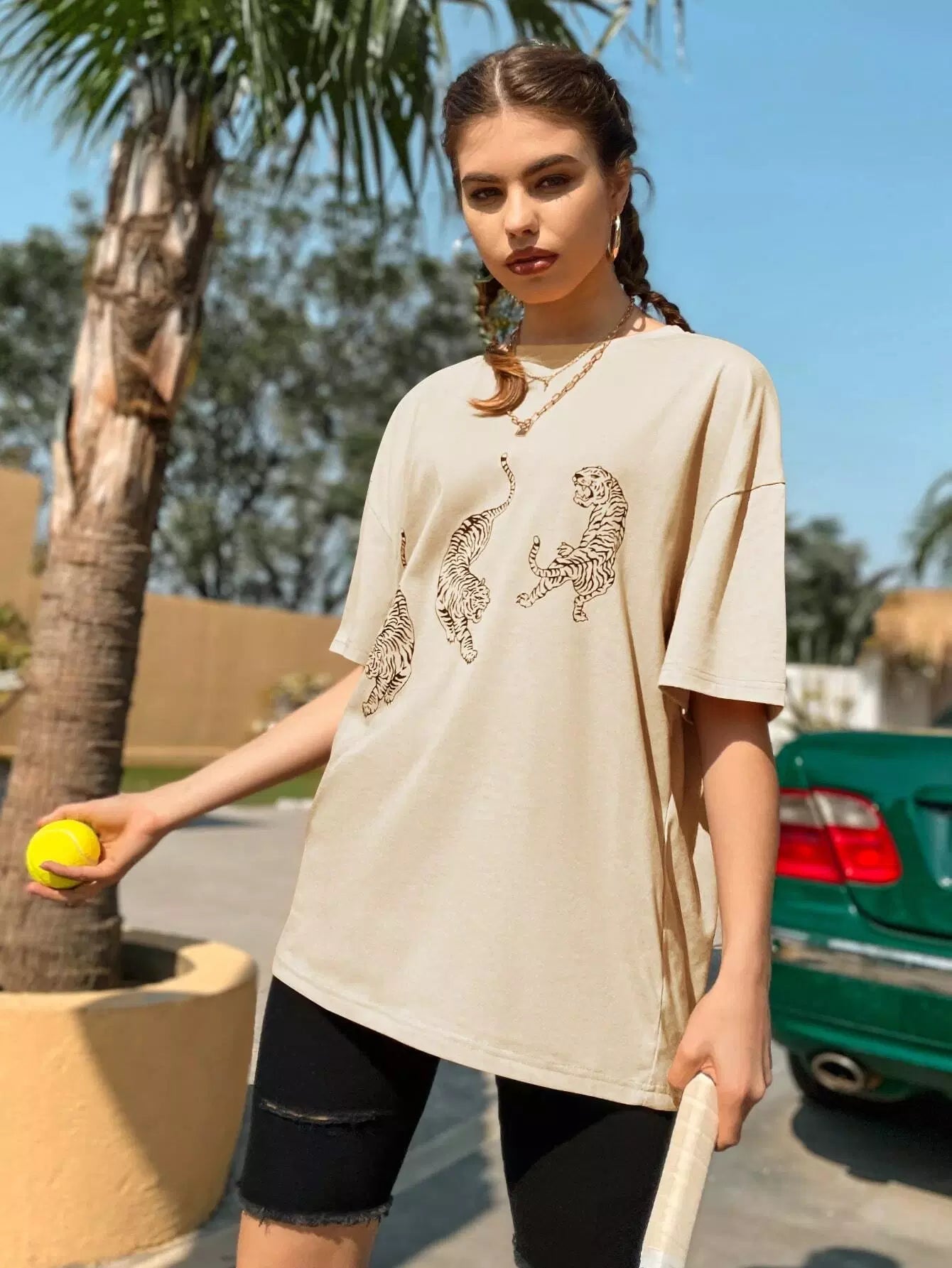 تي شيرت بأكتاف منسدلة بطبعة نمر