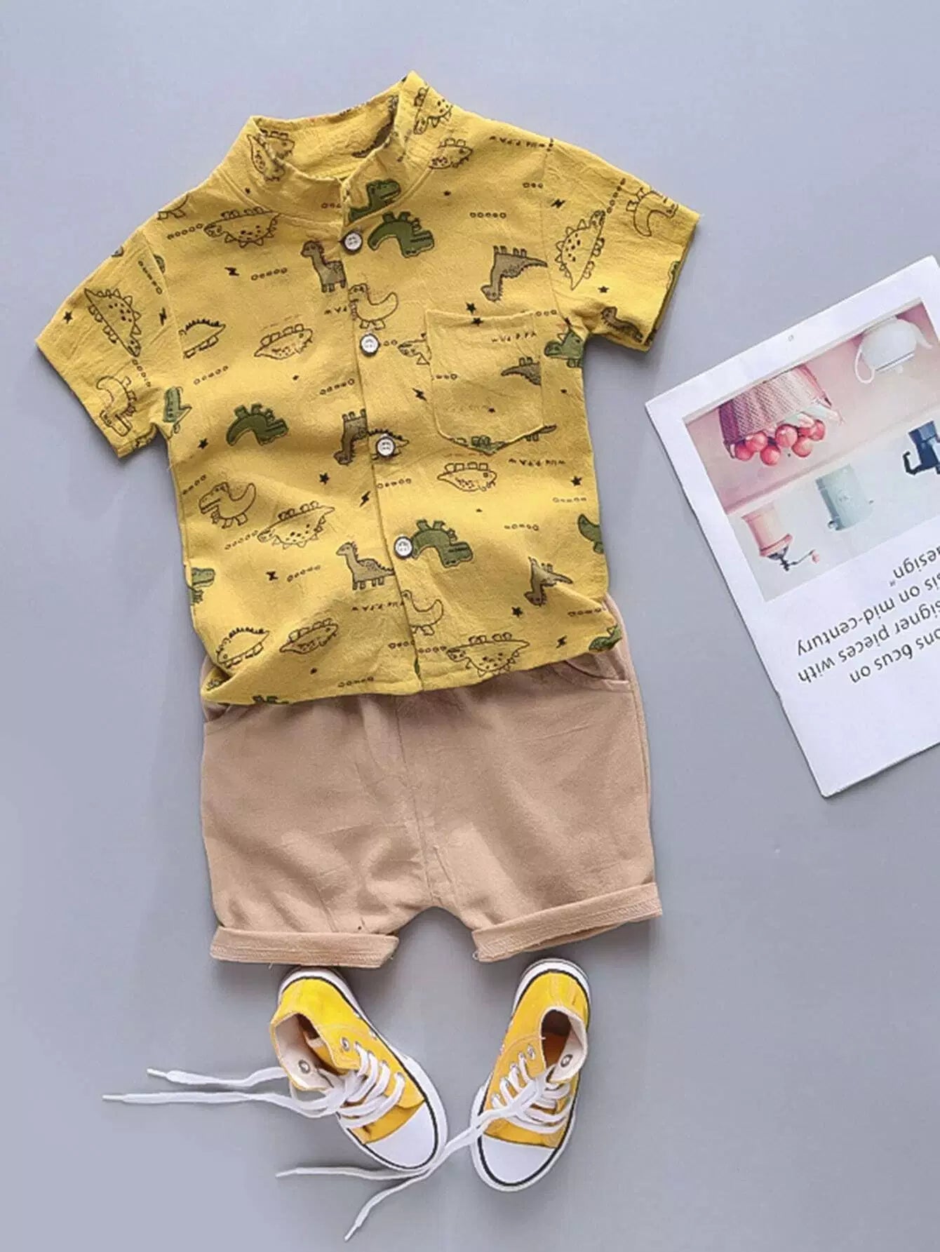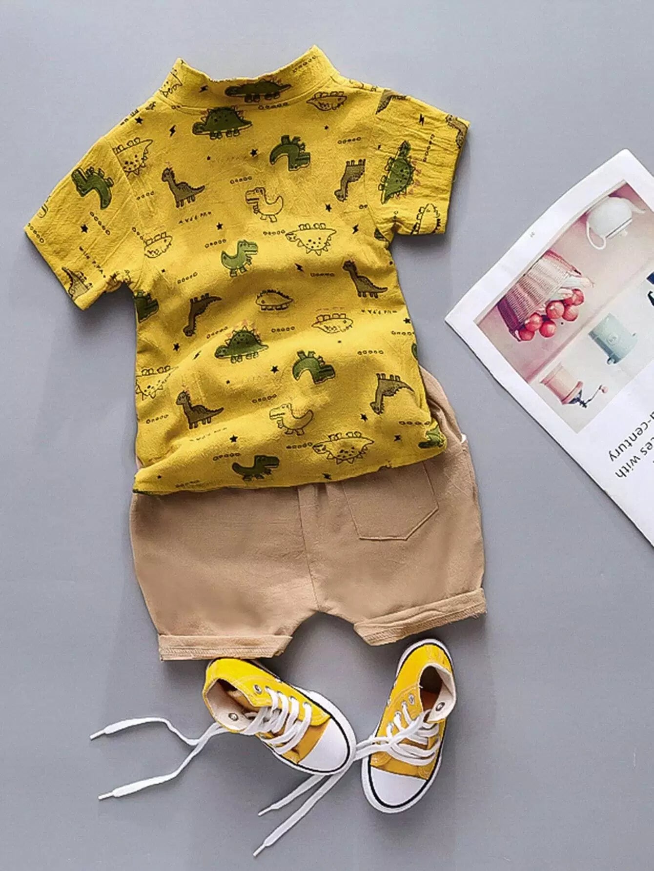 قميص طفل صغير مطبوع عليه رسوم كرتونية وجغرافية مع شورت