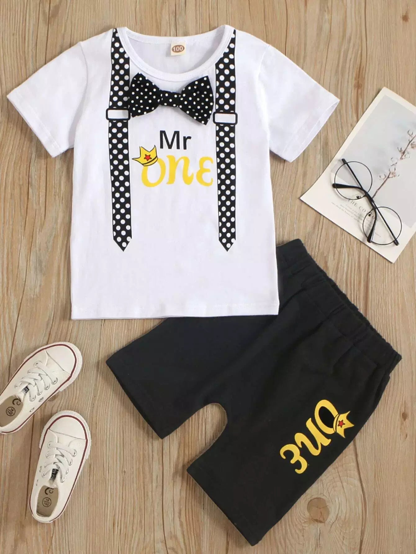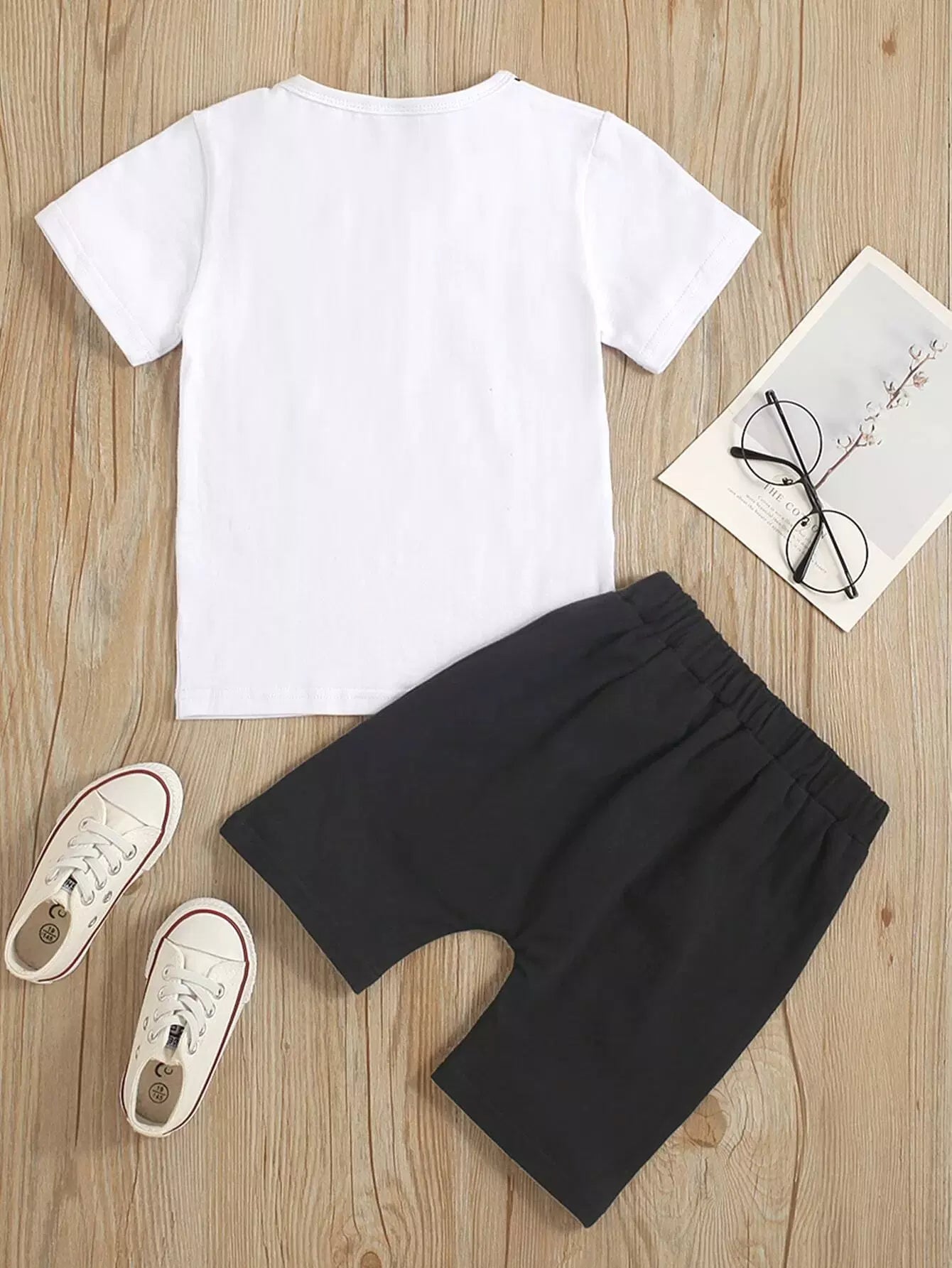 تي شيرت برسومات على شكل حرف للأولاد الصغار مع شورت قصير أمامي بعقدة