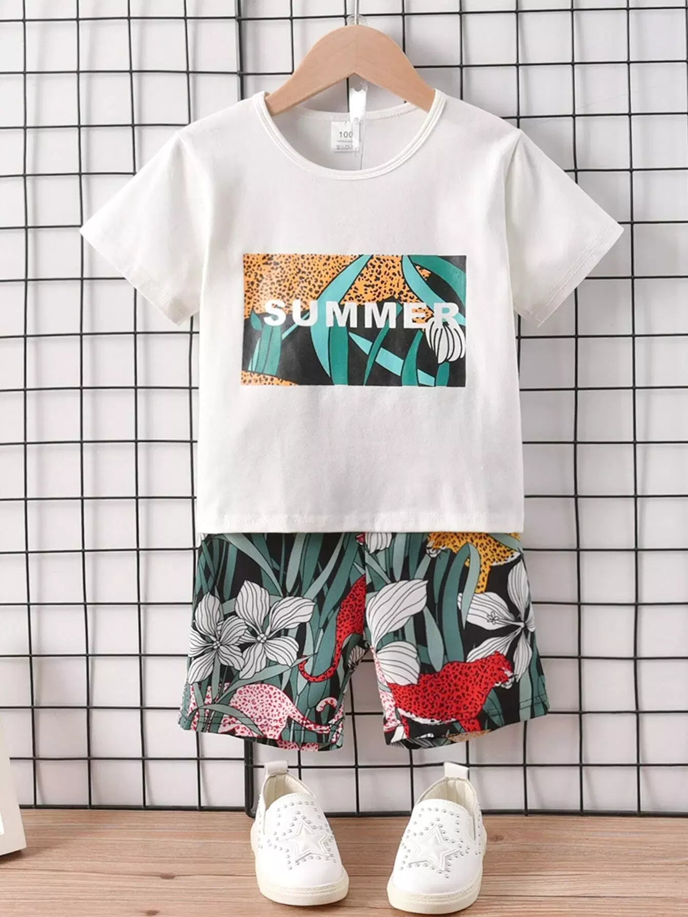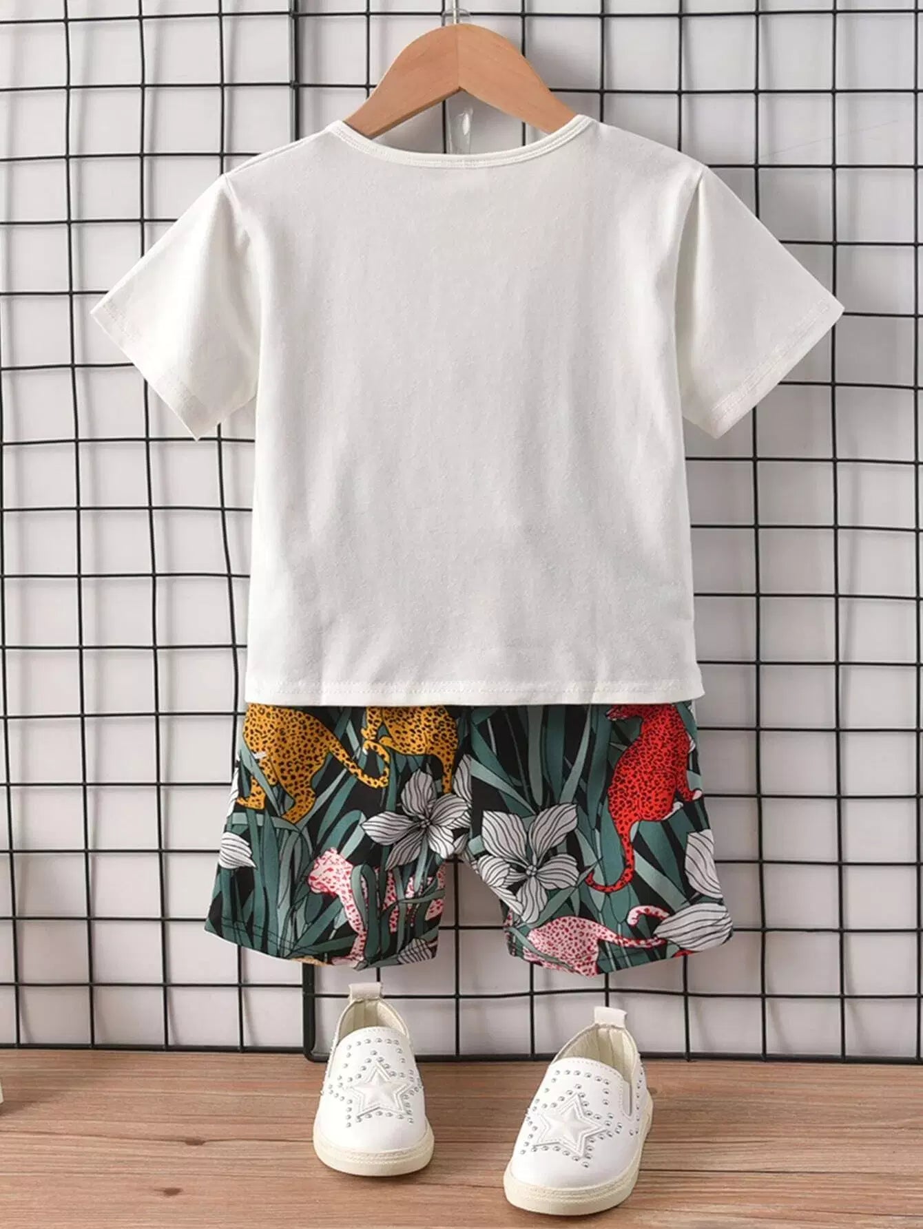 تي شيرت برسوم حروف للأولاد الصغار مع شورت بطبعة استوائية