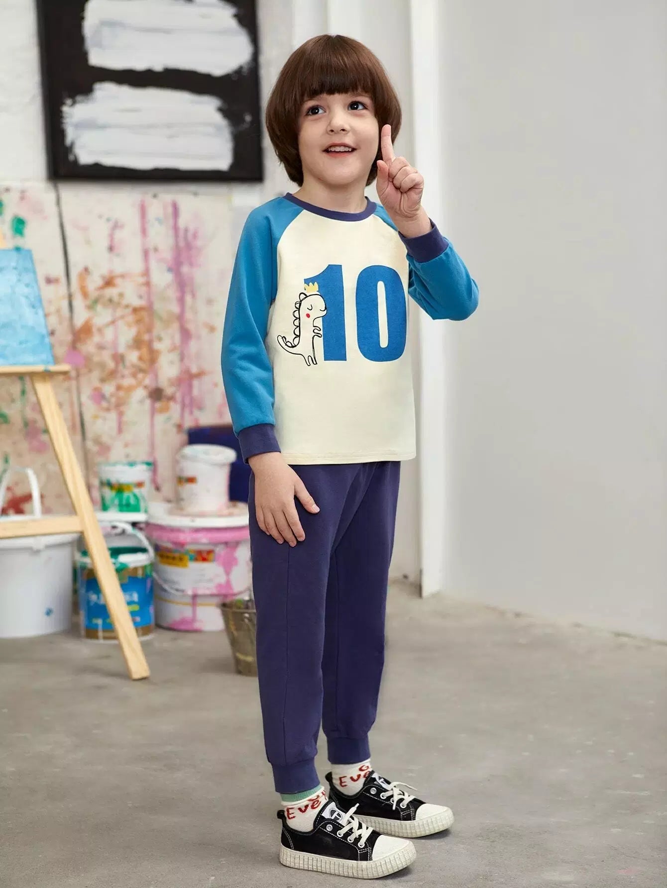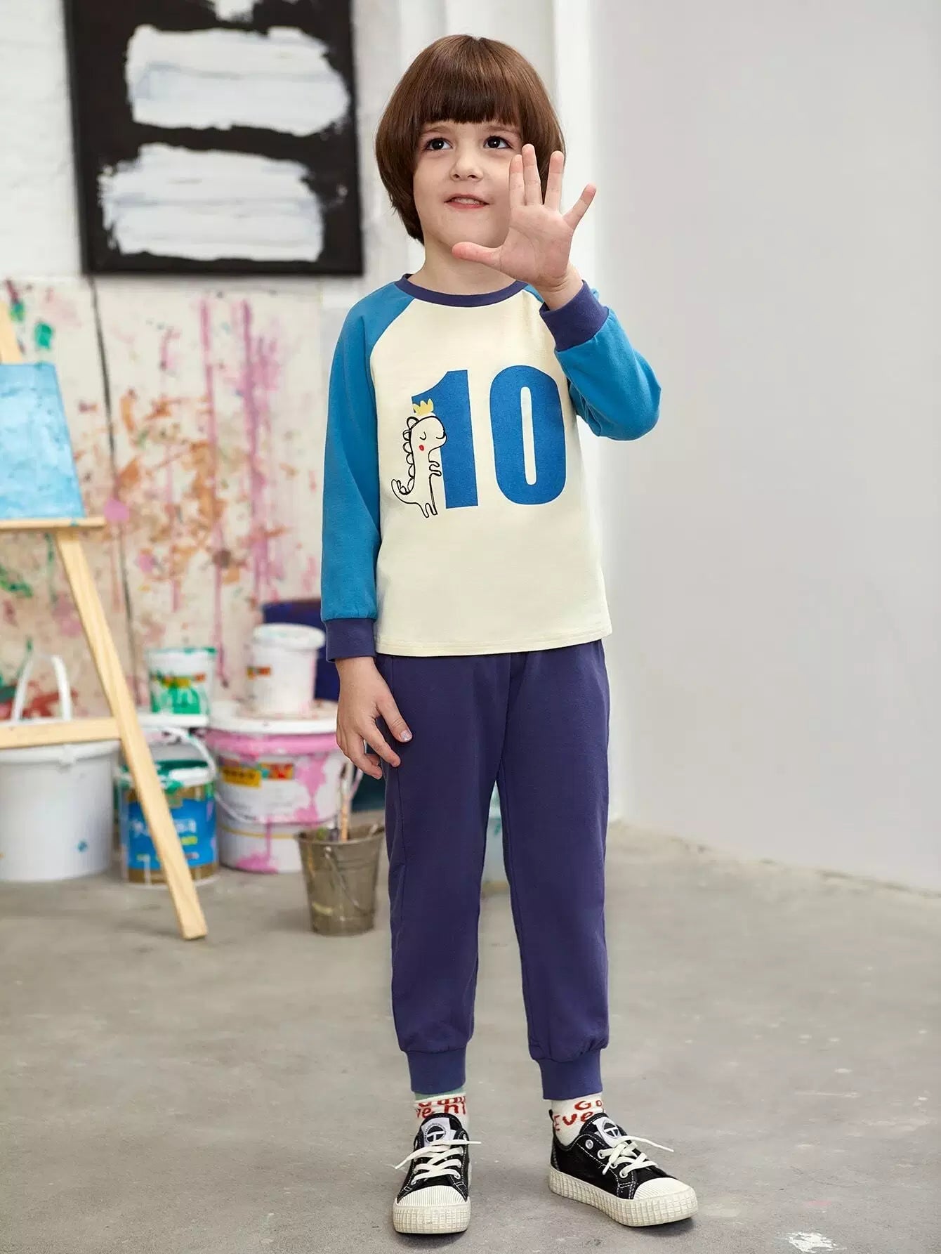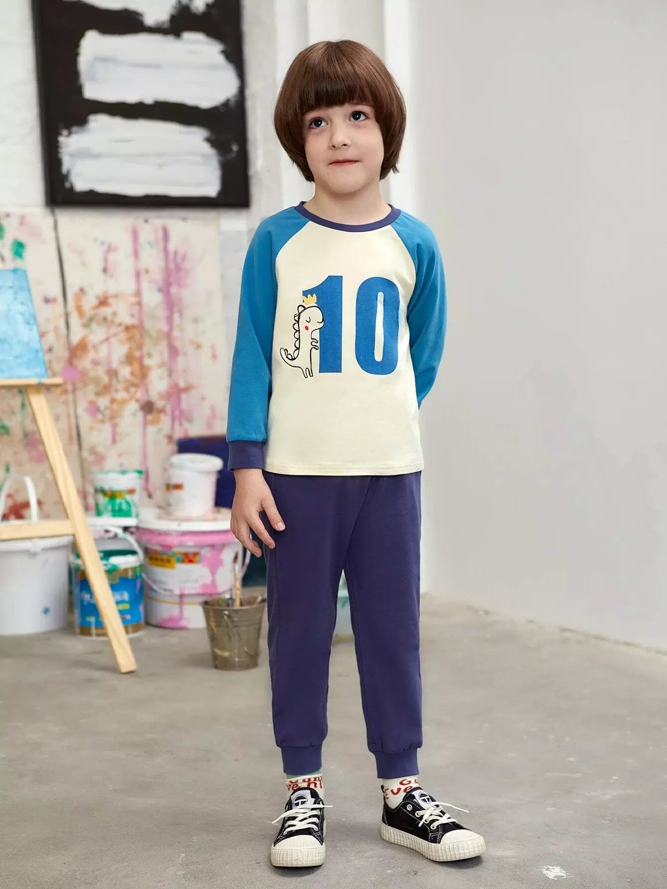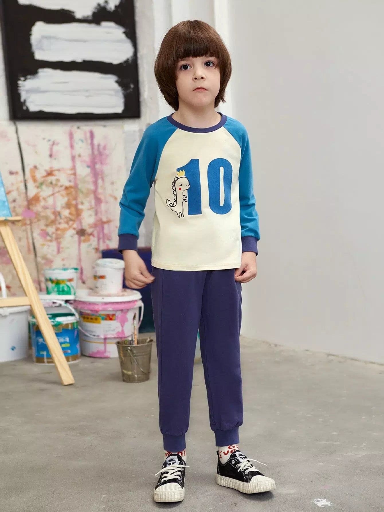 طقم توب وبنطال بأكمام راجلان وأرقام ورسومات كرتونية للأولاد الصغار