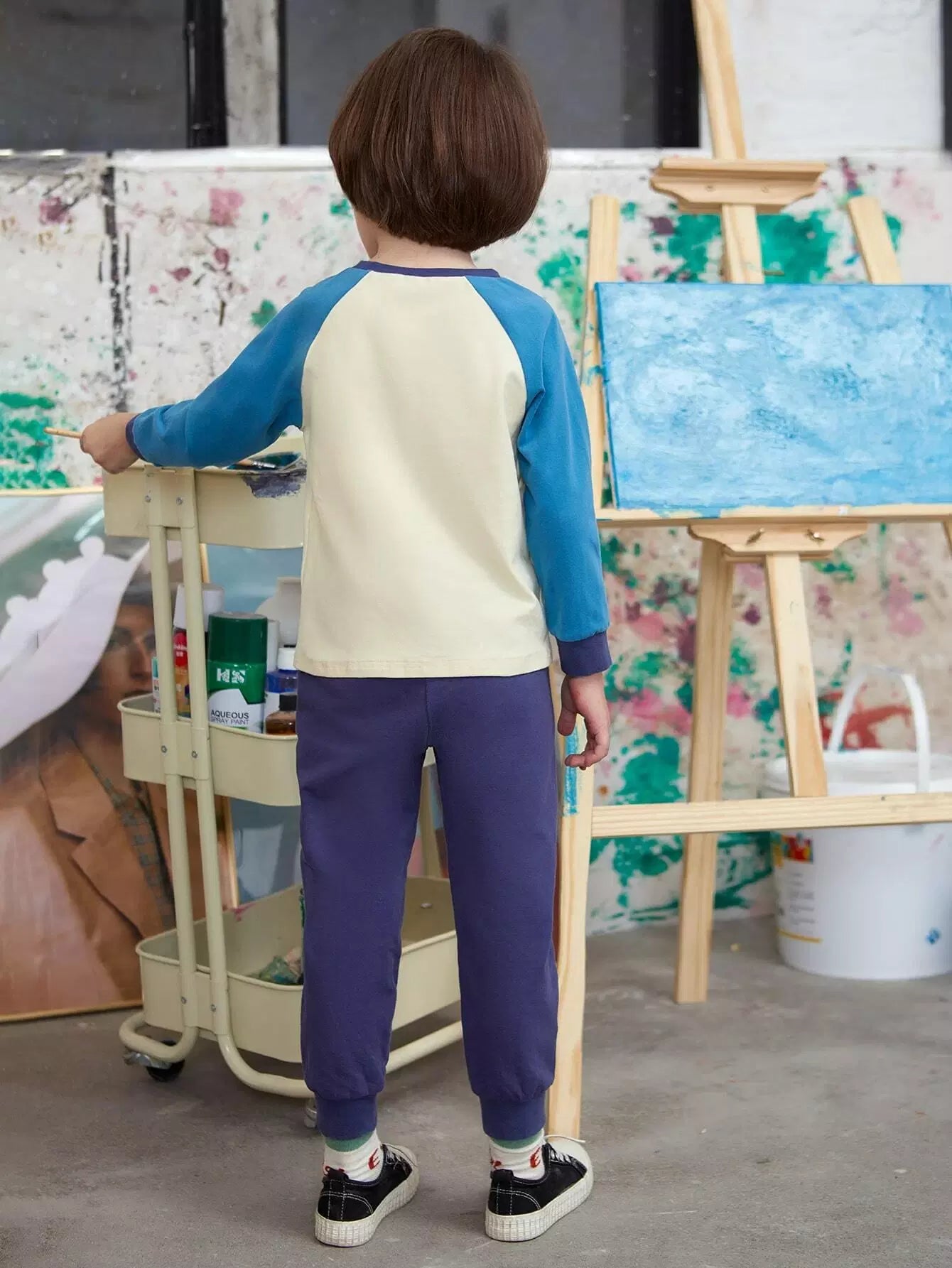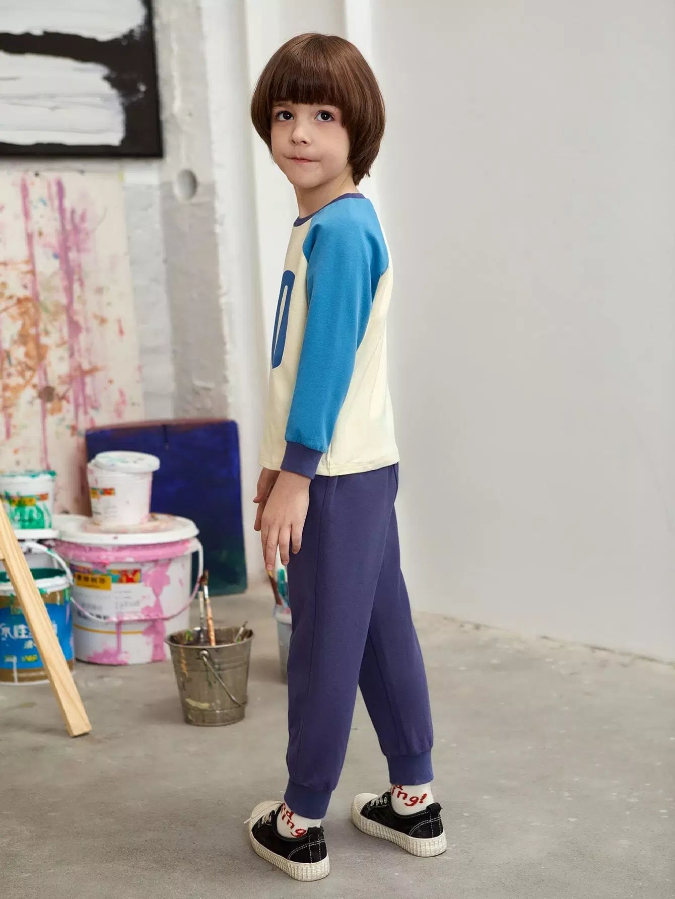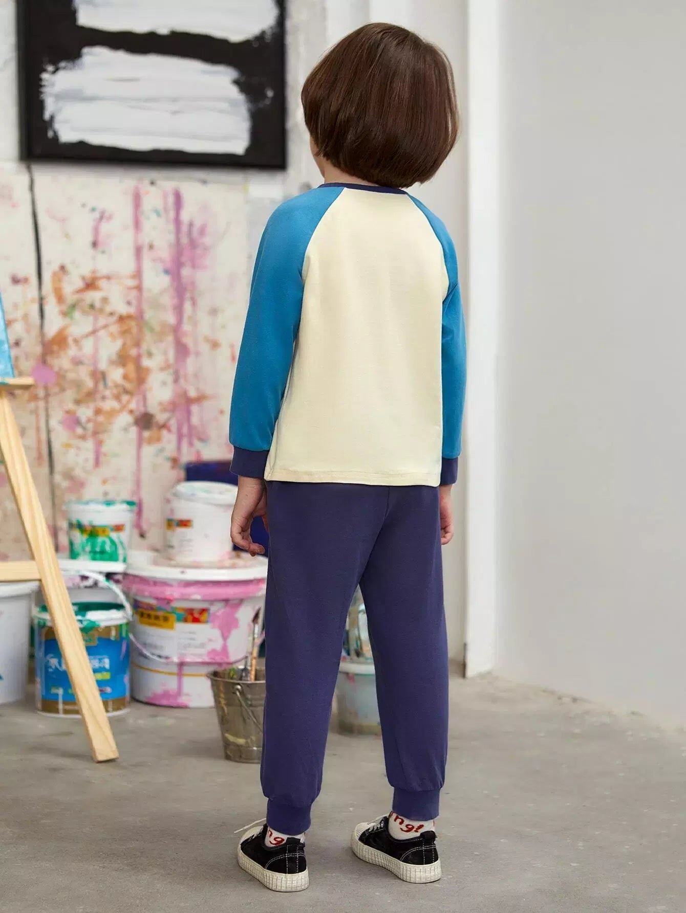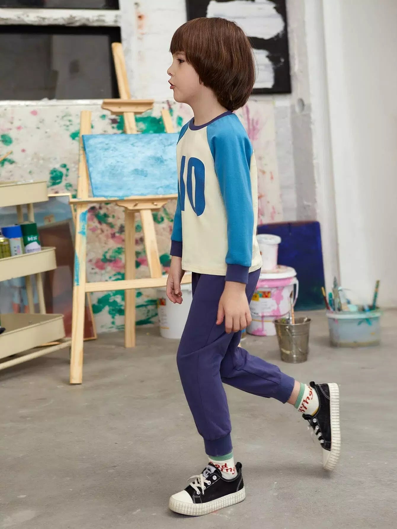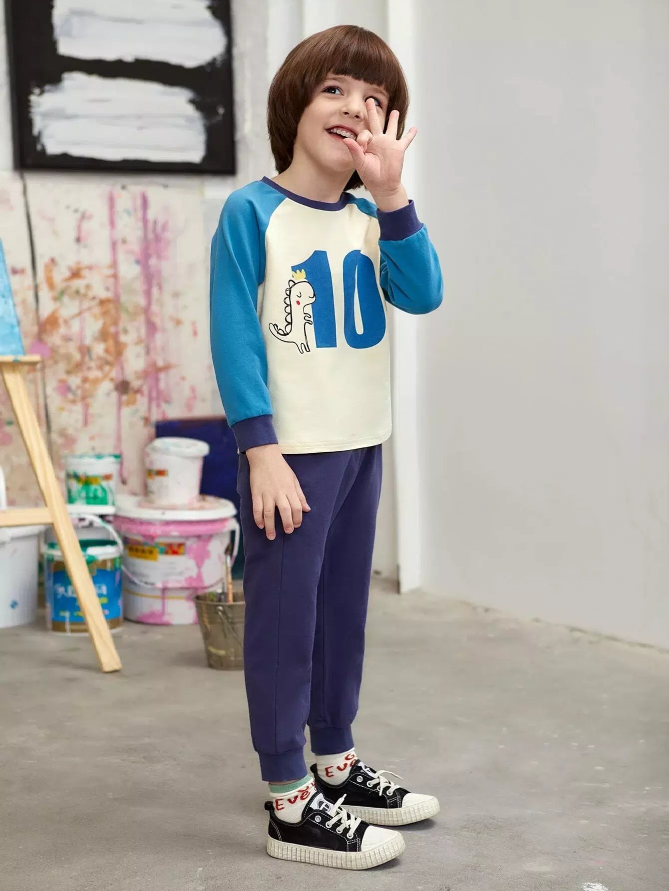 طقم توب وبنطال بأكمام راجلان وأرقام ورسومات كرتونية للأولاد الصغار