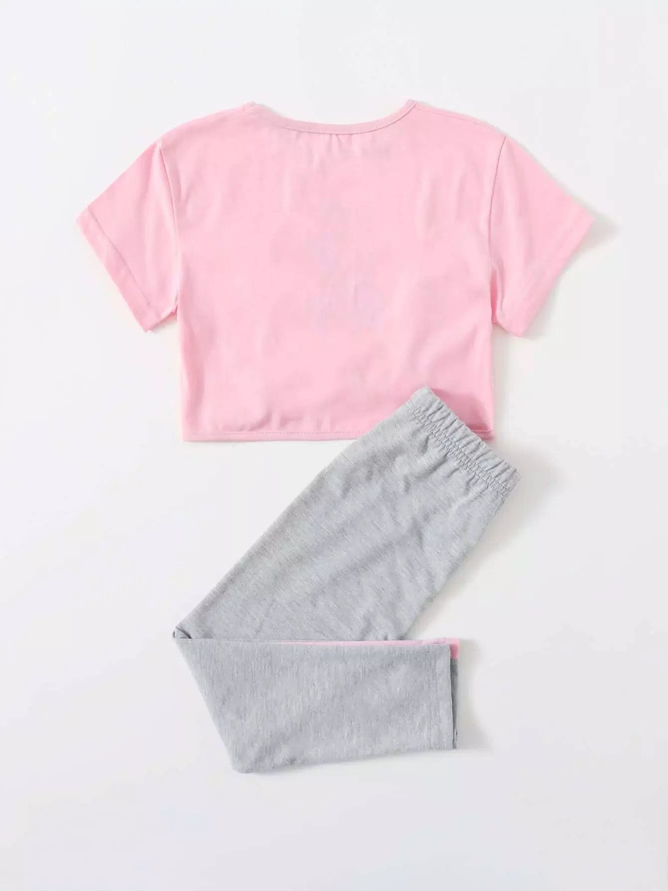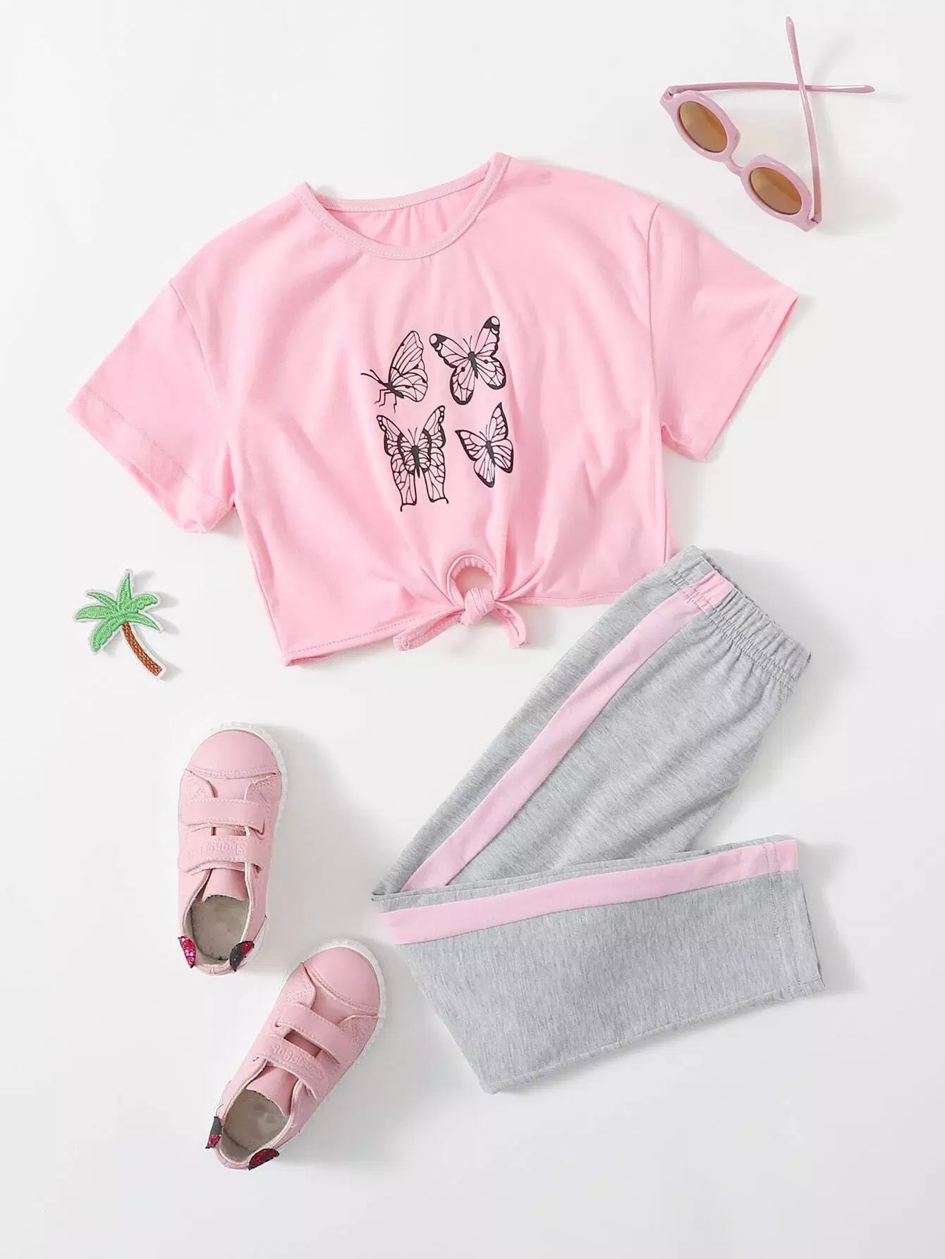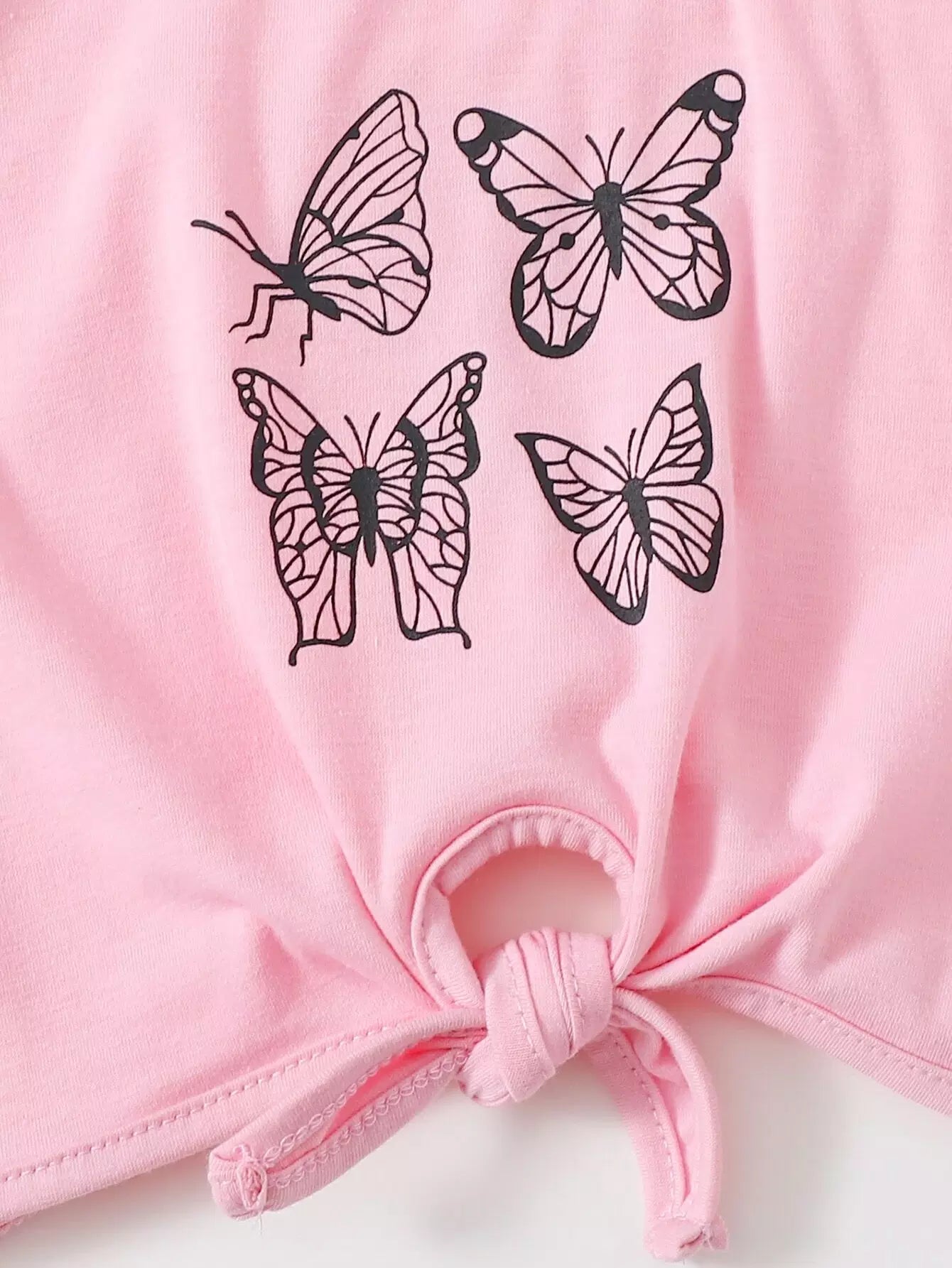 تي شيرت بطبعة فراشات بحافة عقدة للبنات الصغار مع بنطال رياضي