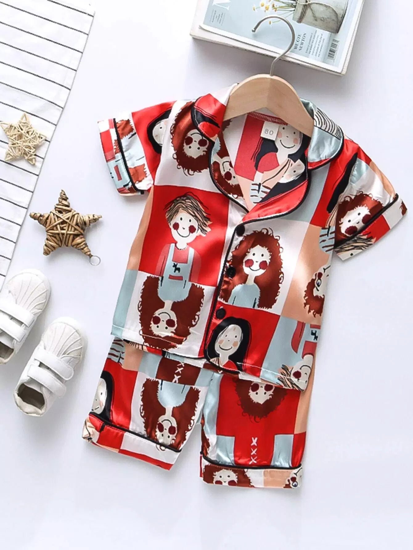 طقم بيجامة ساتان جرافيك كارتوني جرافيك للبنات الصغار