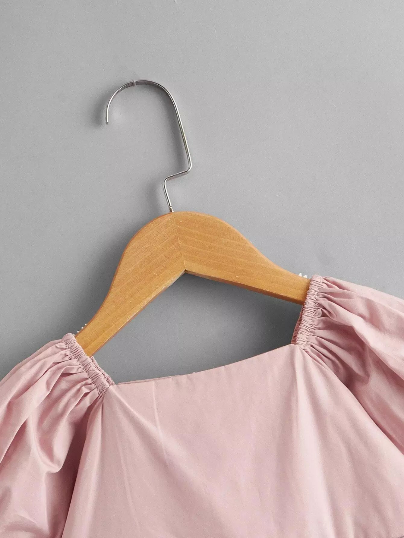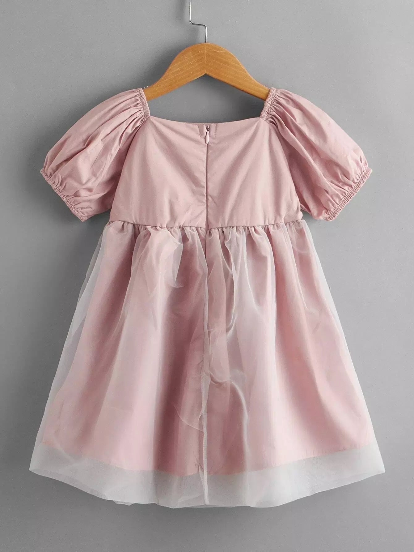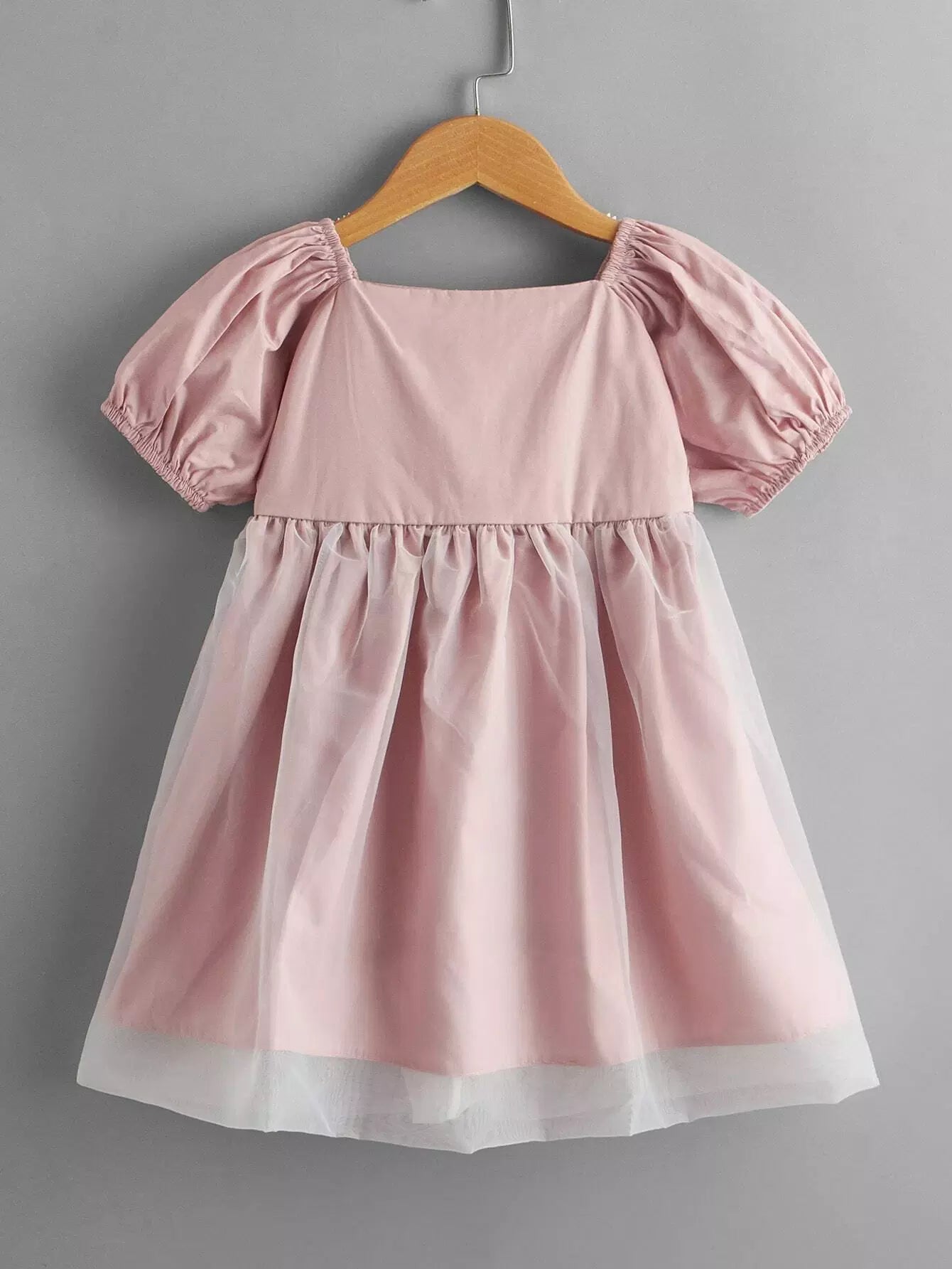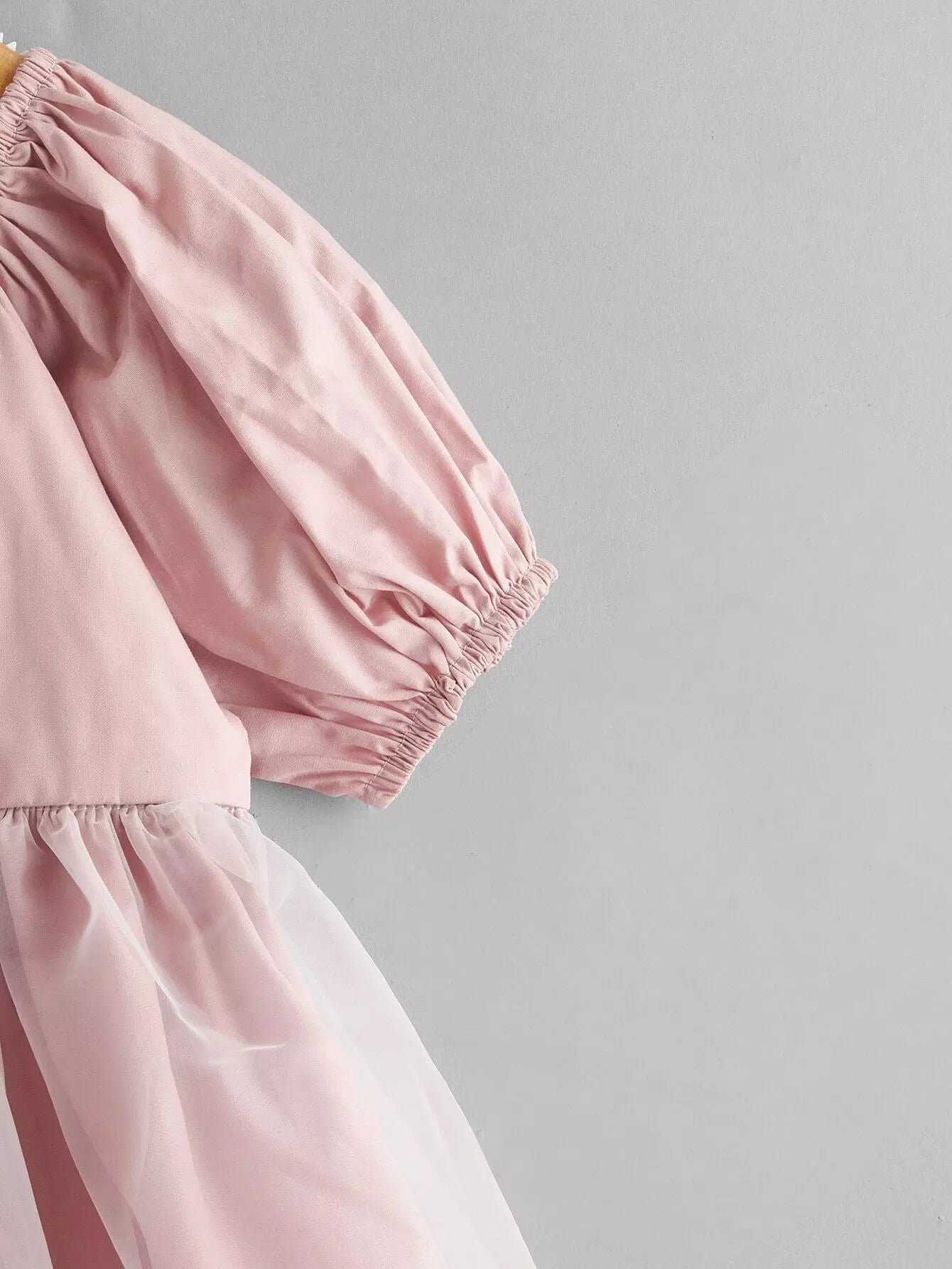 فستان بنات صغيرات بأكمام شبكية منفوشة بلون مغاير بأكمام منفوشة