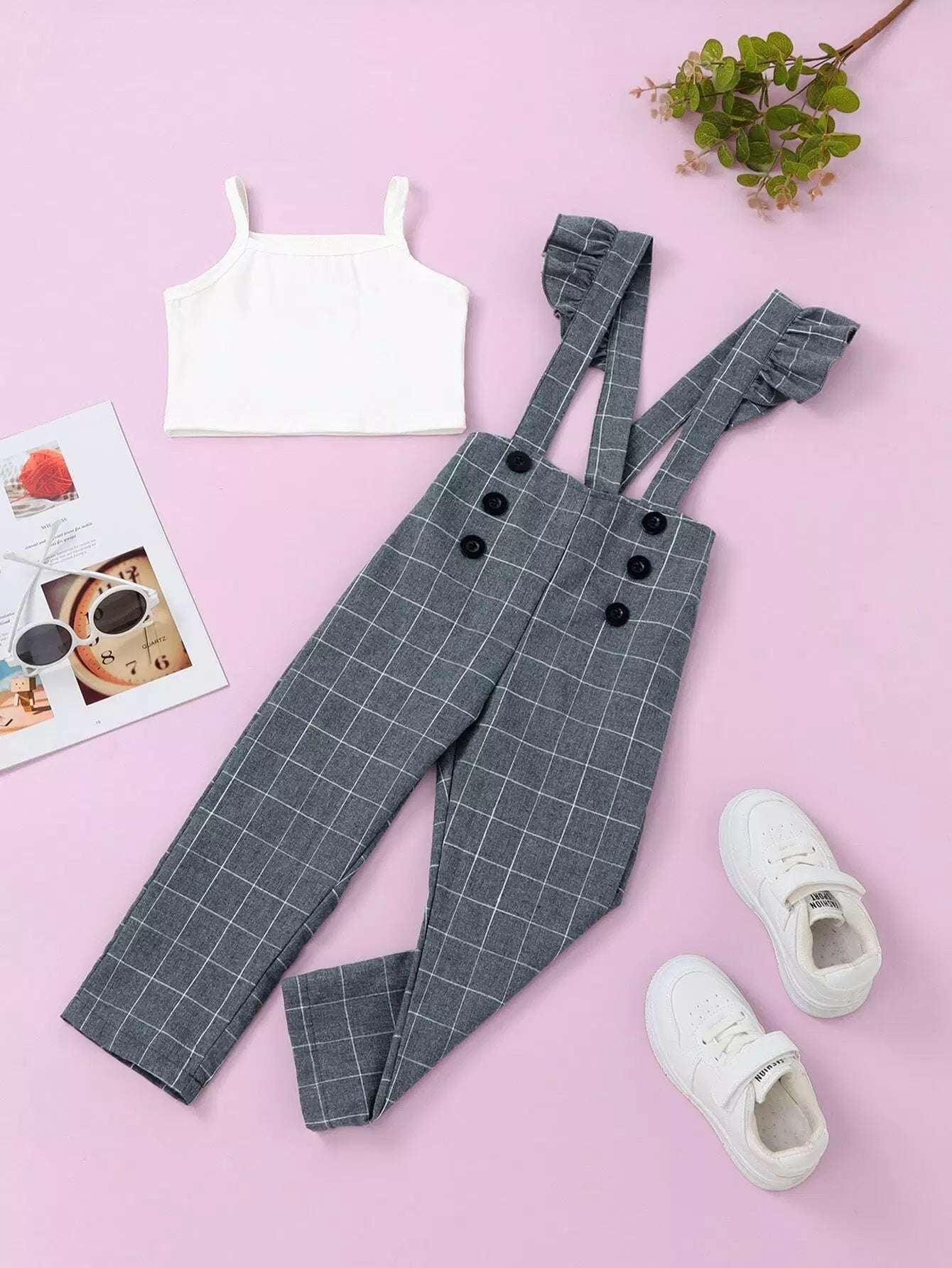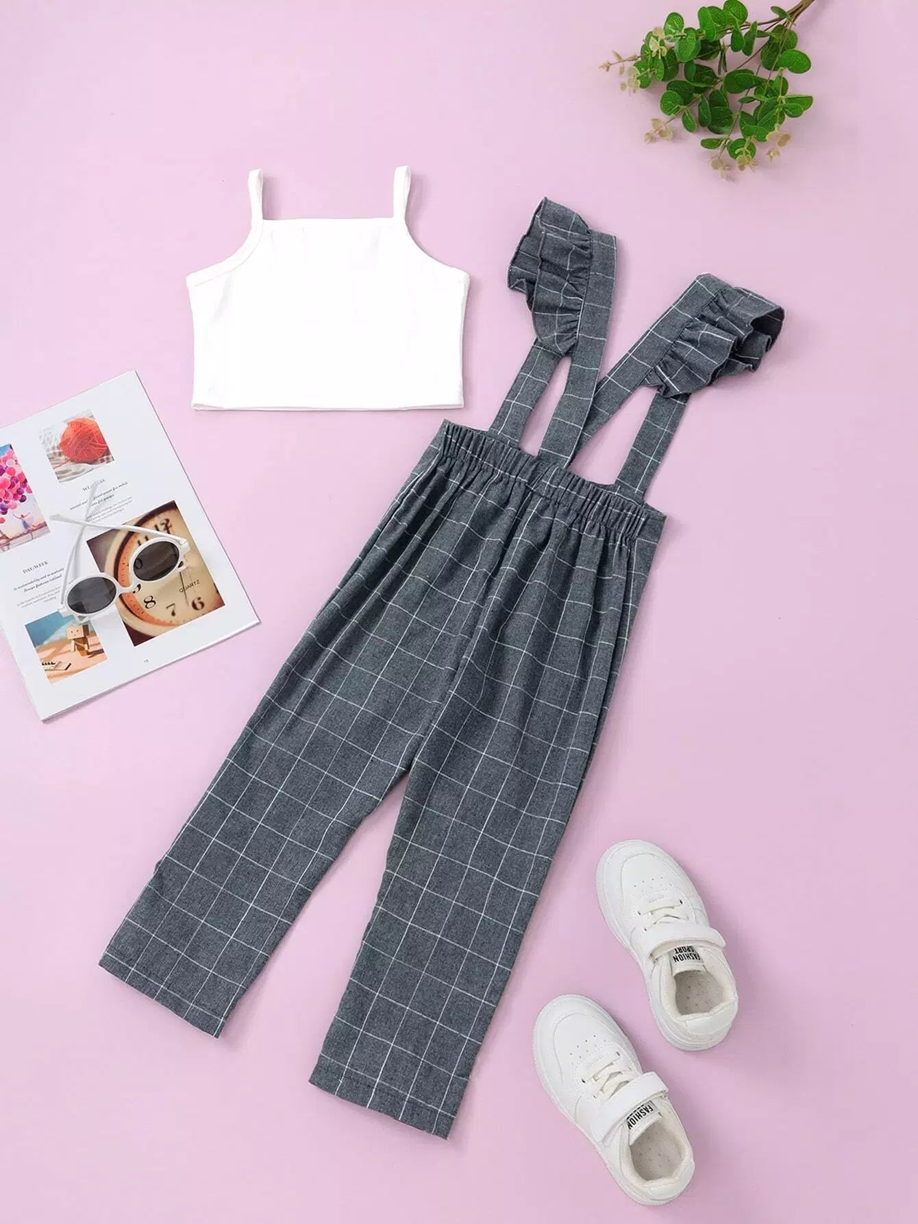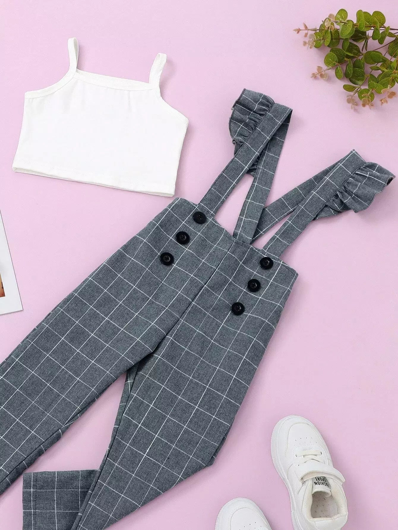 قميص قصير قصير للبنات صغيرات بقصّة قصيرة وبنطلون بنطلون بنقشة شبكية وحمالات كشكش
