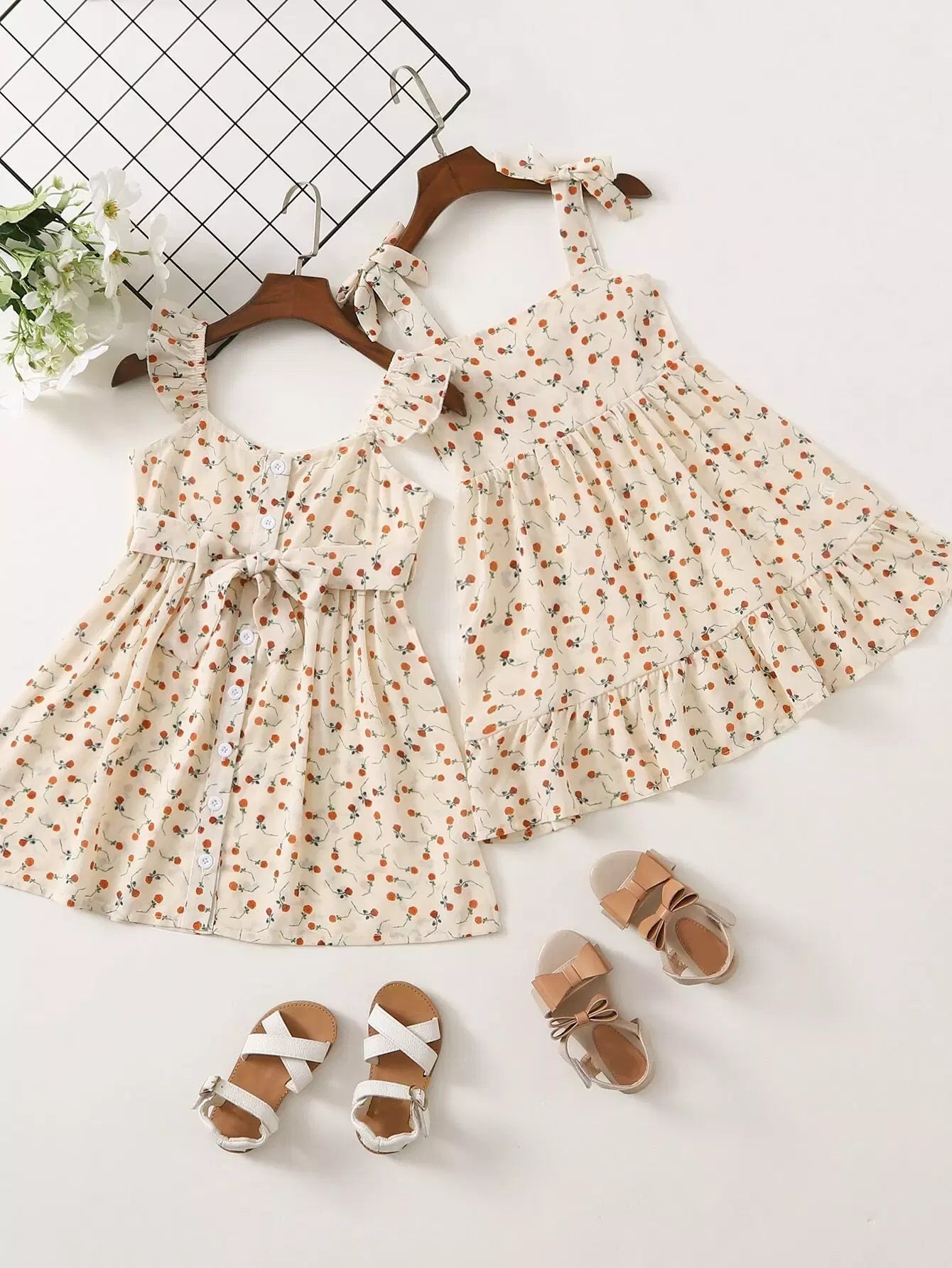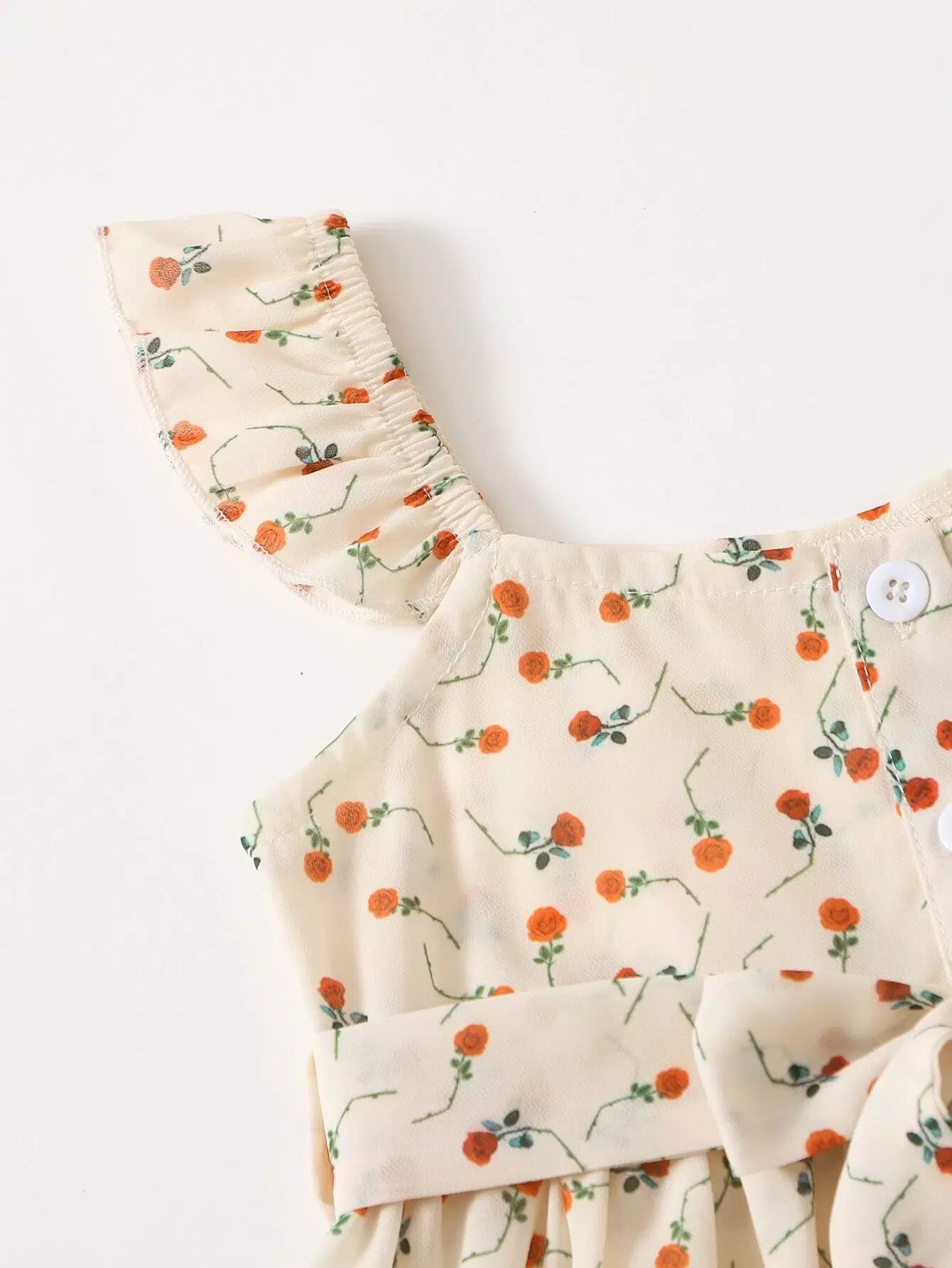 فستان على شكل حرف A مكشكش مزين بالزهور للفتيات الصغيرات بدون حزام