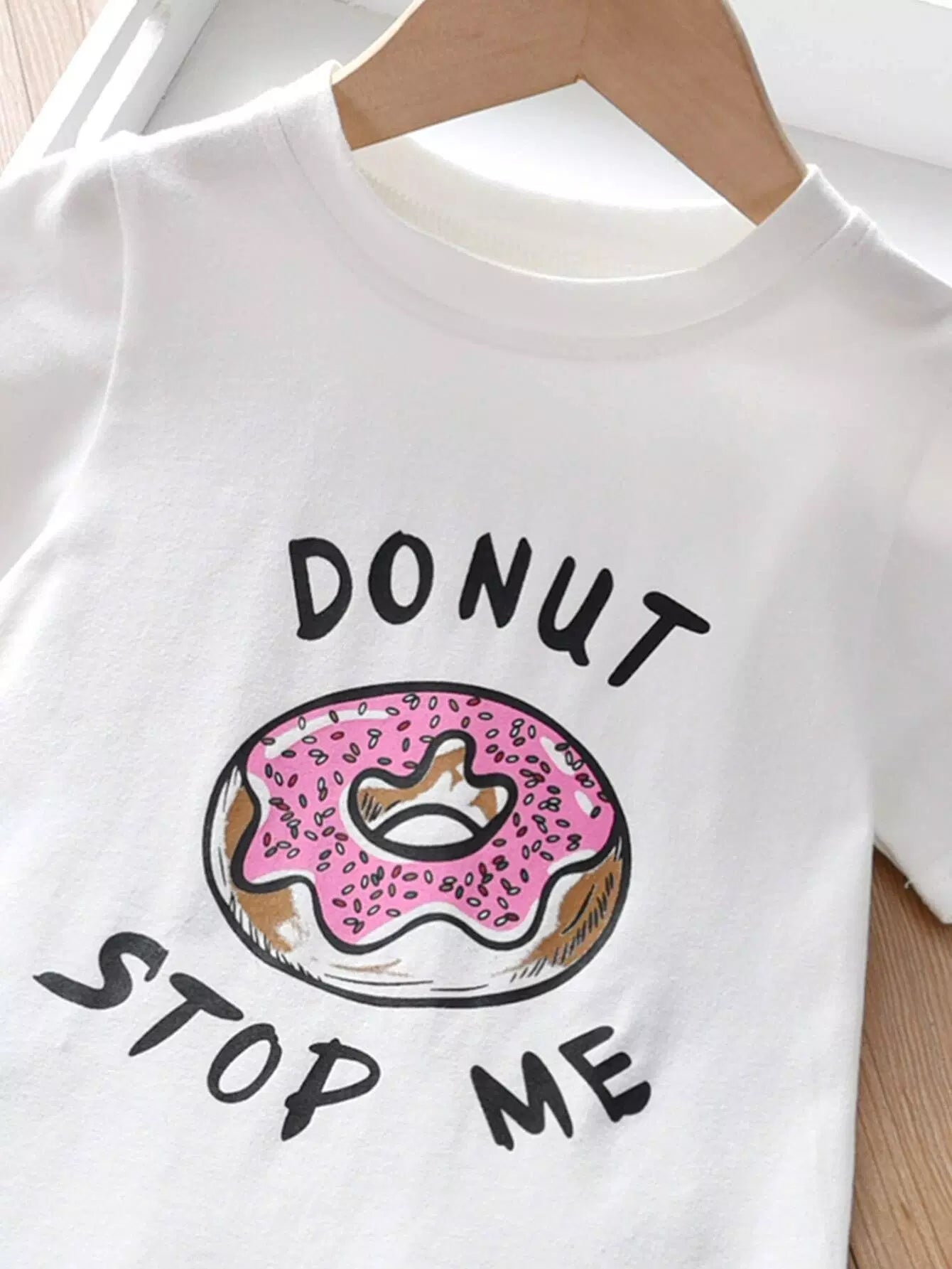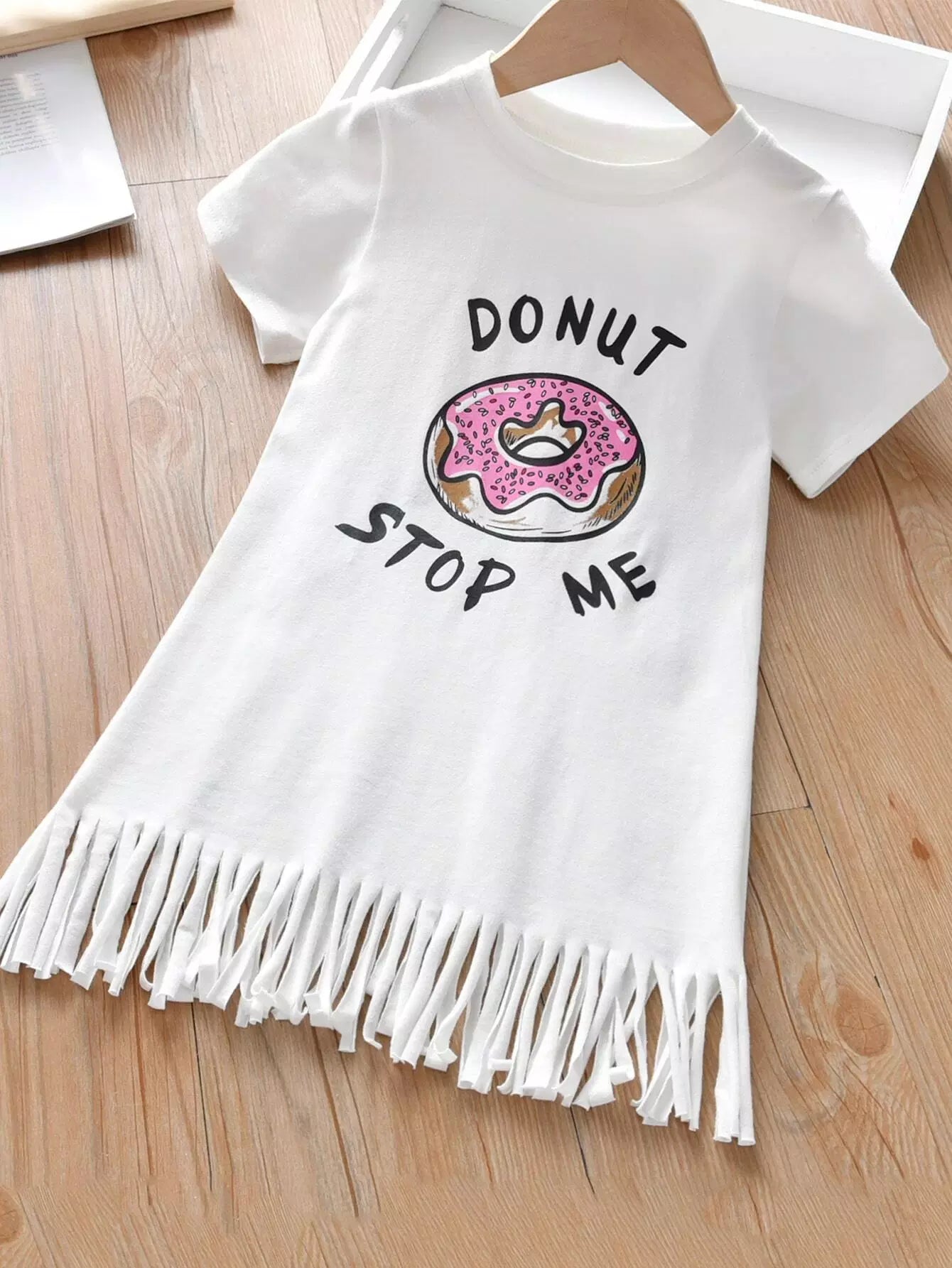 فستان بنات صغيرات بقصّة دونات وشعار جرافيك بحواف مهدبة