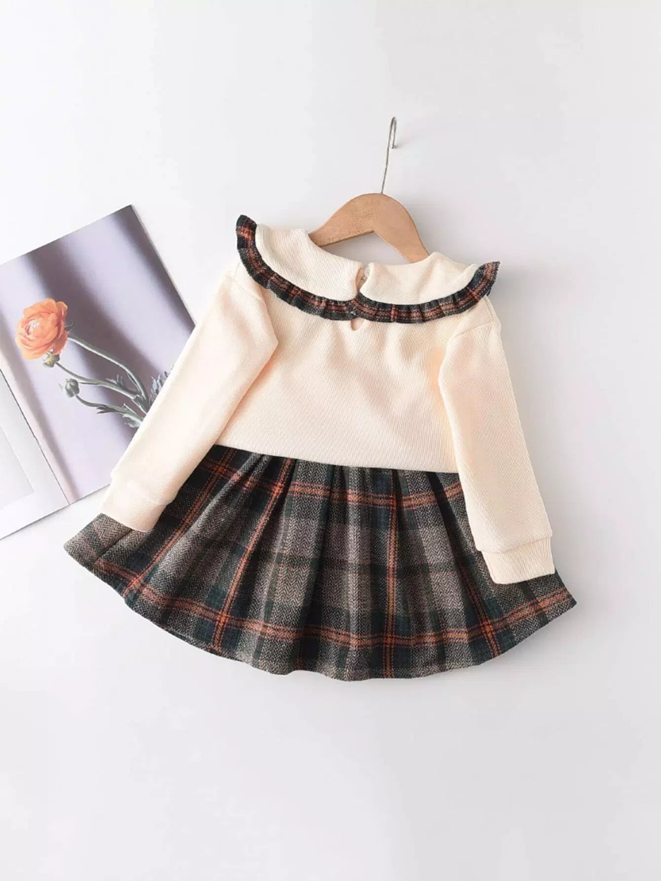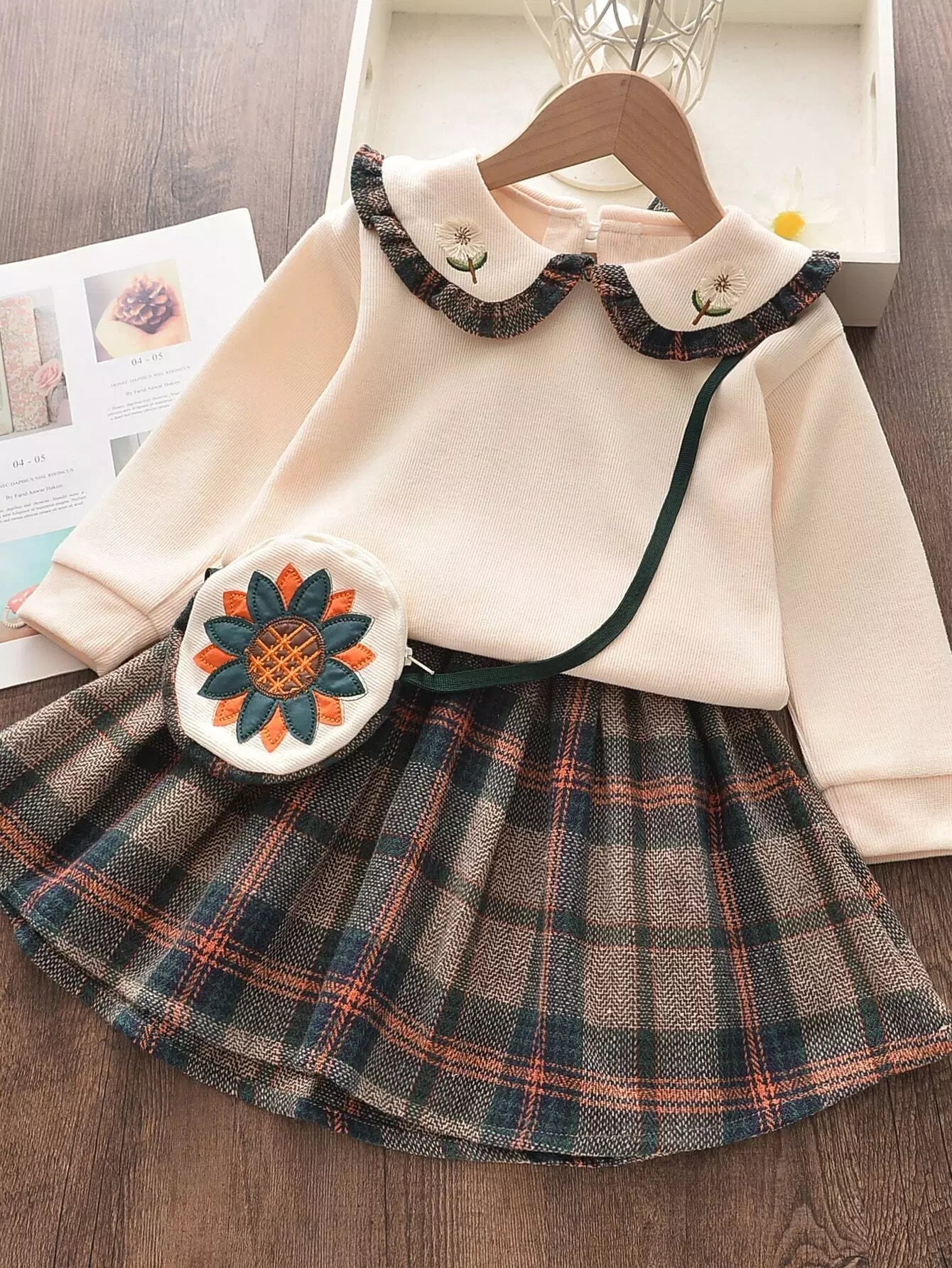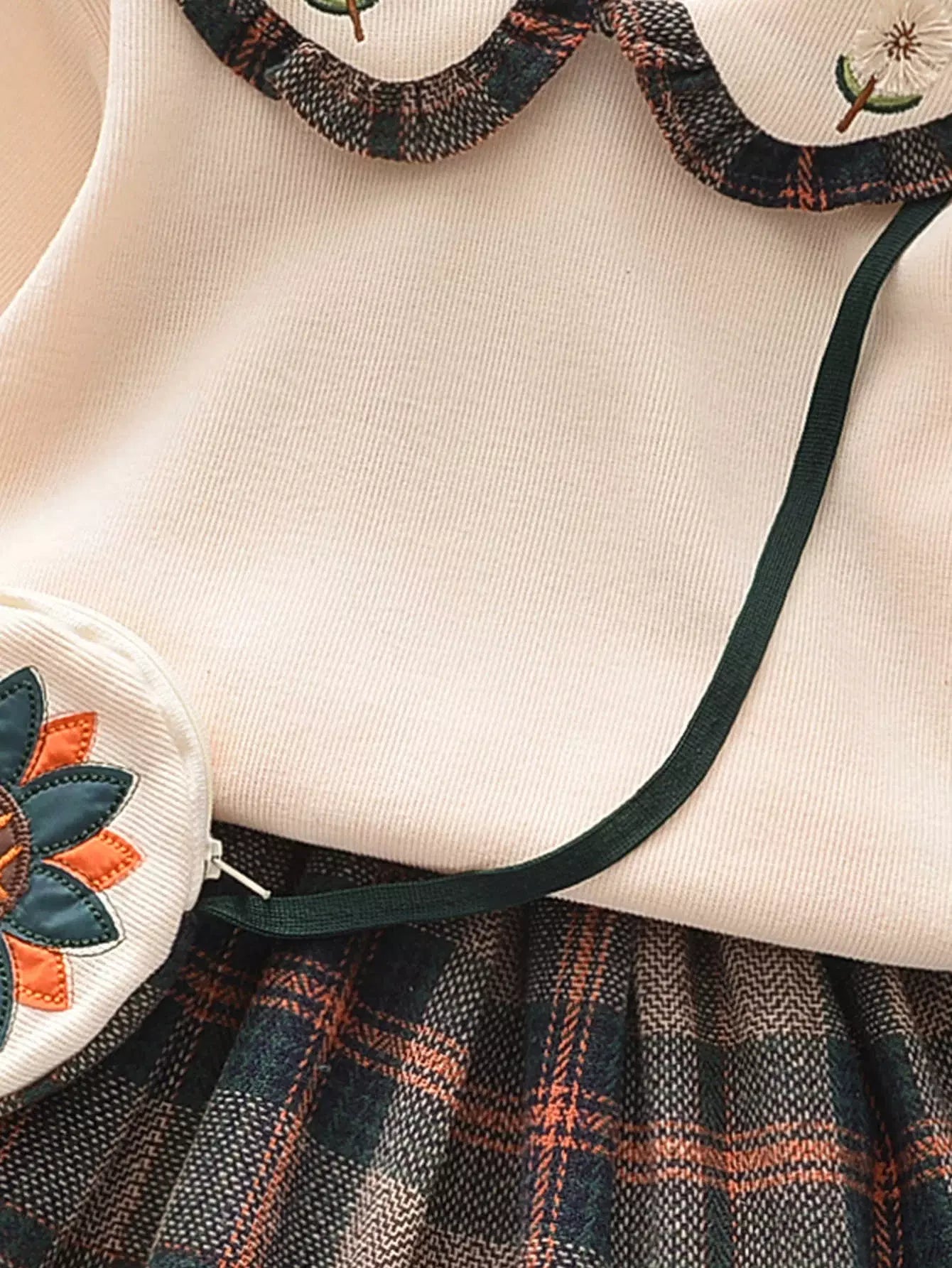 الأطفال - بلوزة مطرزة بالزهور للفتيات الصغيرات وتنورة منقوشة مع حقيبة