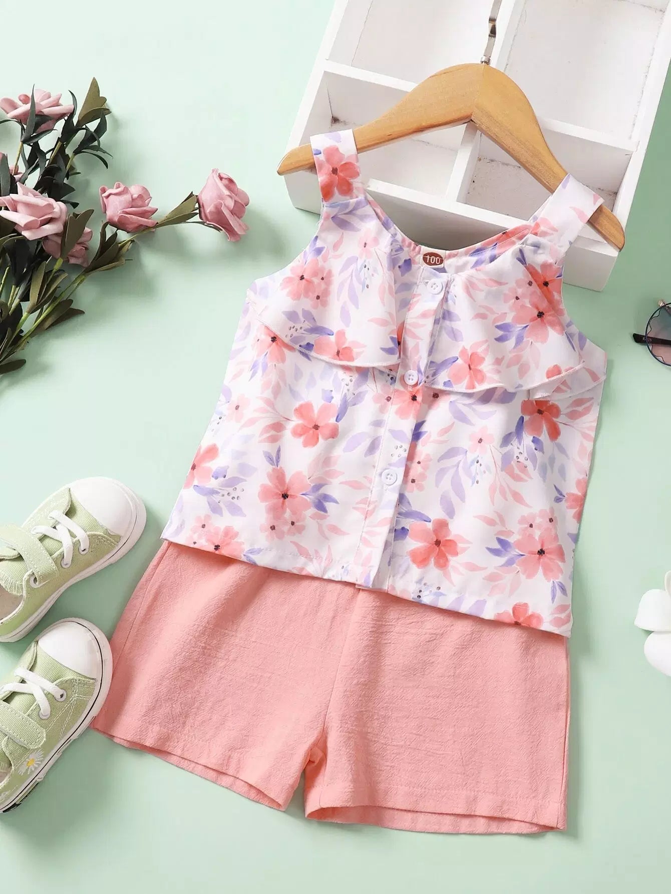 بلوزة وبنطلون قصير بناتي صغيرات بنقشة زهور وشورت قصير