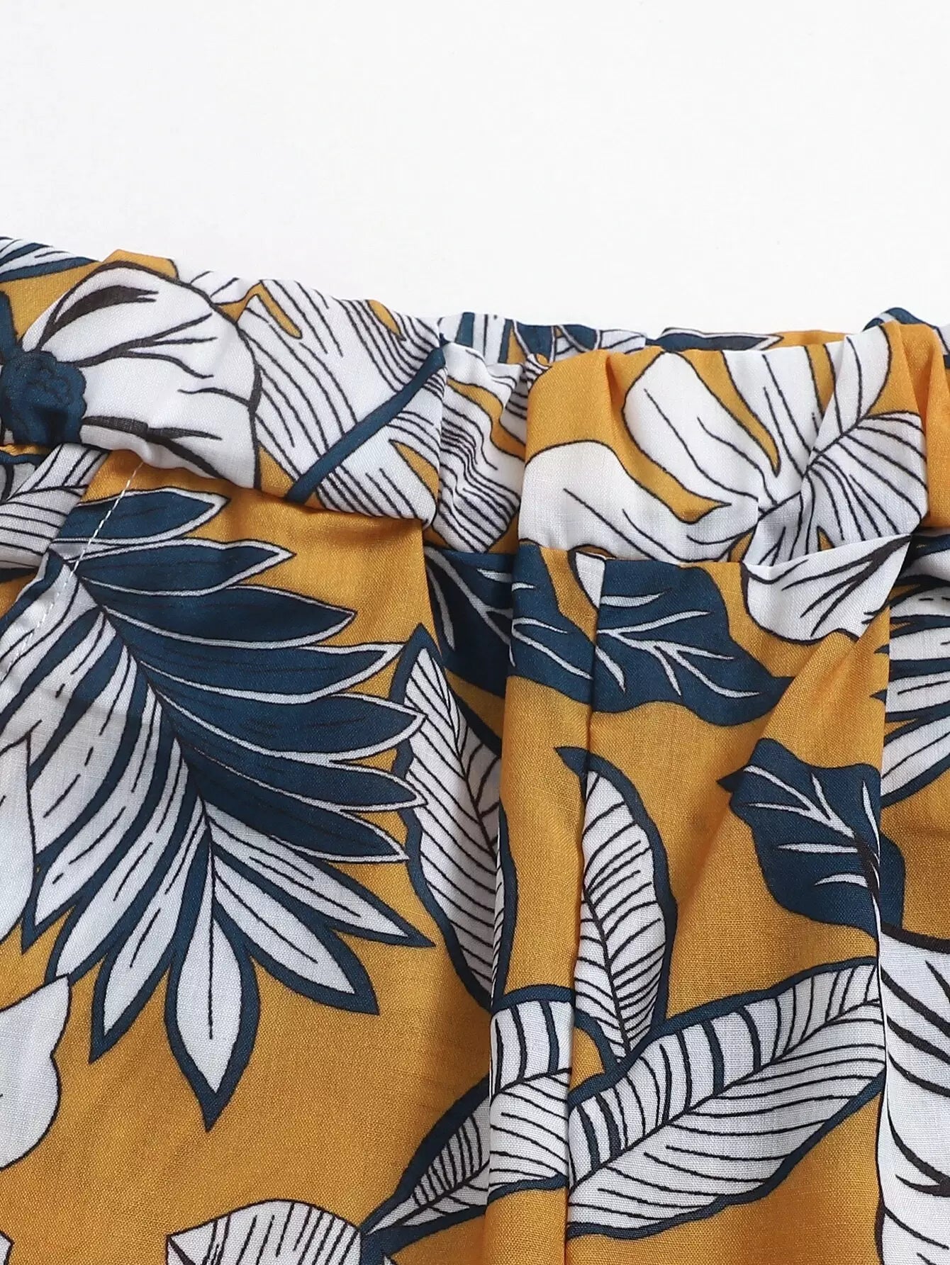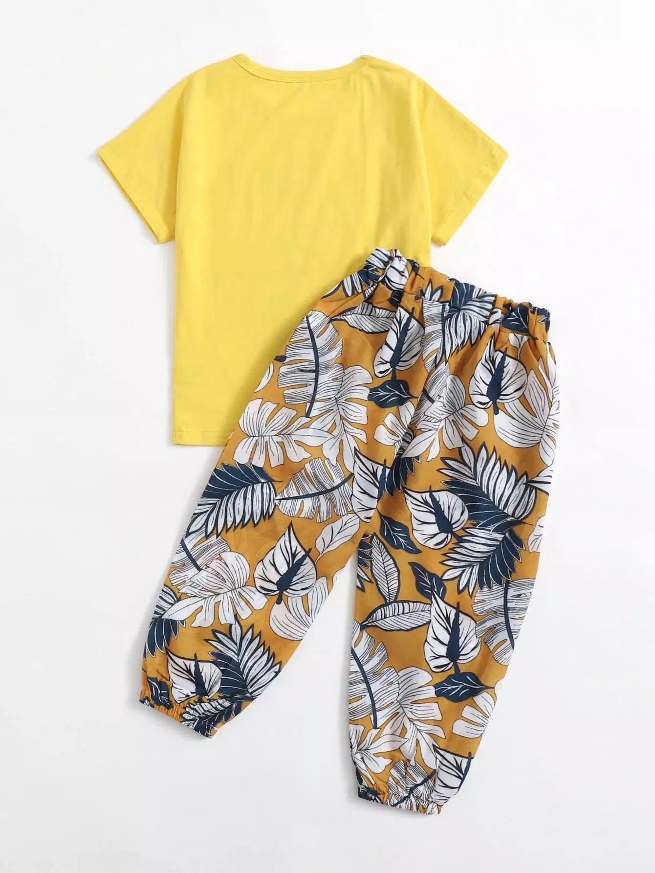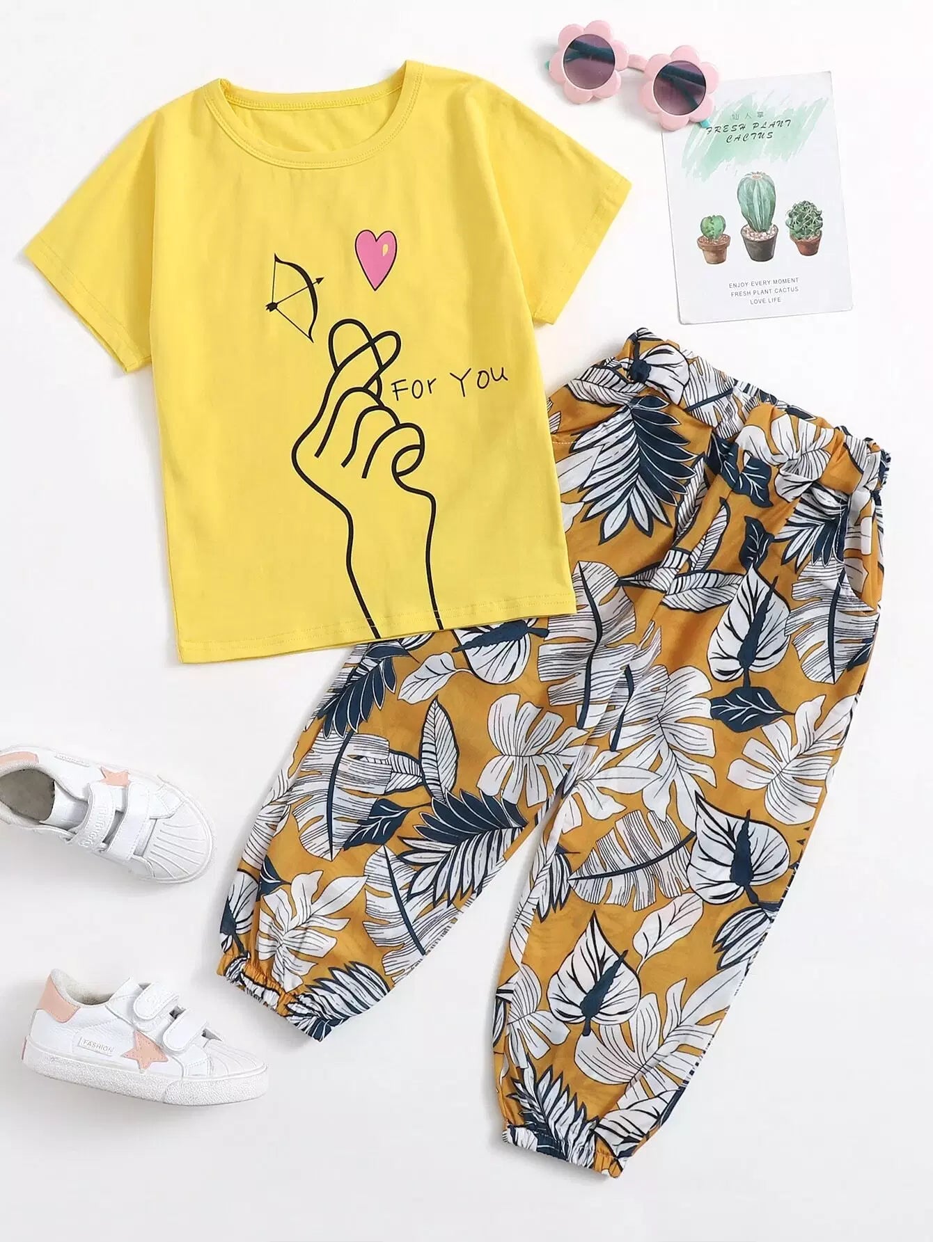 تي شيرت بطبعة يدوية للبنات الصغيرات مع بنطلون نباتات