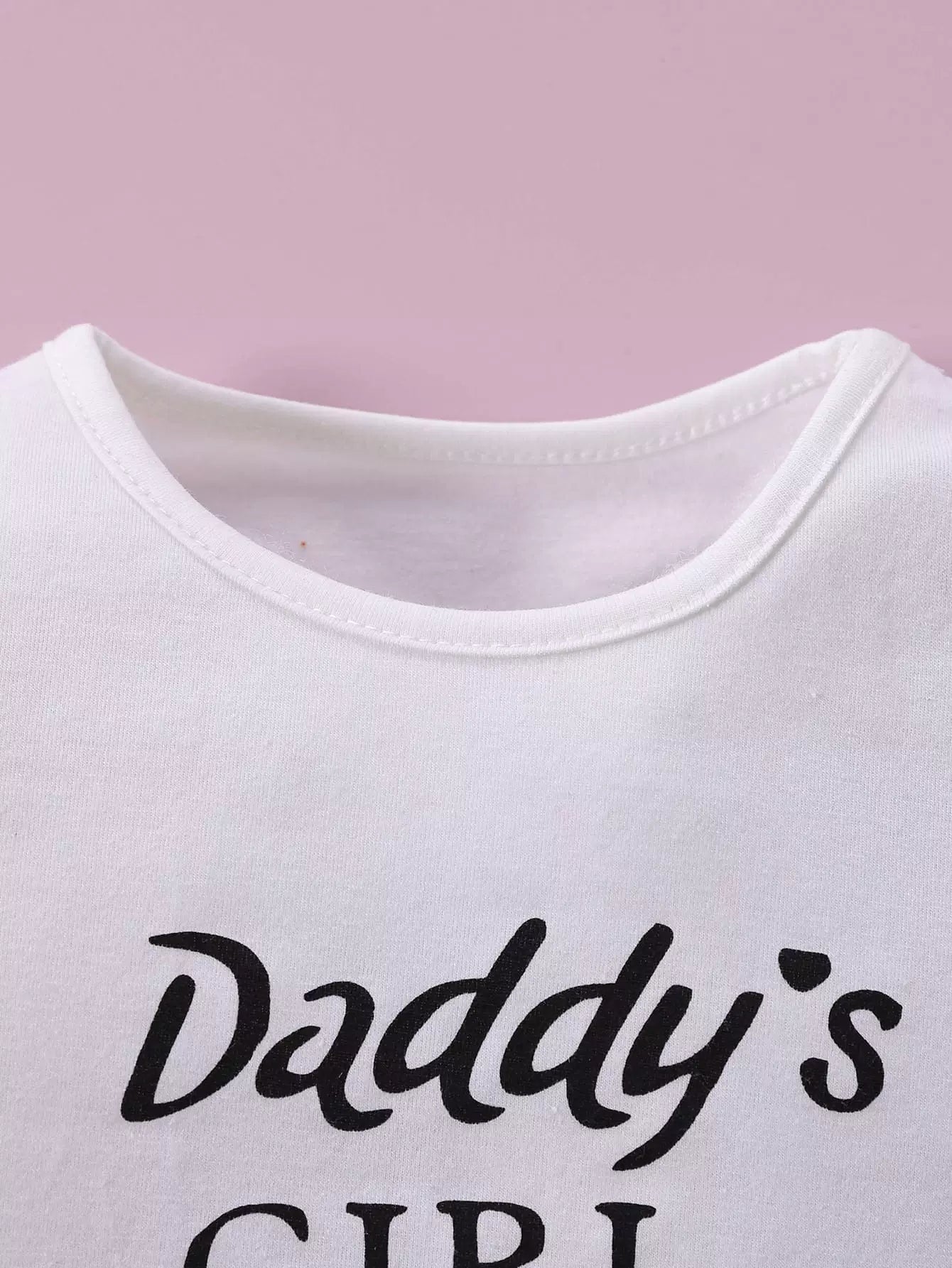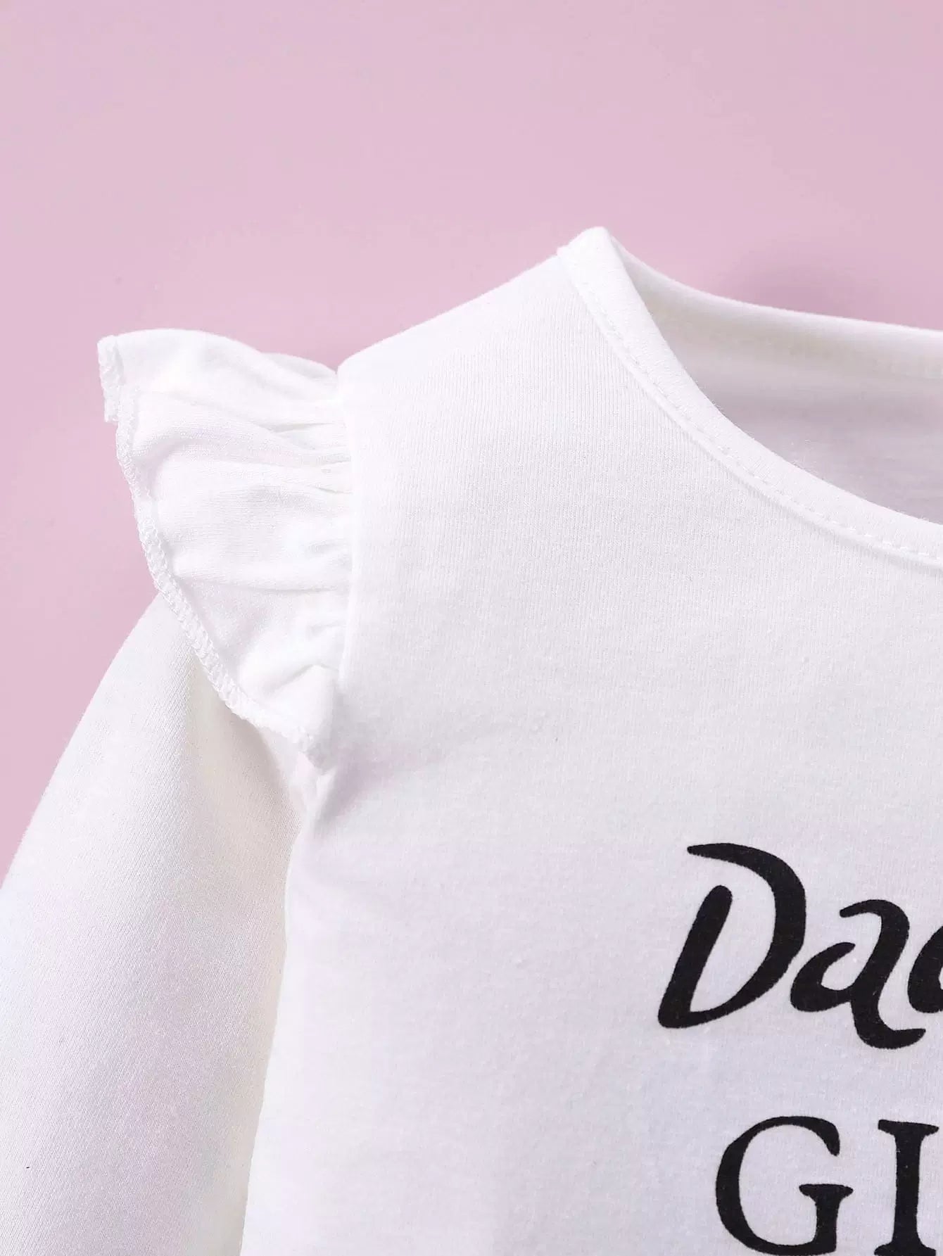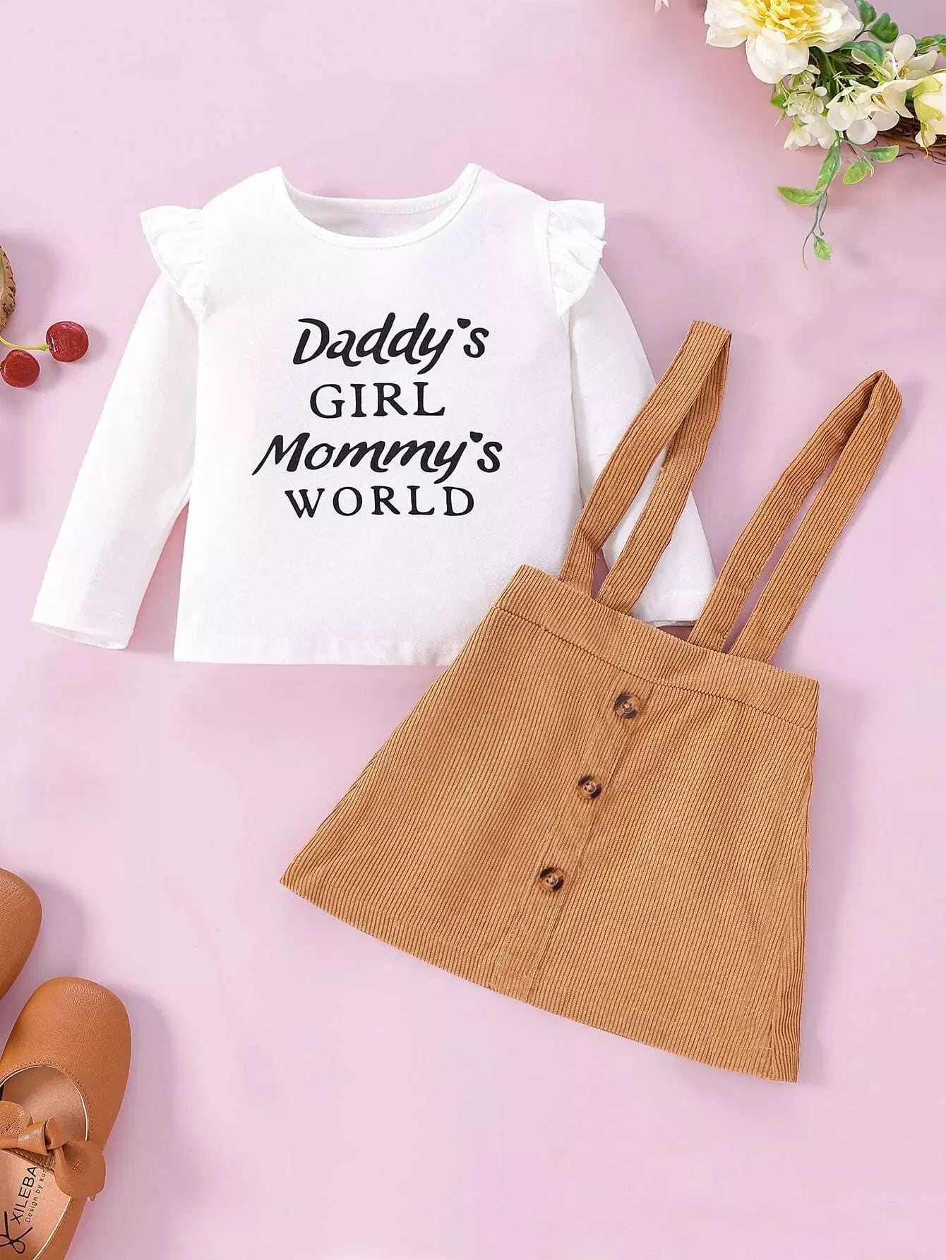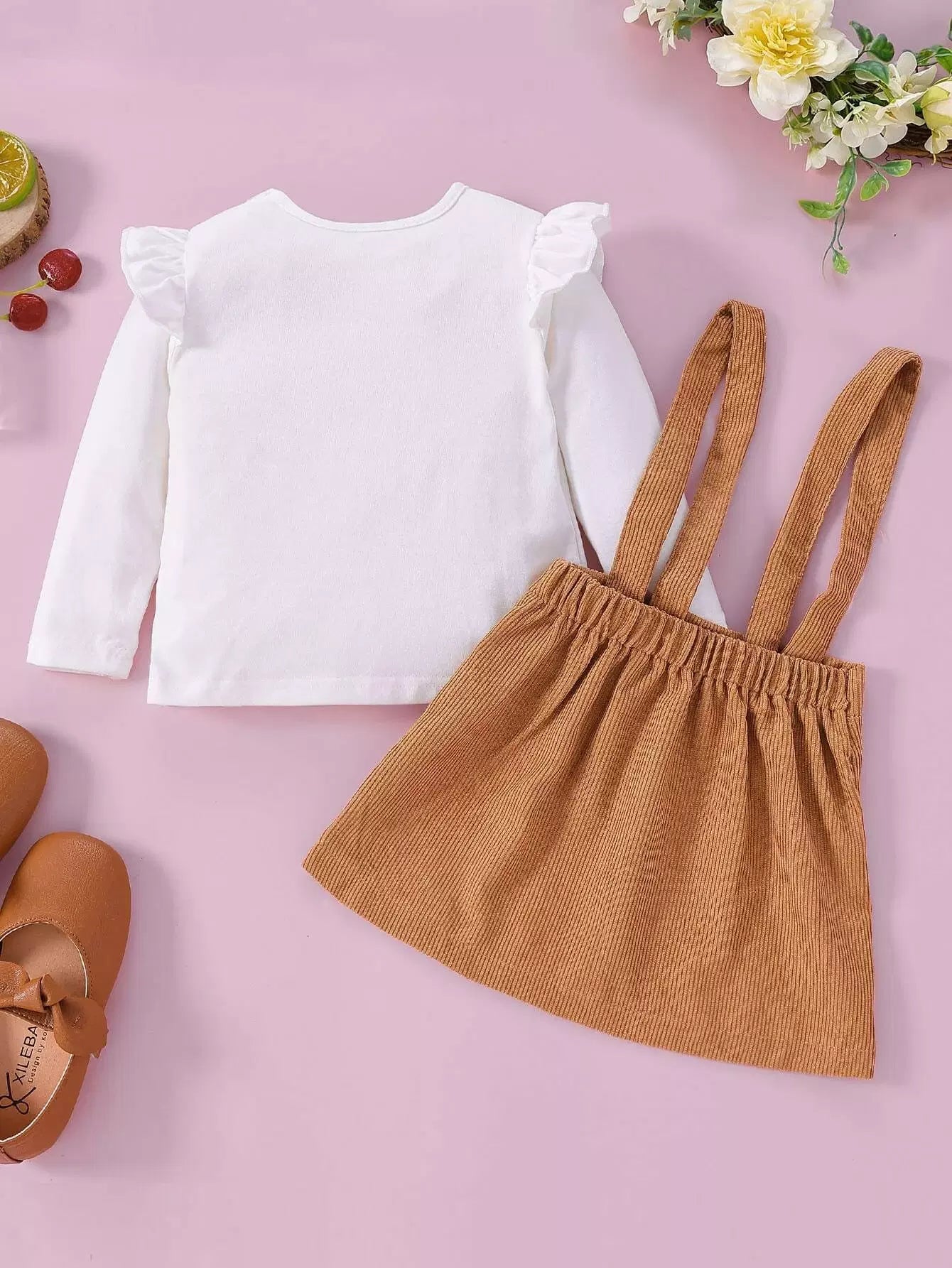 تي شيرت بحواف مكشكشة برسومات حروف للبنات الصغار وتنورة بأزرار أمامية