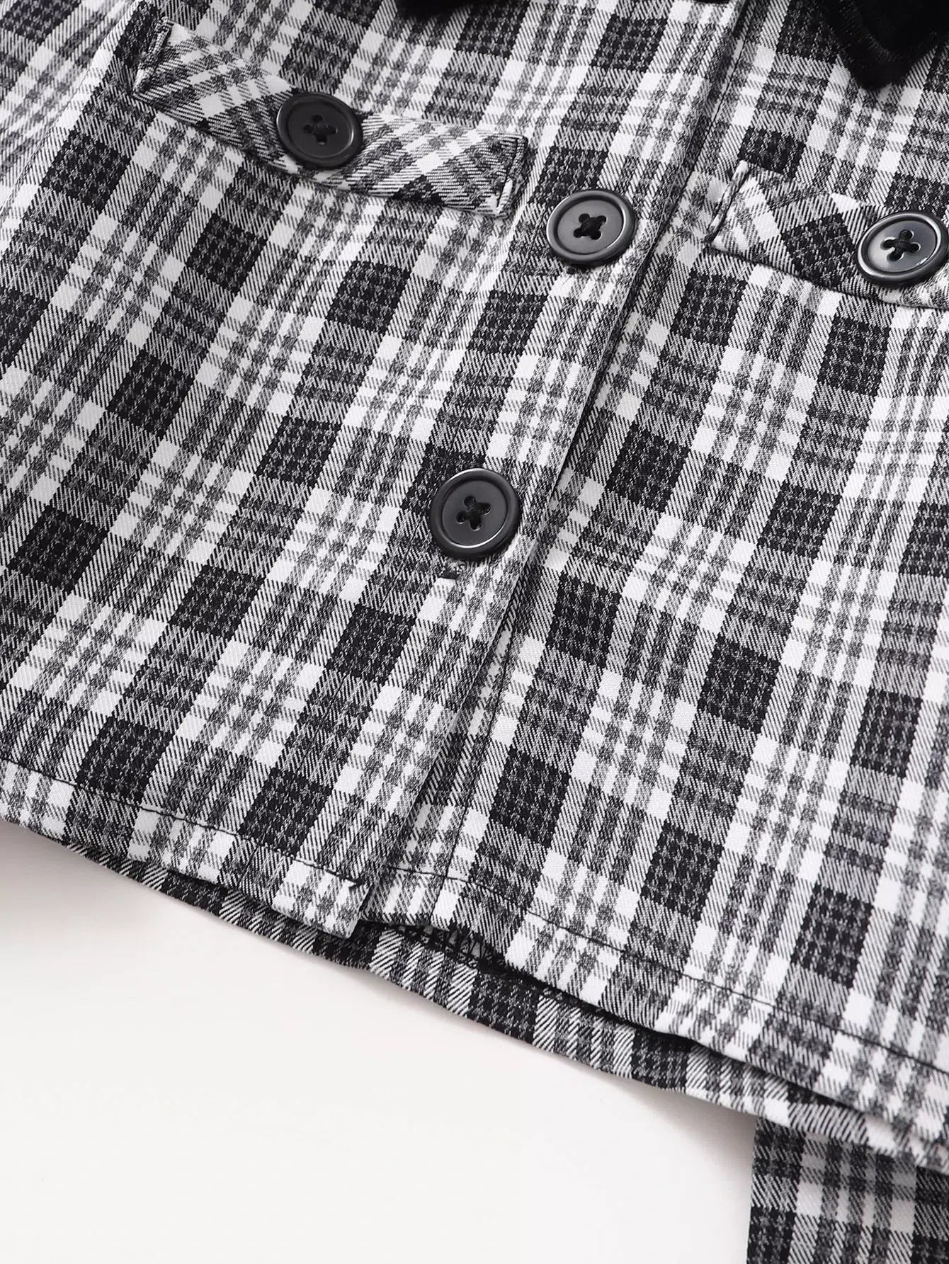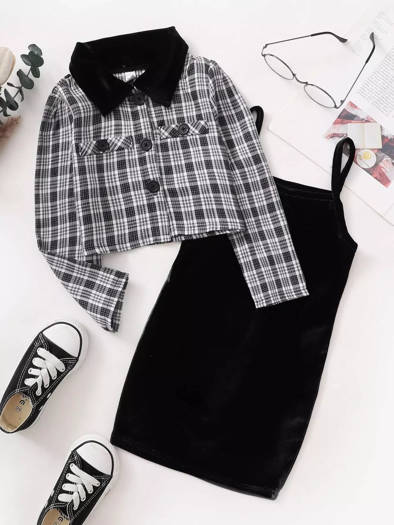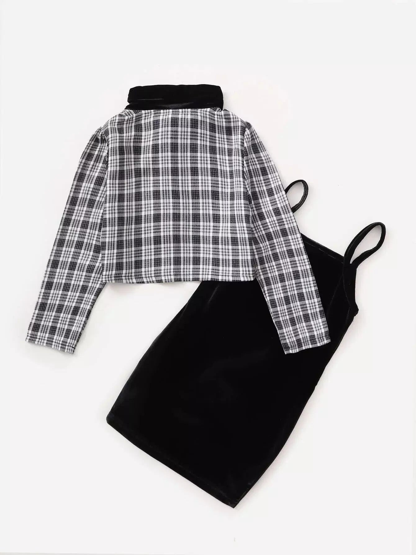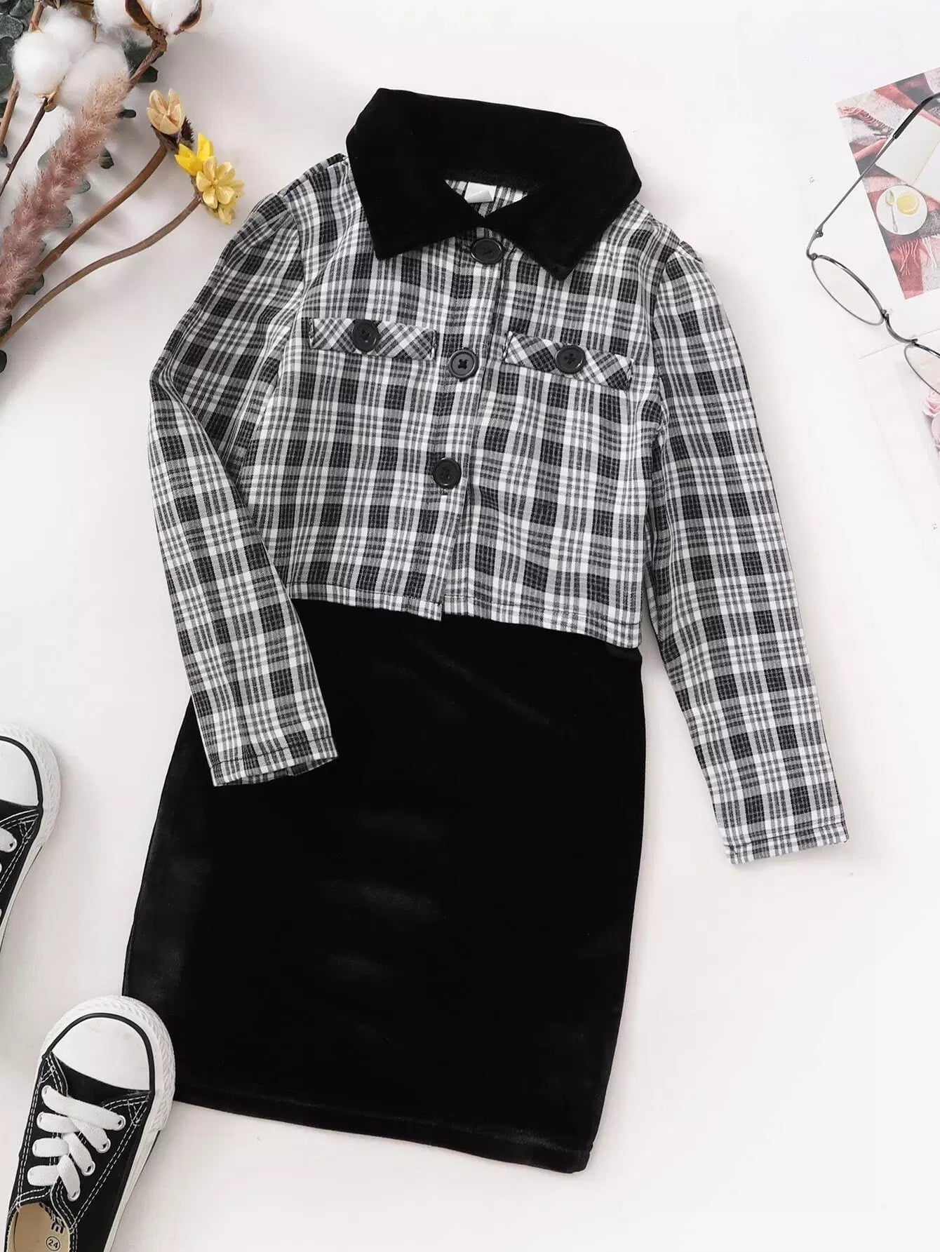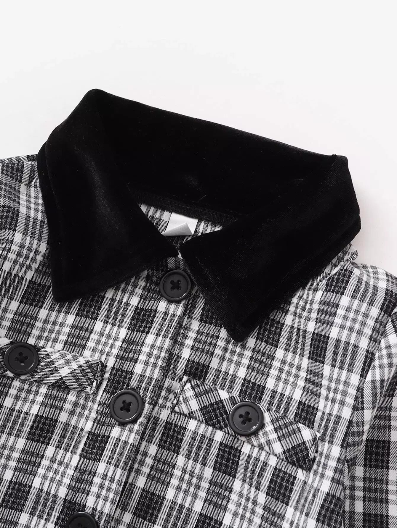 جاكيت بياقة منقوشة بلون مغاير للبنات الصغيرات وفستان بياقة بلون مغاير