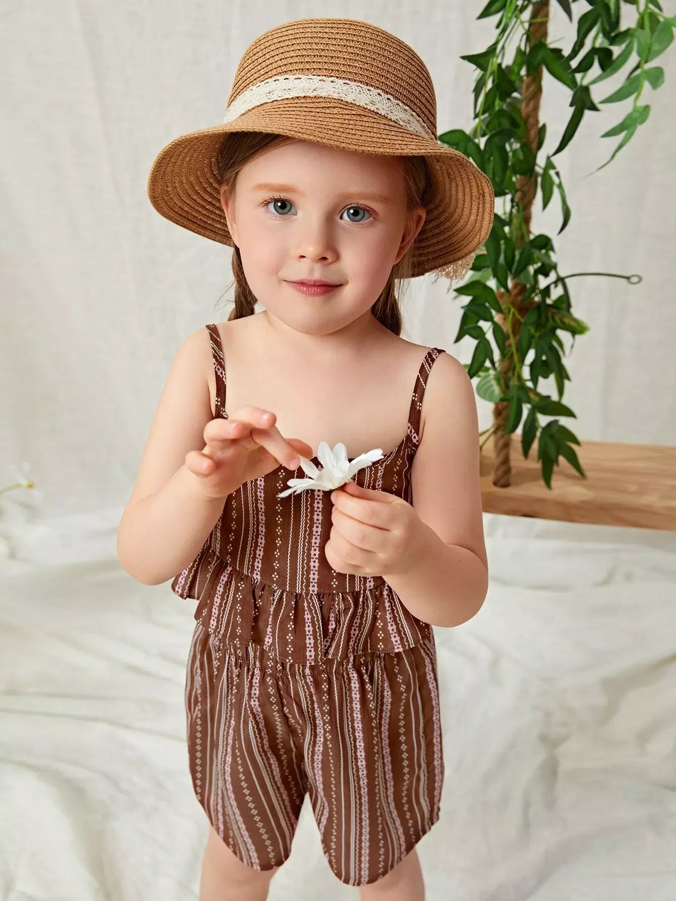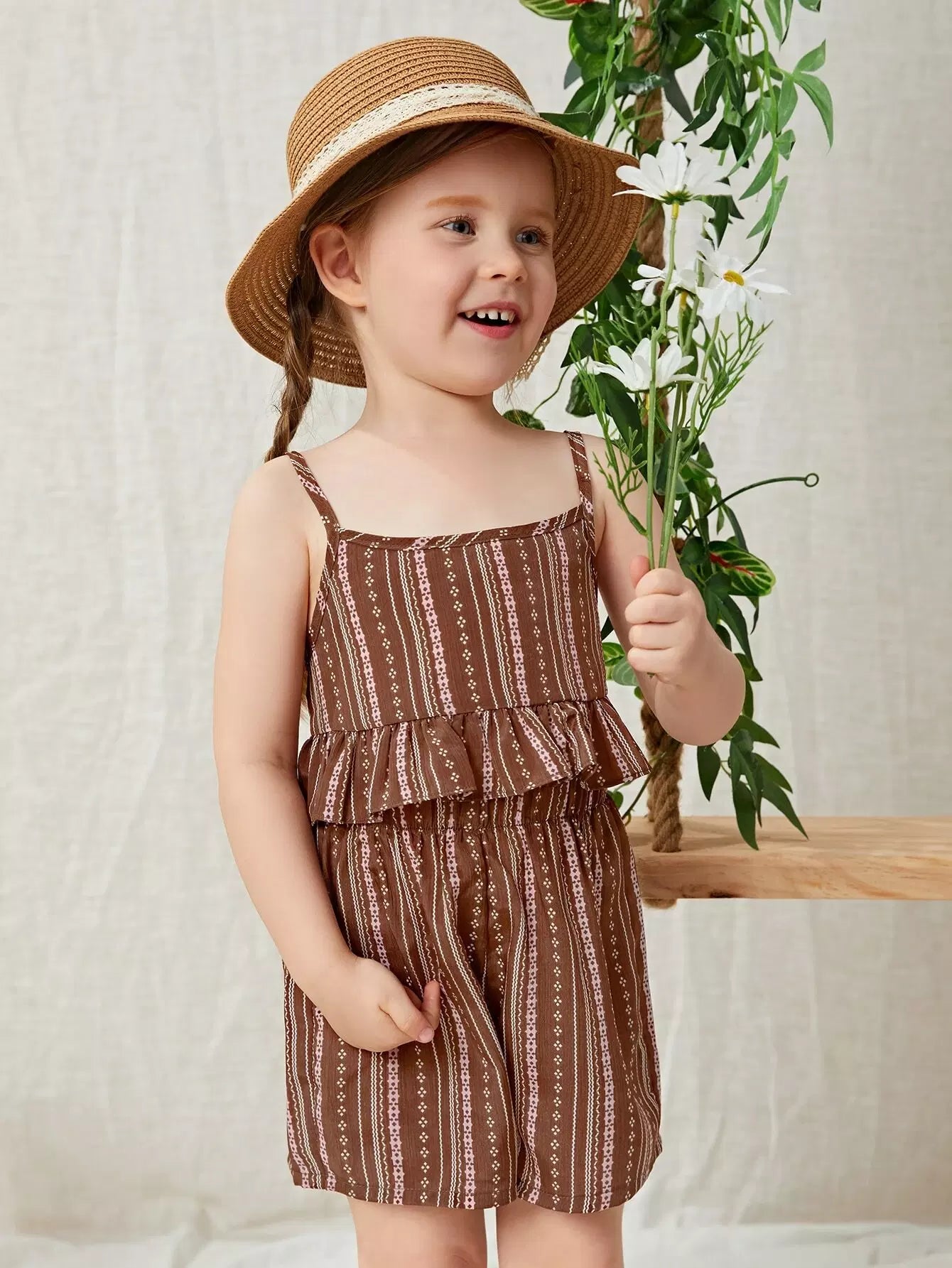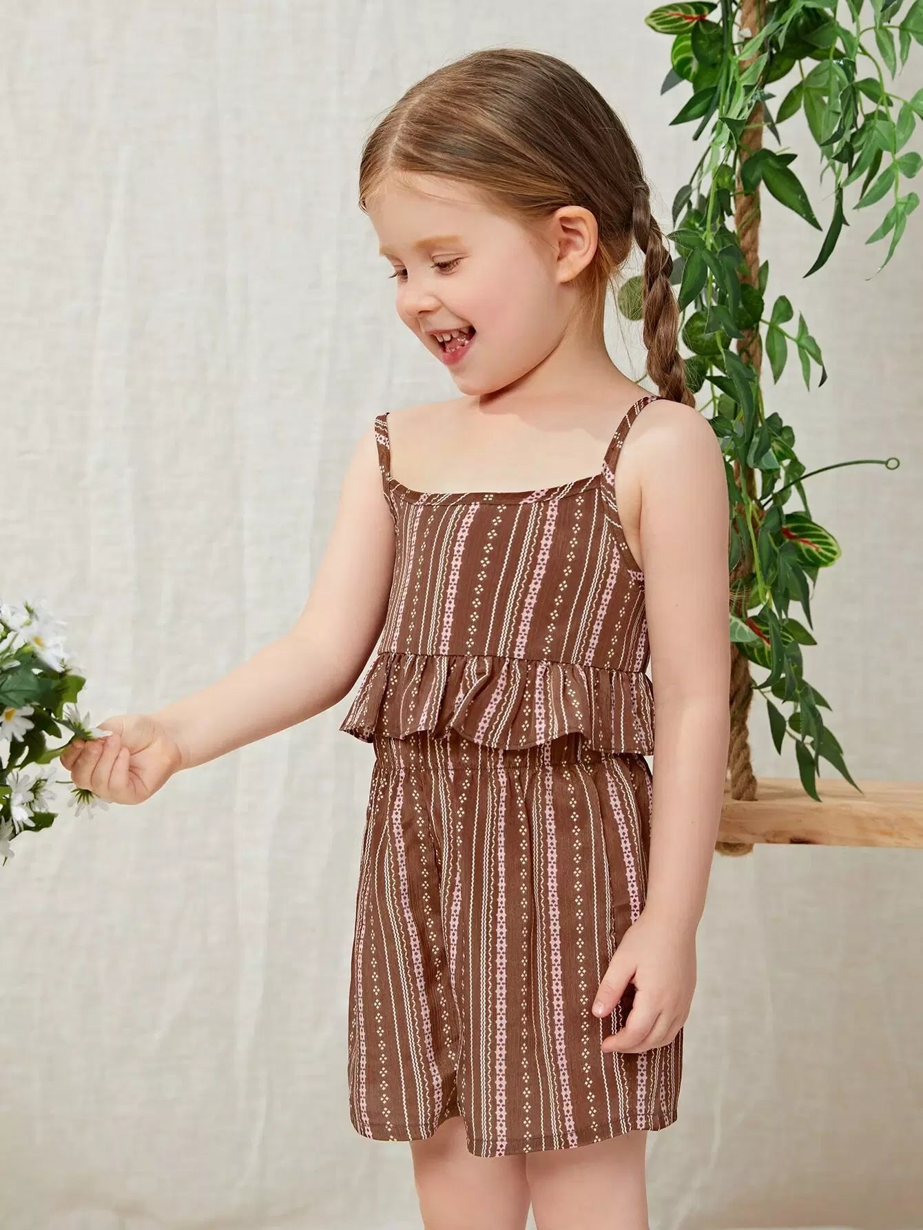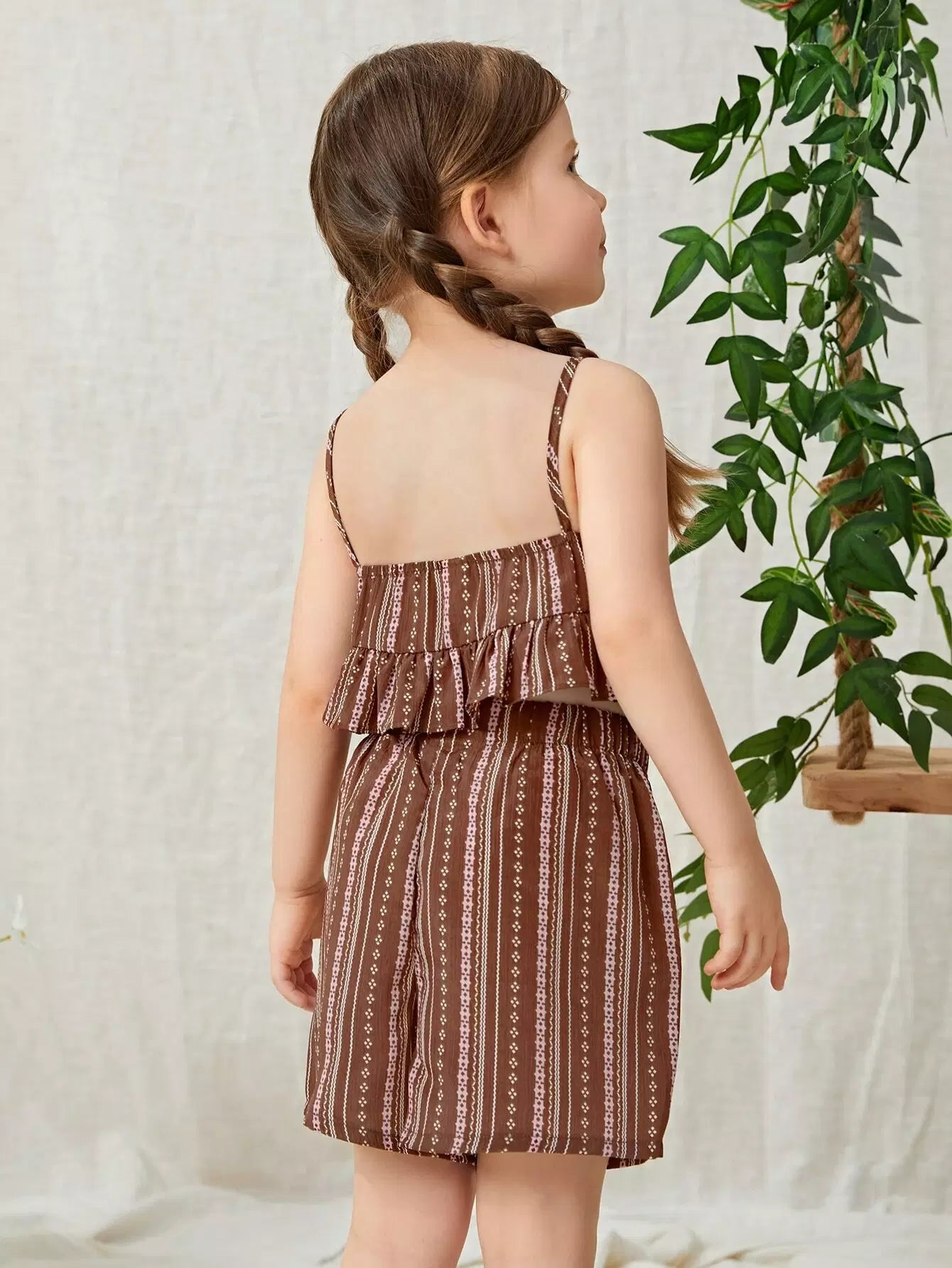 طقم من بلوزة وشورت مخطط بحاشية مكشكشة للبنات الصغار
