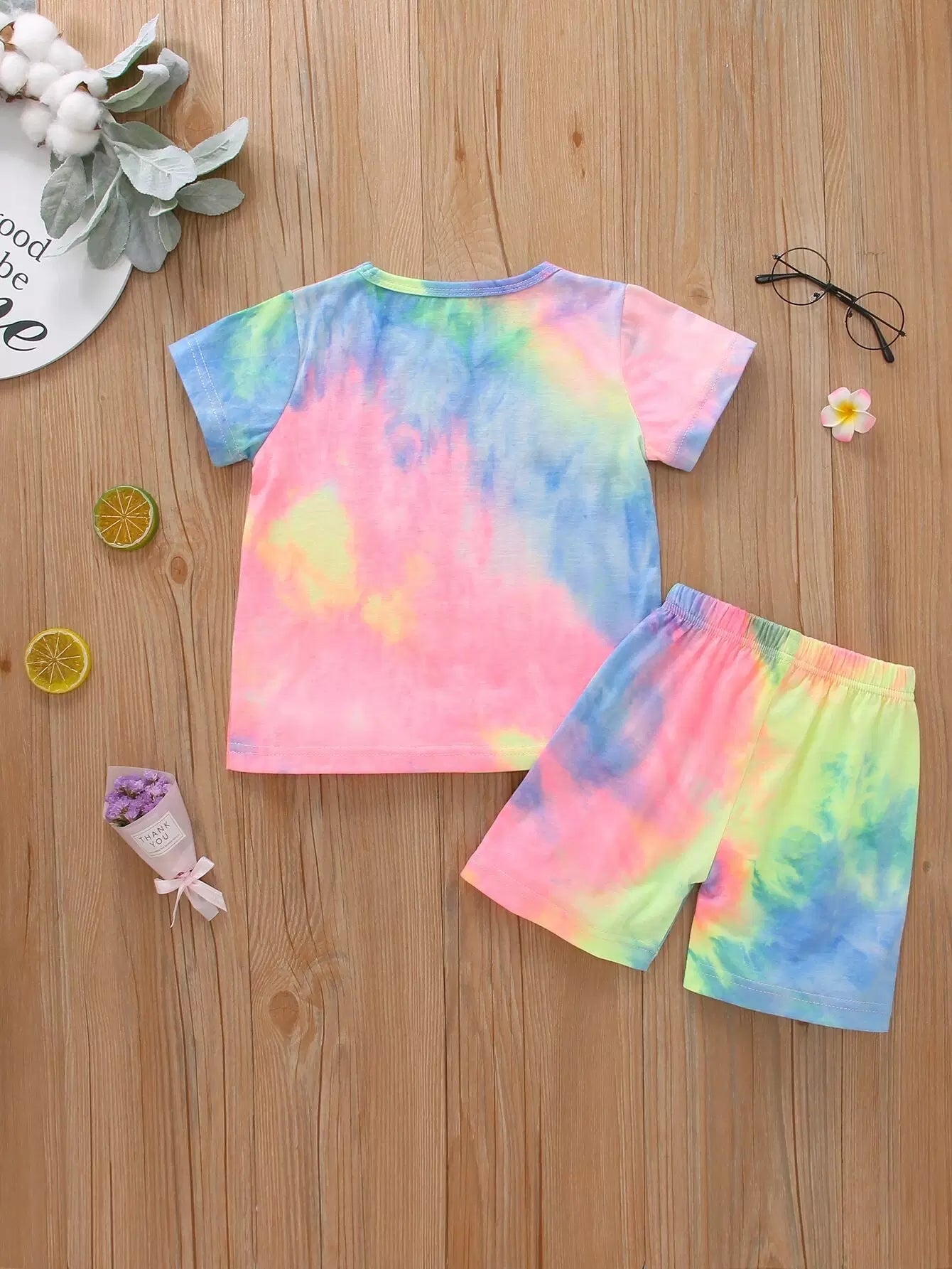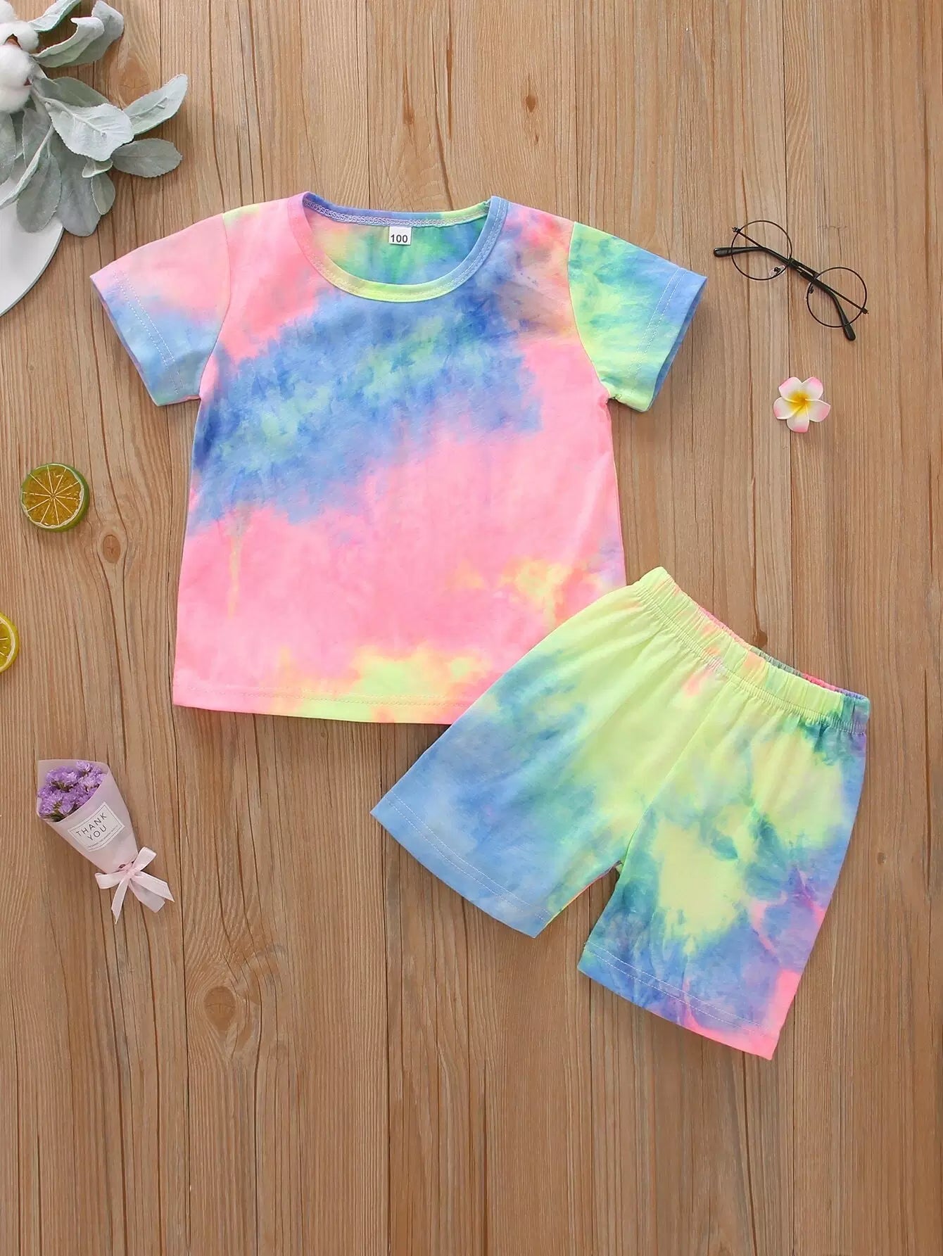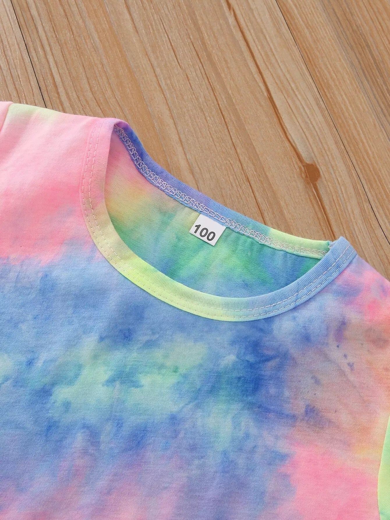 تيشيرت وبنات صغيرات بقميص وشورت مصبوغ بصبغة تي شيرت