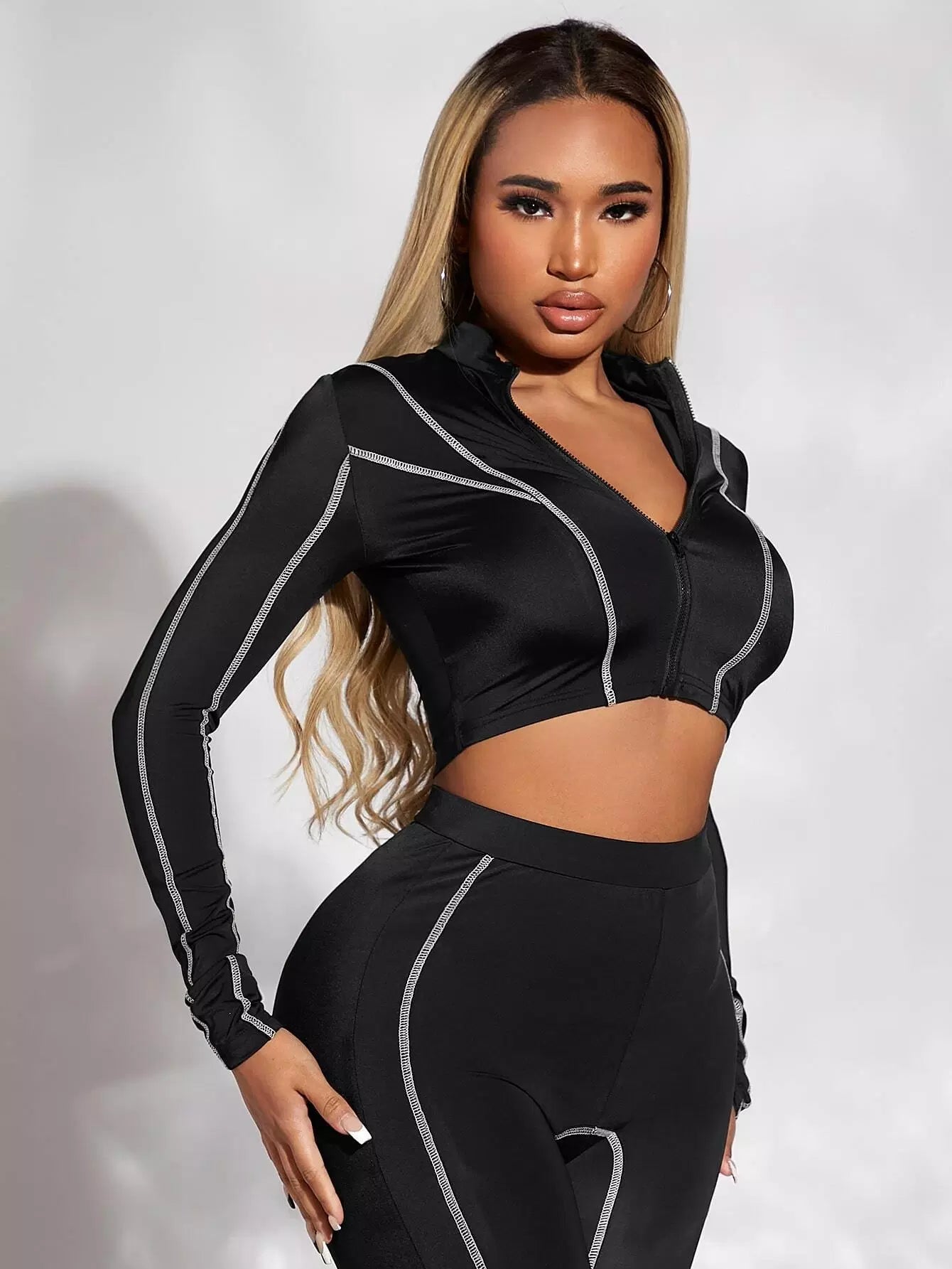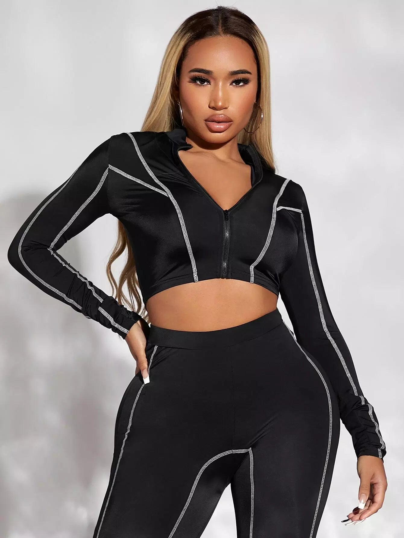 جاكيت وبنطلون ضيق بخياطة علوية بسحاب من الأمام