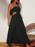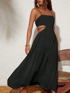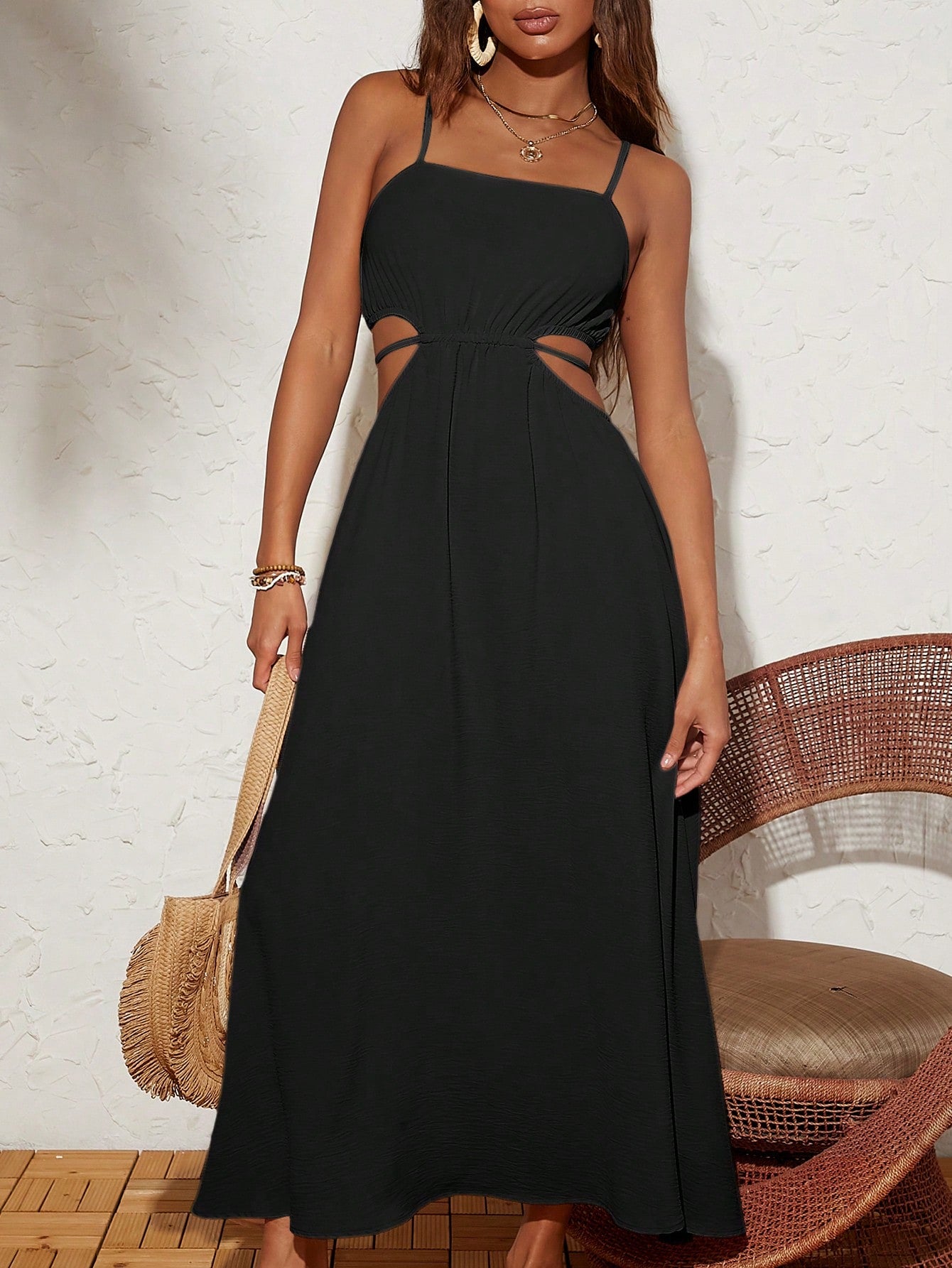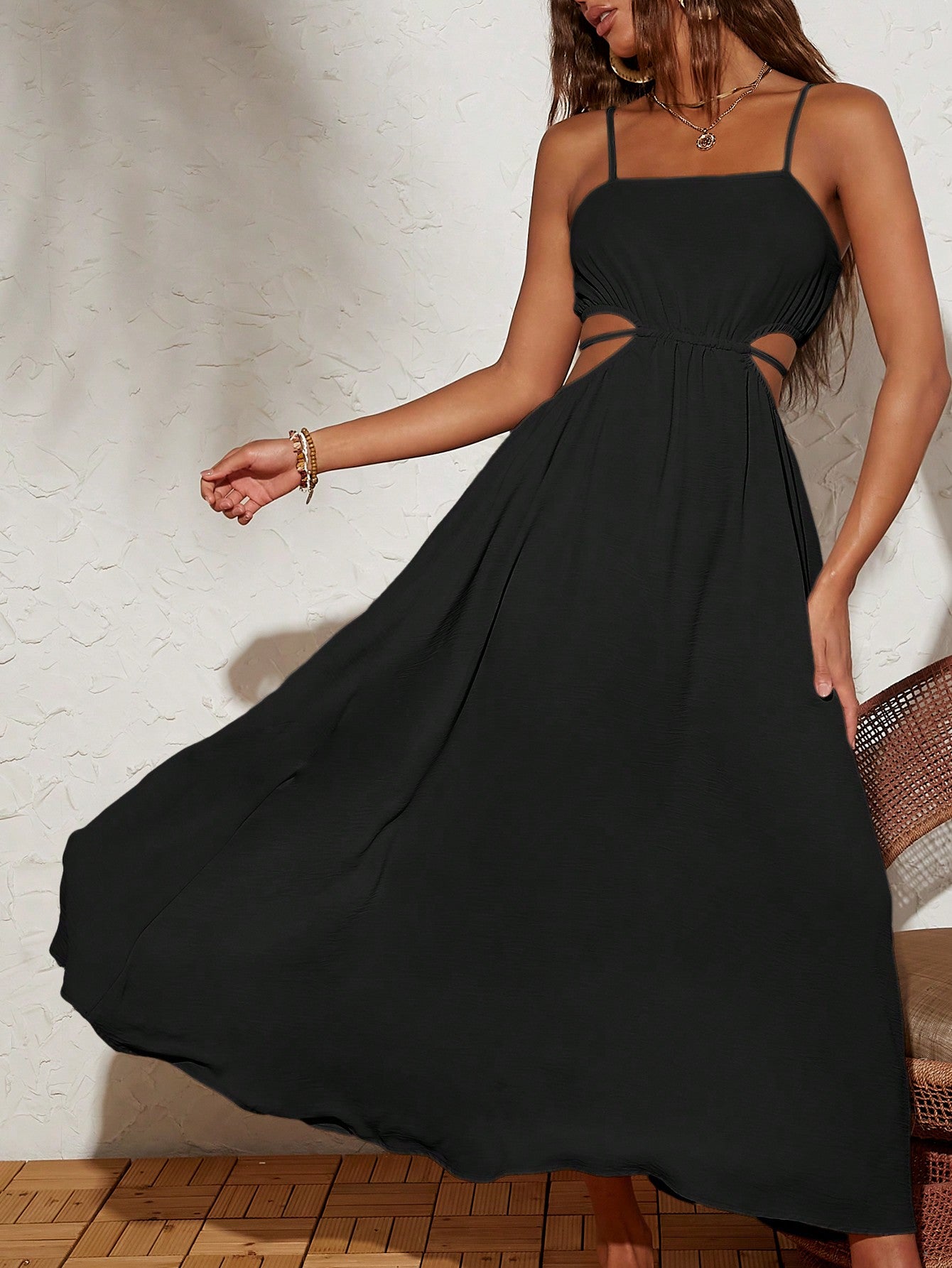 Travachic Solid Color Woven Hollow Out Waist Tie Straps Dress For Vacation