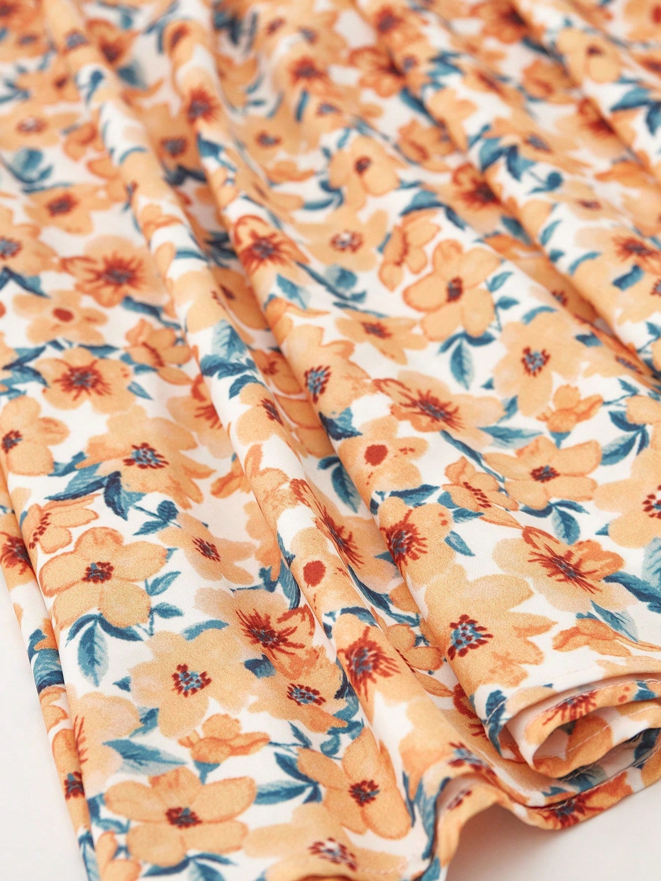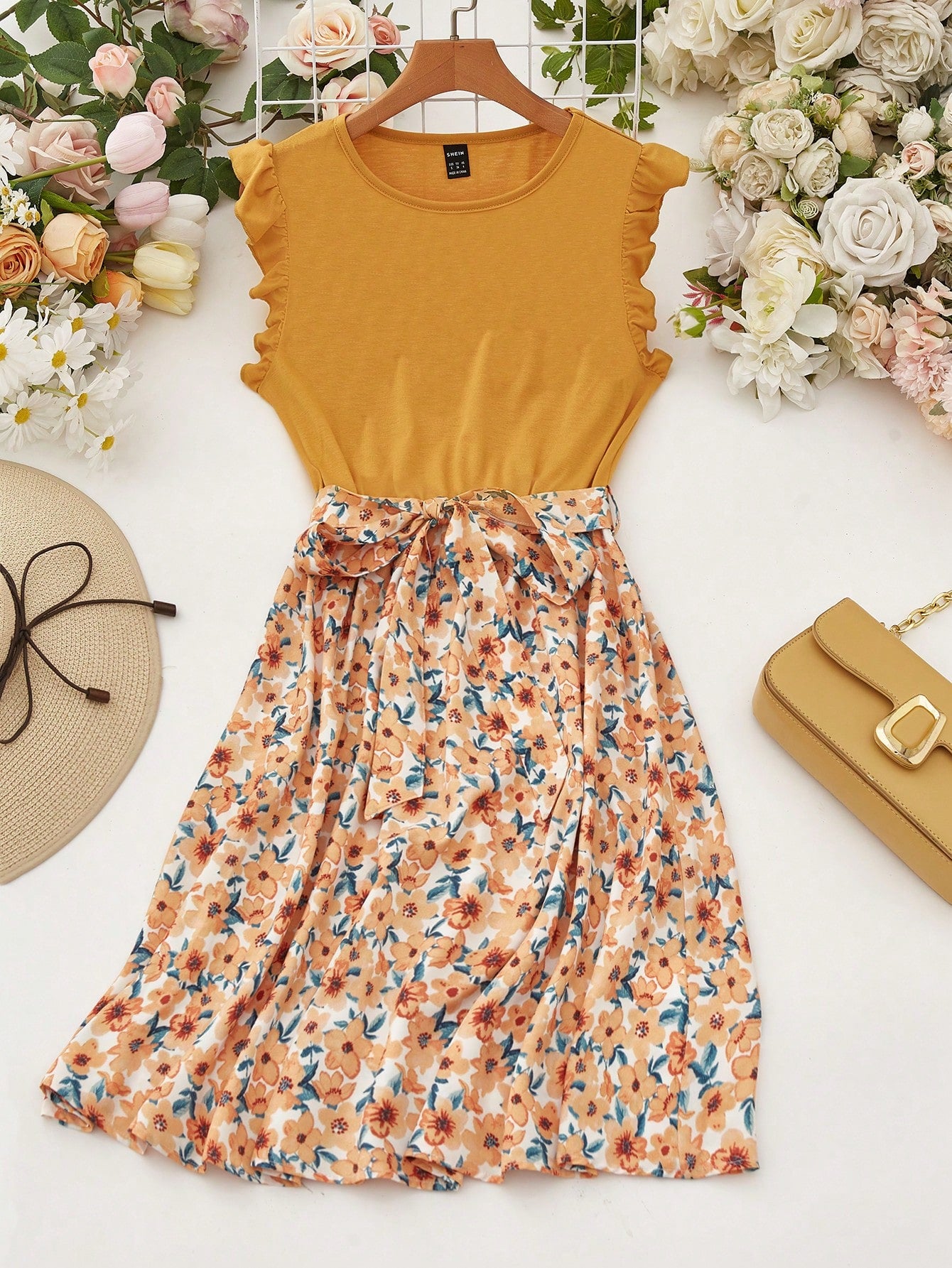 فستان نسائي من تريليرا بتصميم زهور صغيرة مزين بتطريزات، وحافة مكشكشة غير متماثلة، مثالي لإطلالة صيفية أنيقة على الشاطئ
