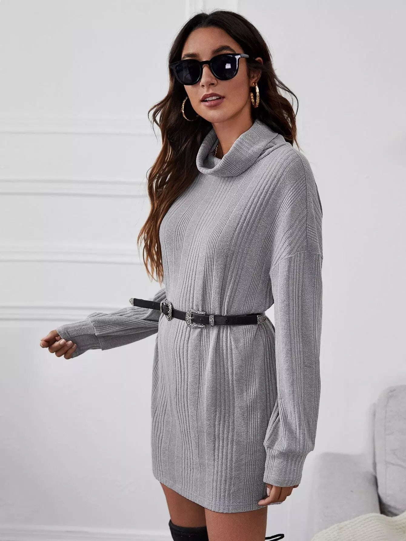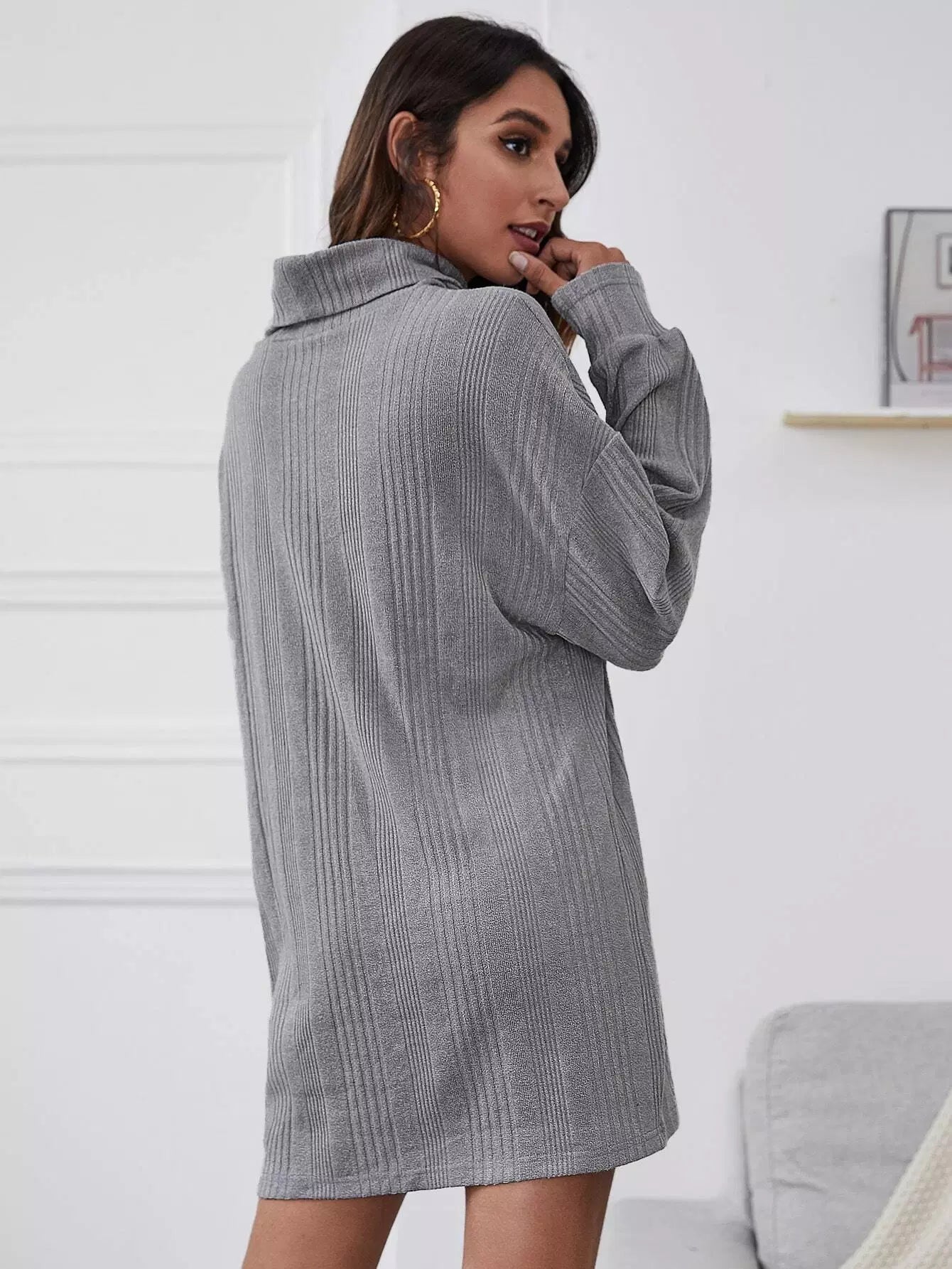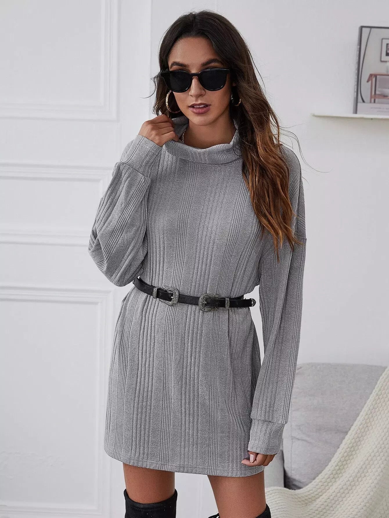 فستان سويت شيرت محبوك مضلع برقبة مدورة وأكتاف منسدلة بدون حزام