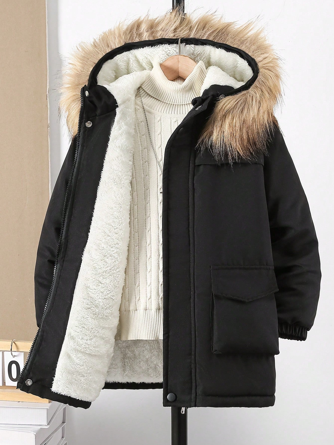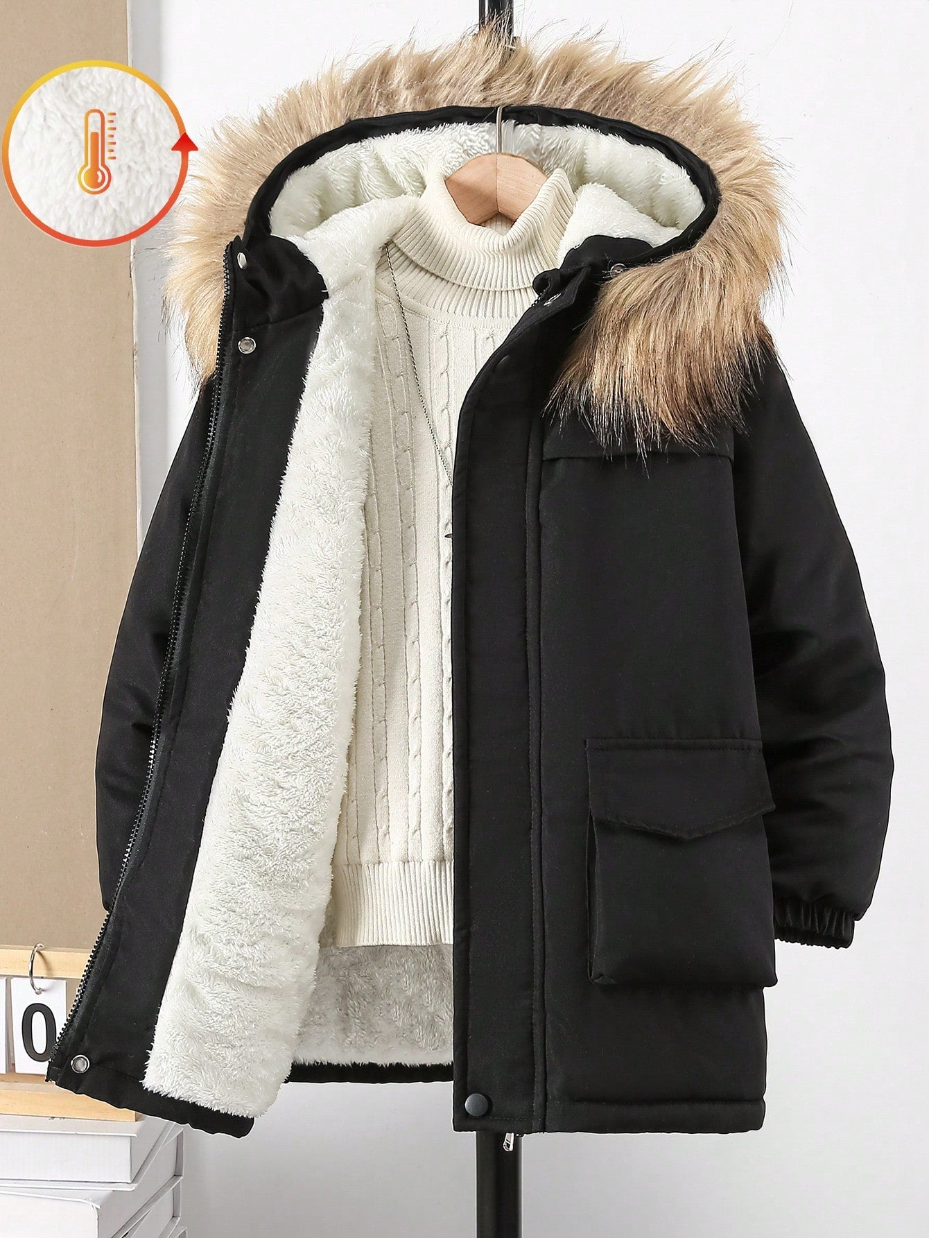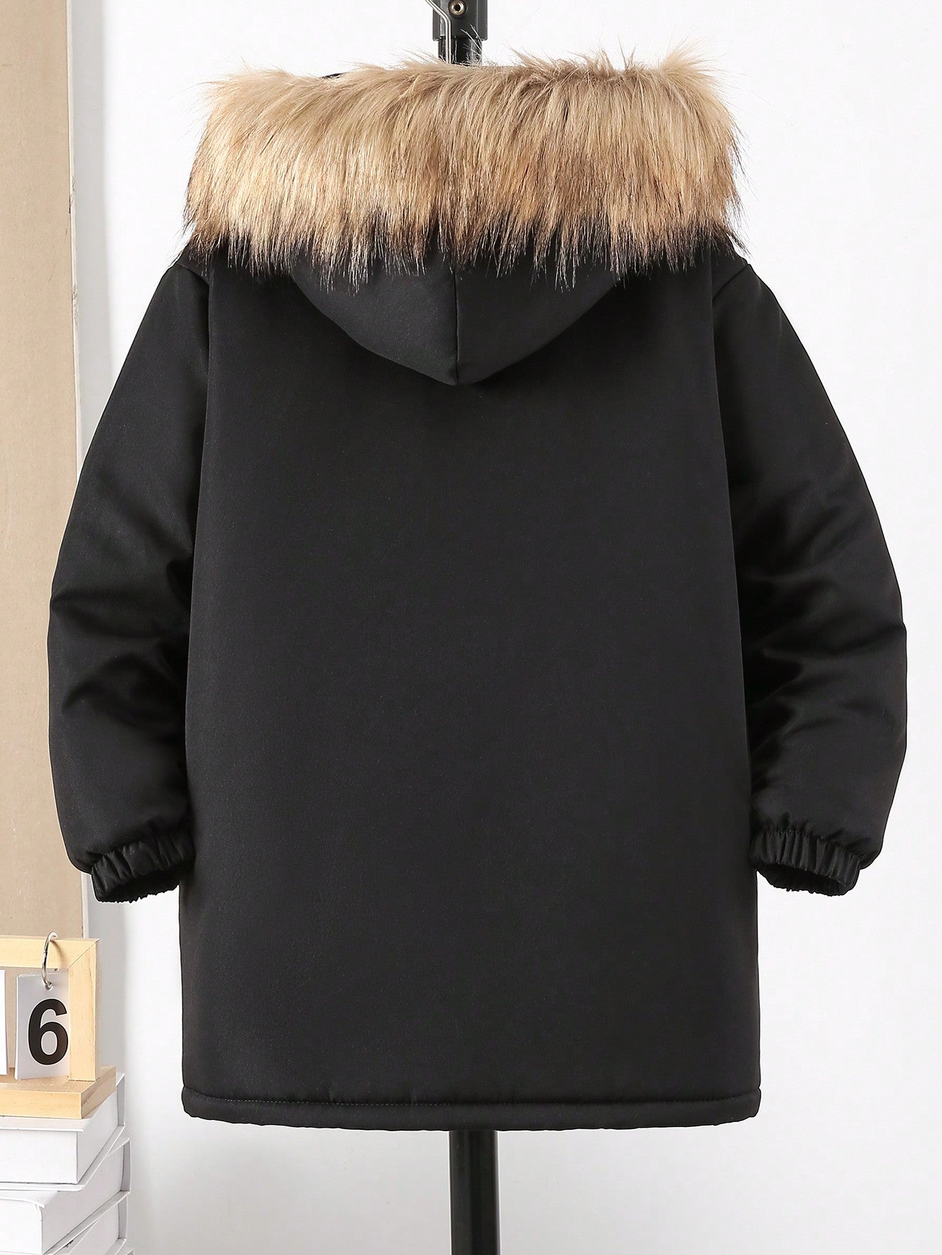 Tween Boy Winter Warm Casual Thermal Lined Zip-Up Patchwork Fluffy Hood Padded Coat
