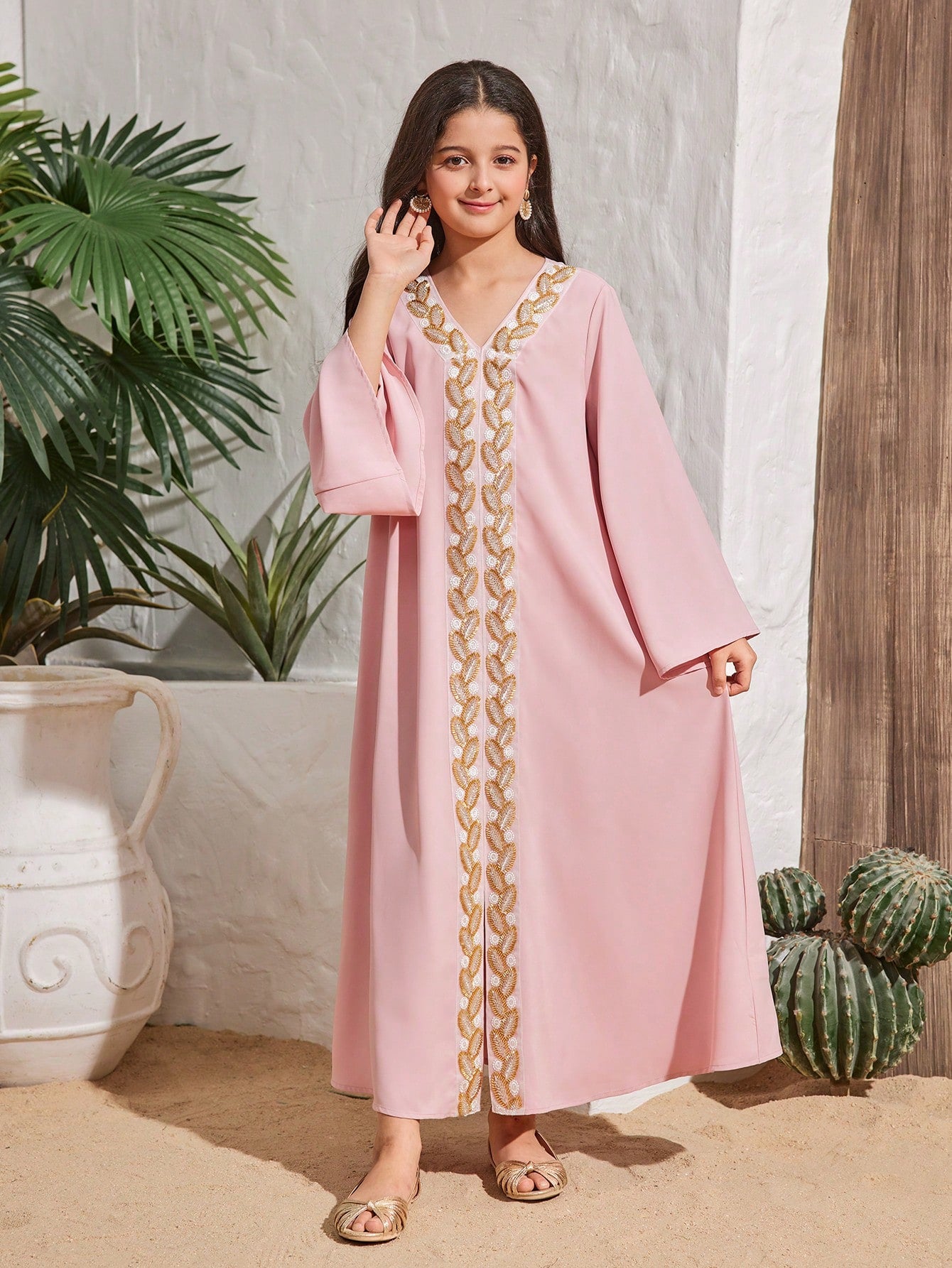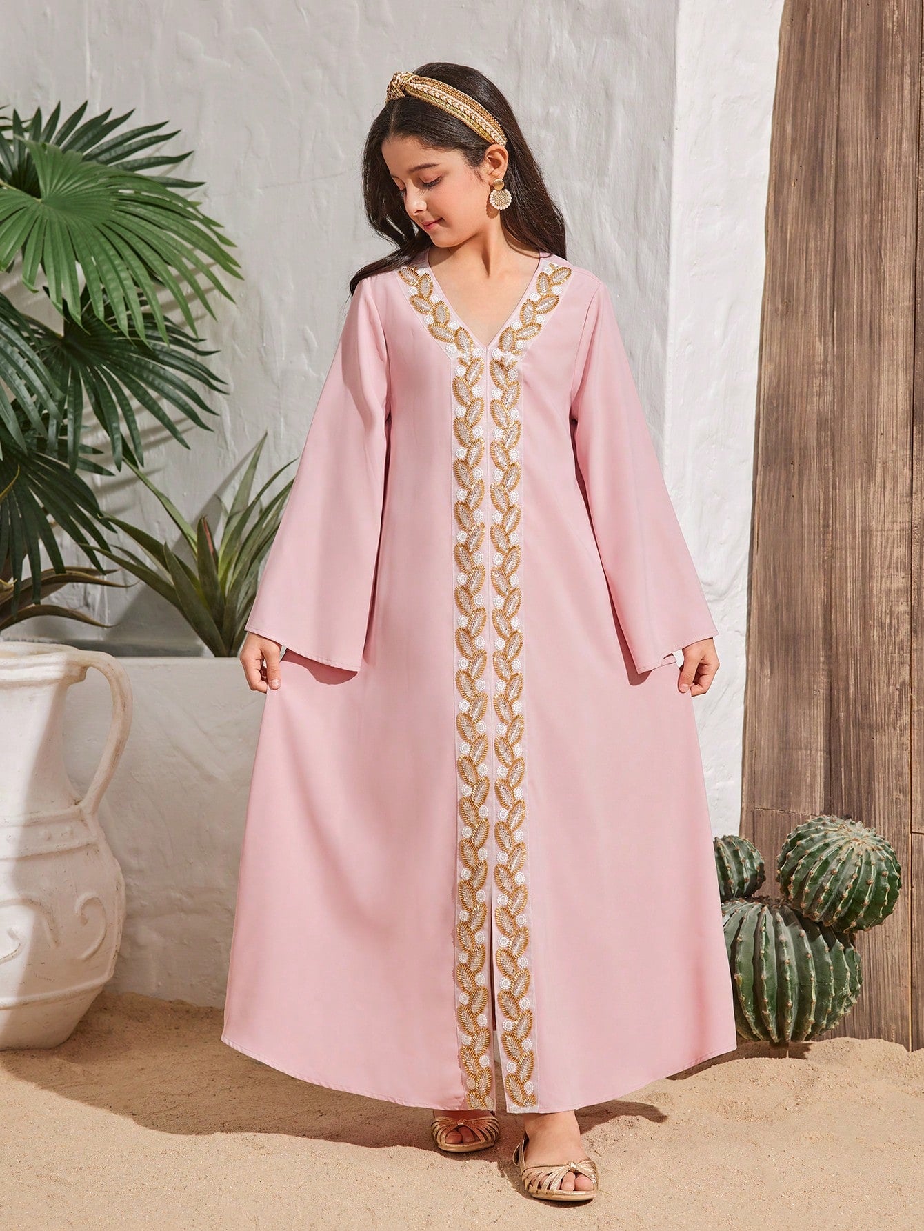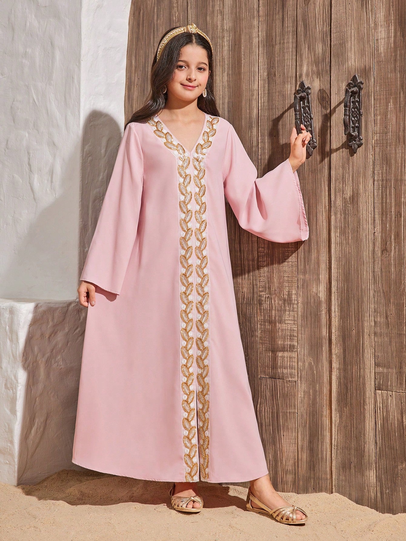 Tween Girl Elegant V-Neck Long Sleeve Midi Dress, Retro Style