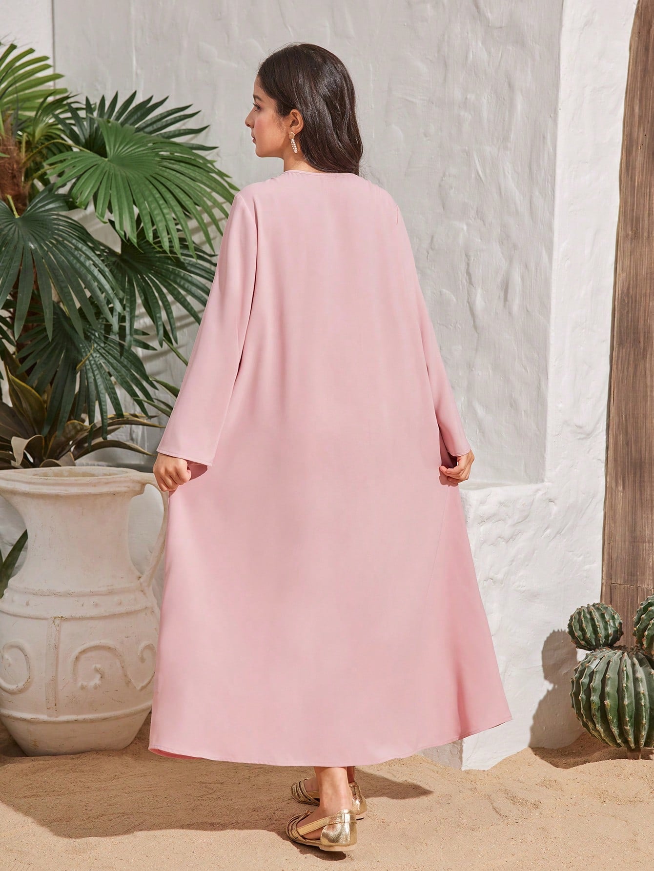 فستان متوسط الطول أنيق بأكمام طويلة ورقبة على شكل حرف V للفتيات المراهقات، بتصميم كلاسيكي