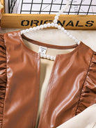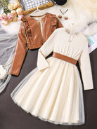 Tween Girl Long Sleeve Pu Leather Jacket With Mesh Dress Two Piece Set, Winter