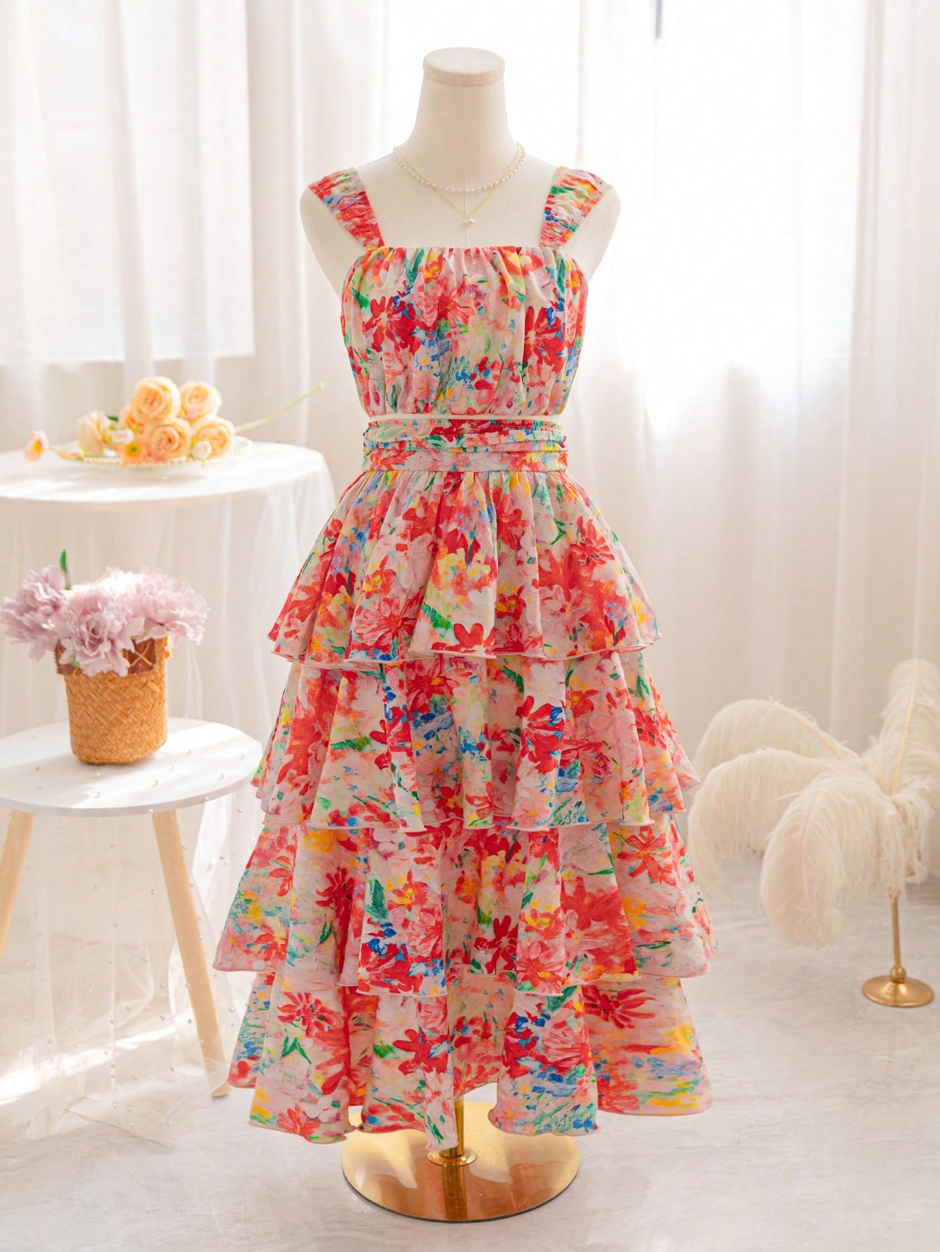 Tween Girls Casual Printed Layered Cake Skirt & Camisole 2 Pieces Outfit, Vacation Set