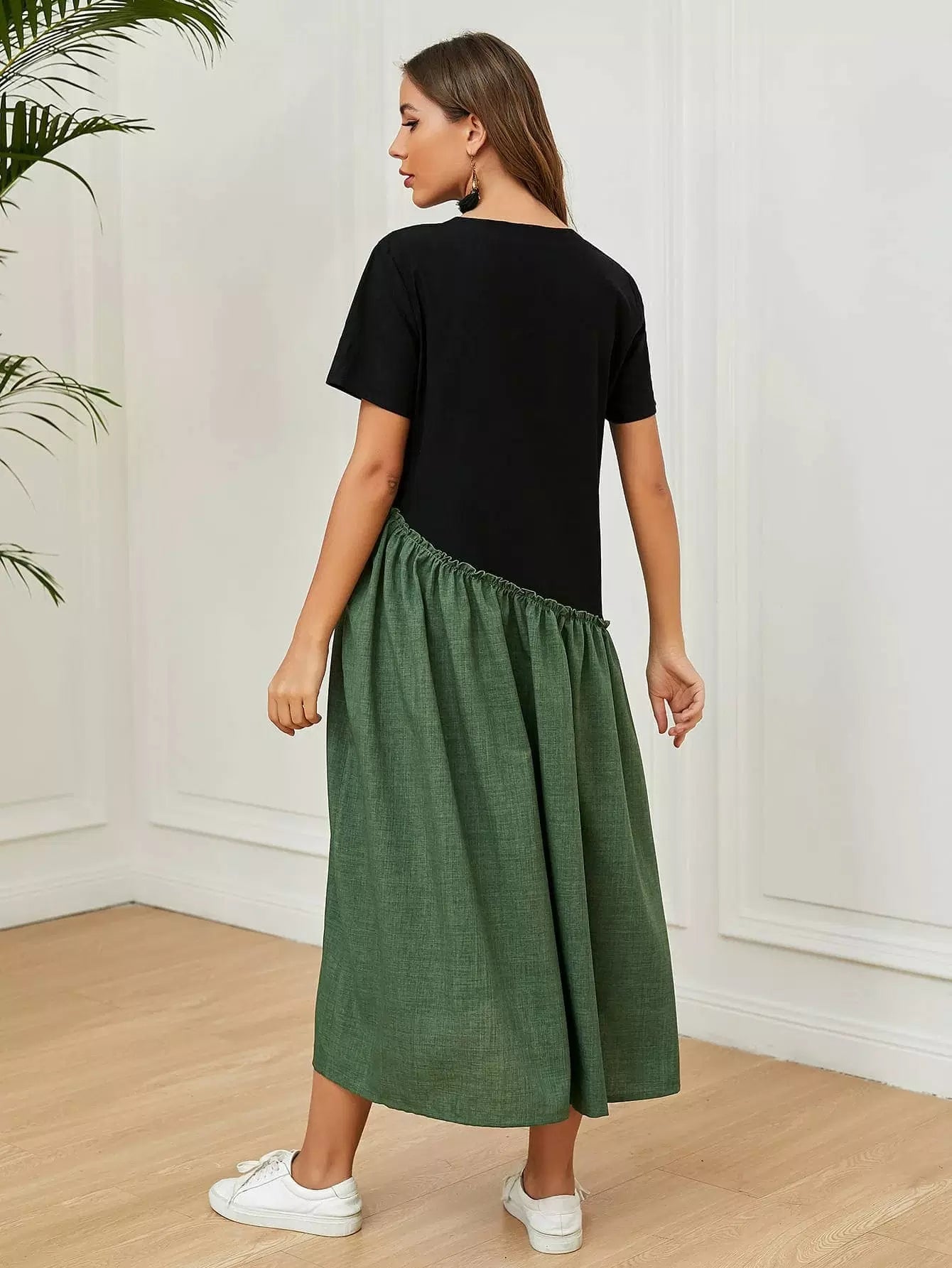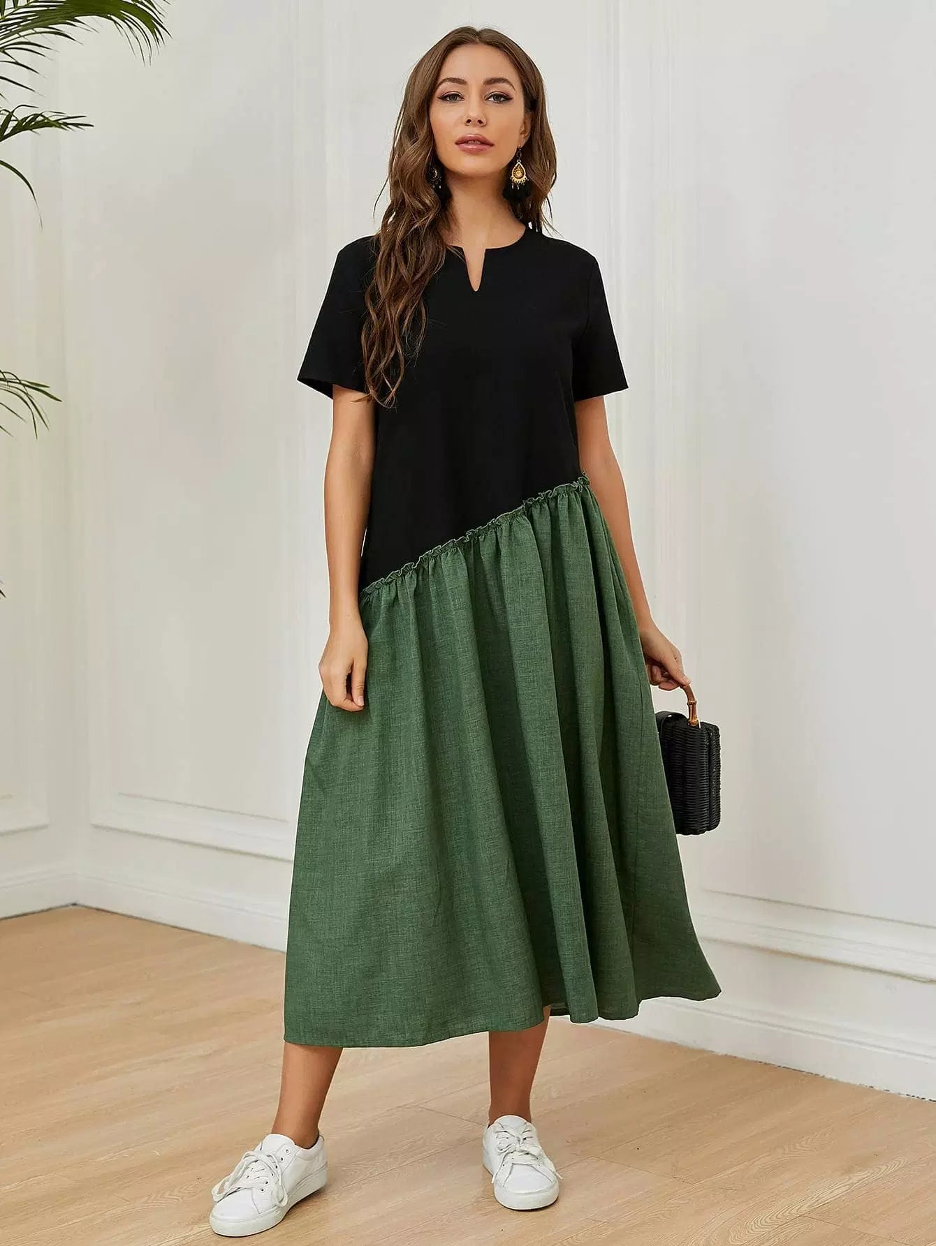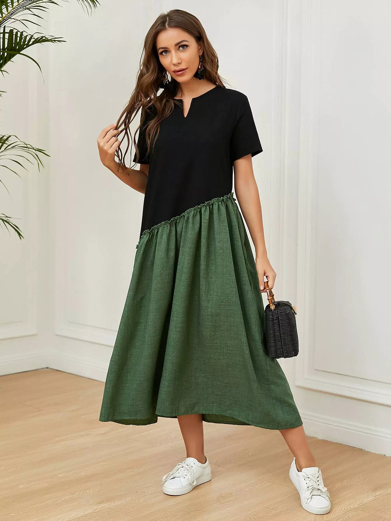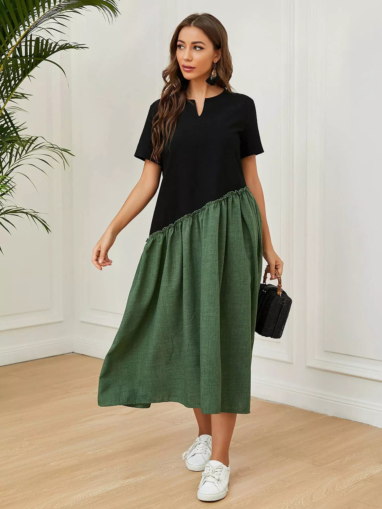 للنساء - فستان ذو حواف مكشكشة ورقبة مدببة بلونين