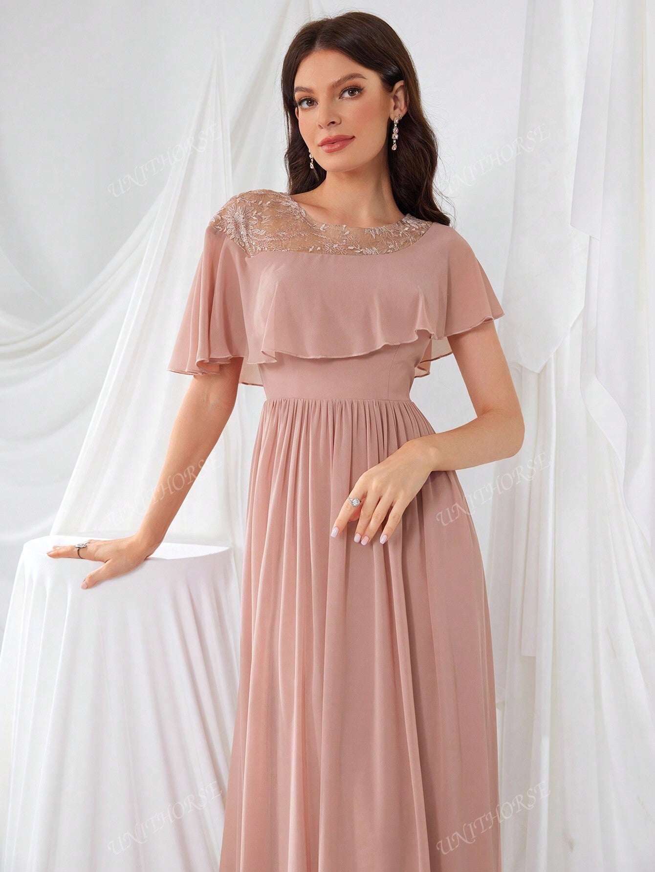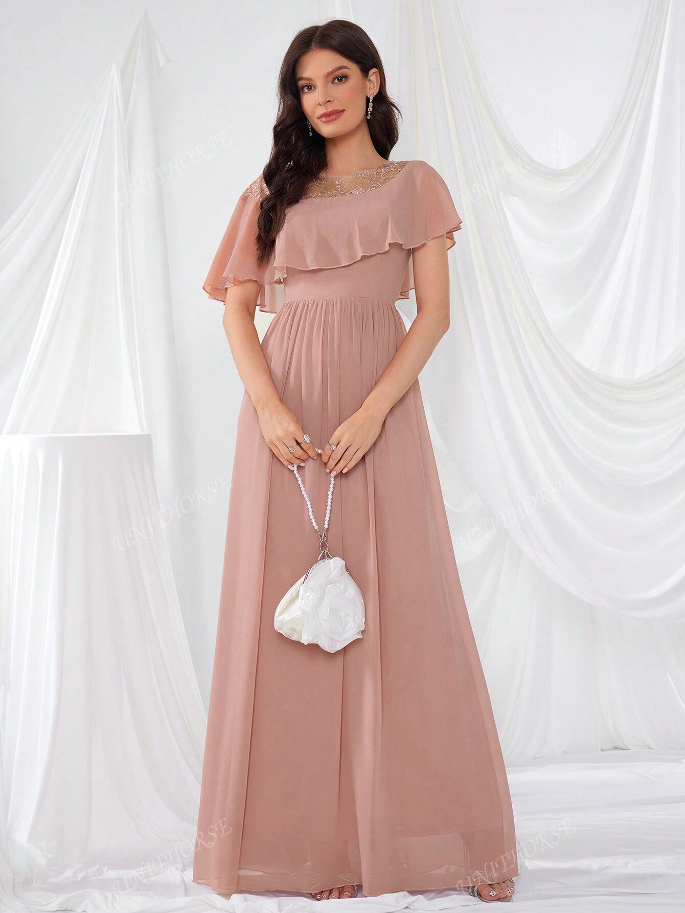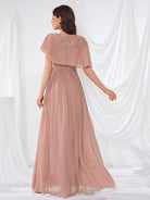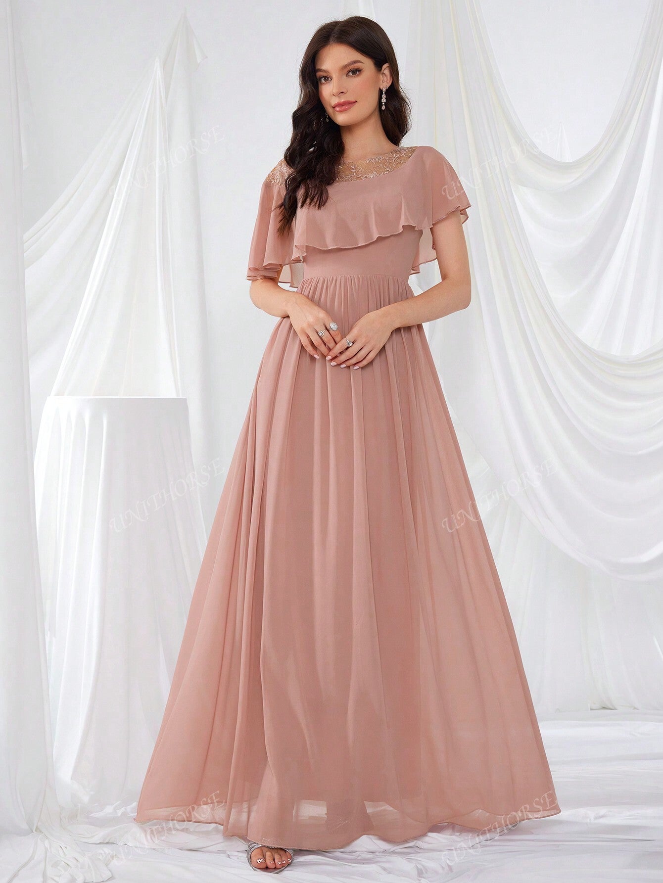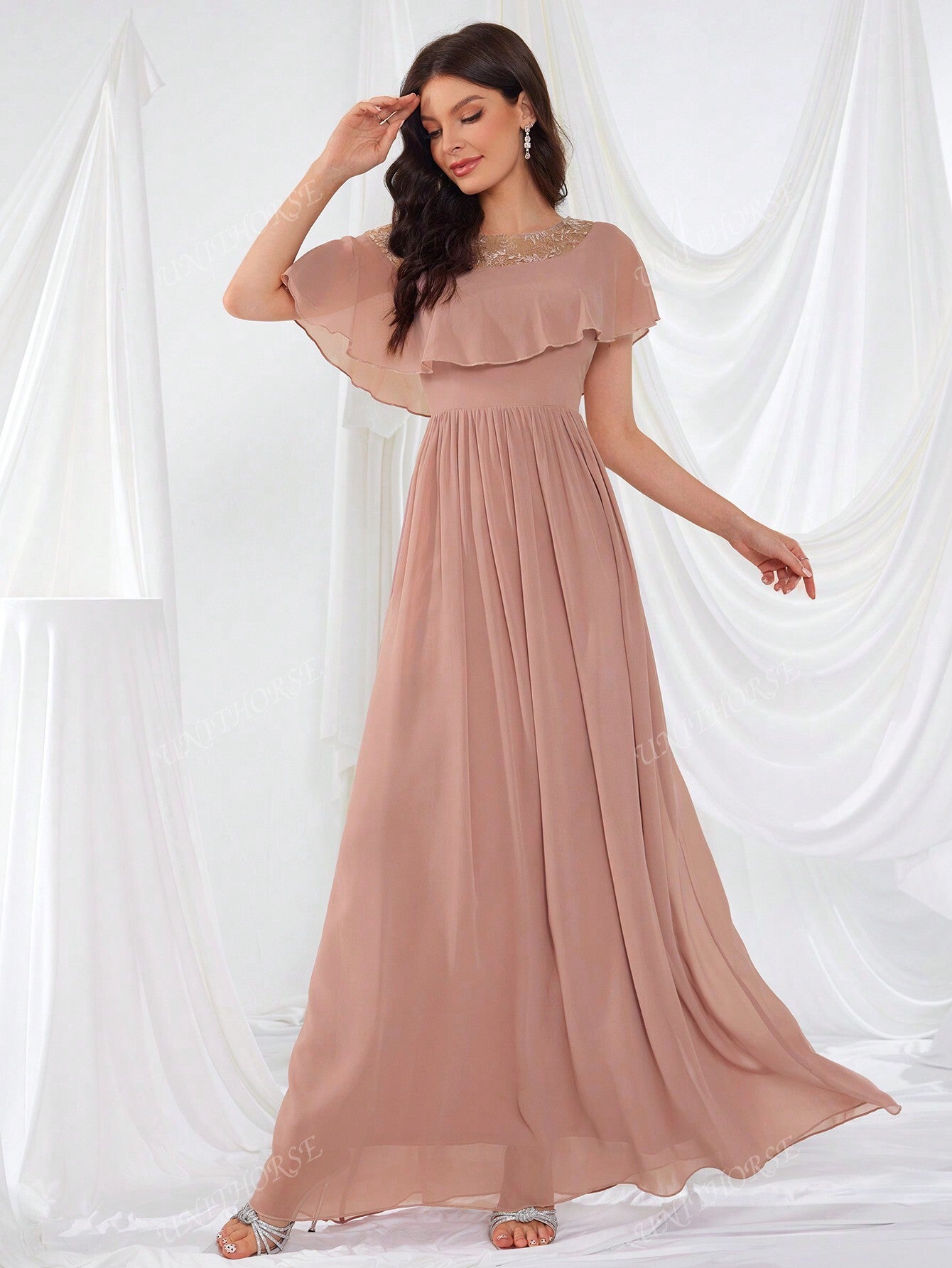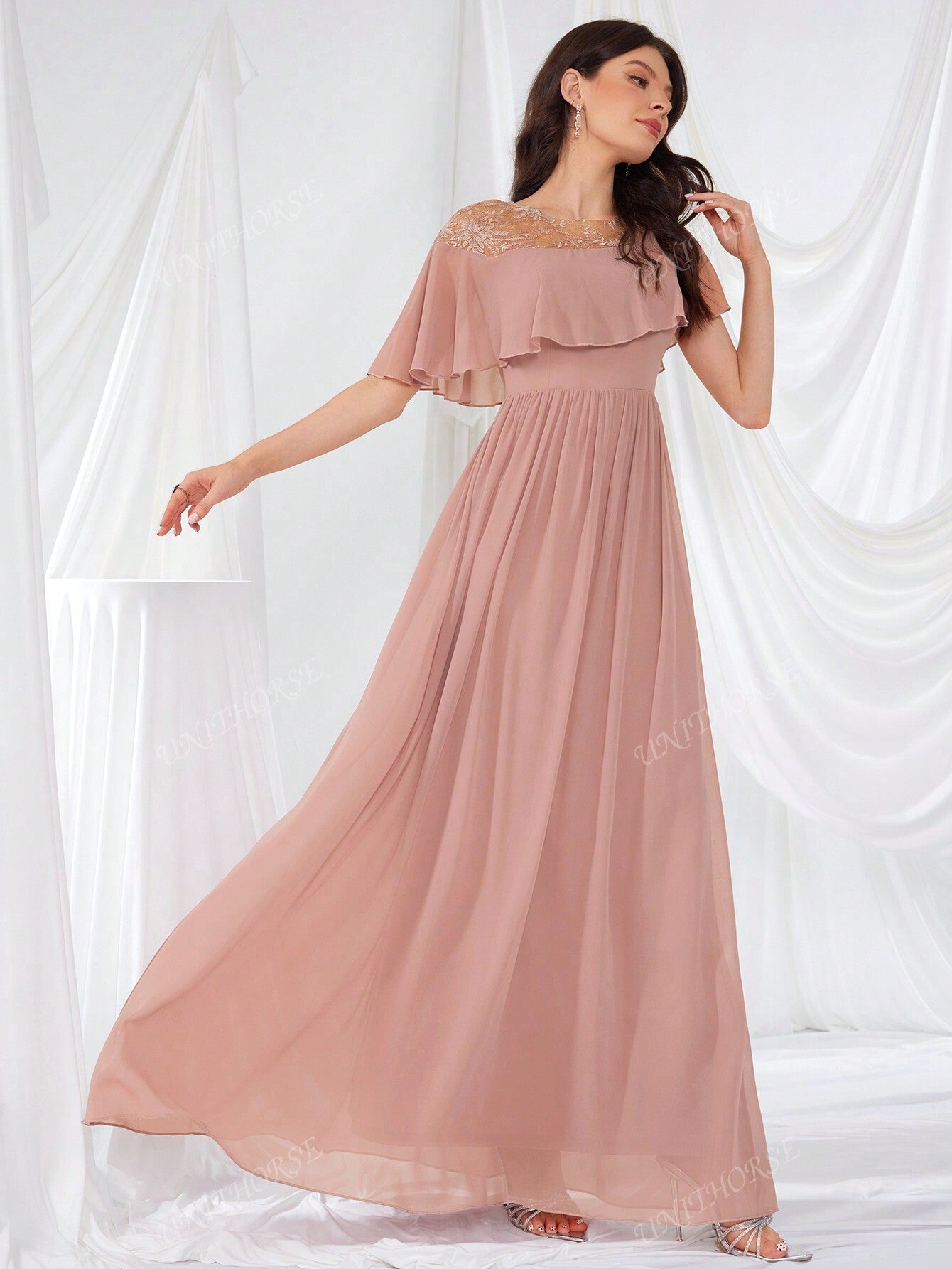 UNITHORSE Glimmering Embroidery Lotus Leaf Sleeve Chiffon Elegant Evening Dress Bridesmaid Dress