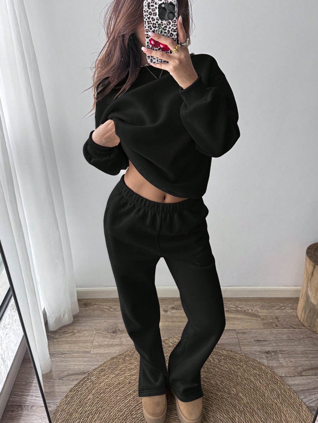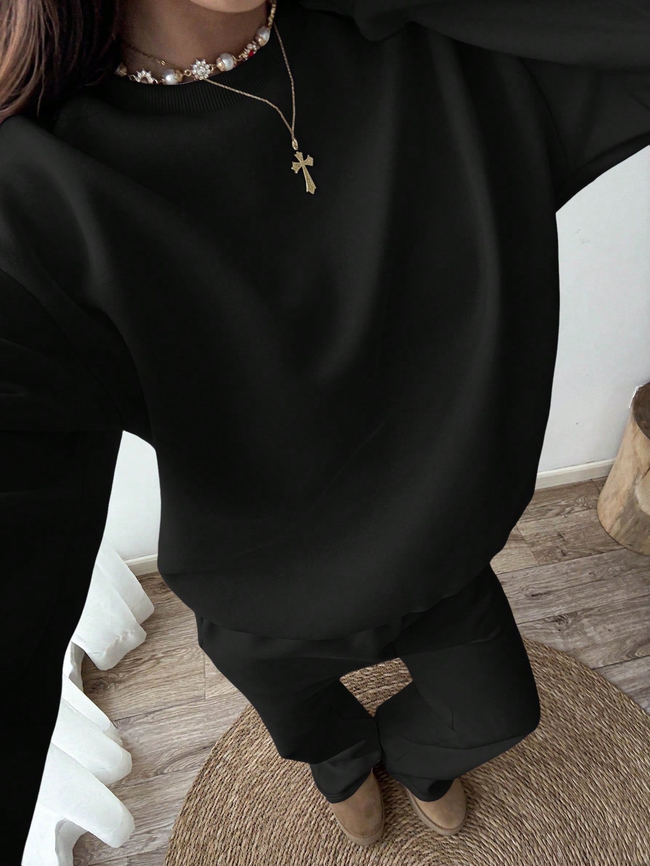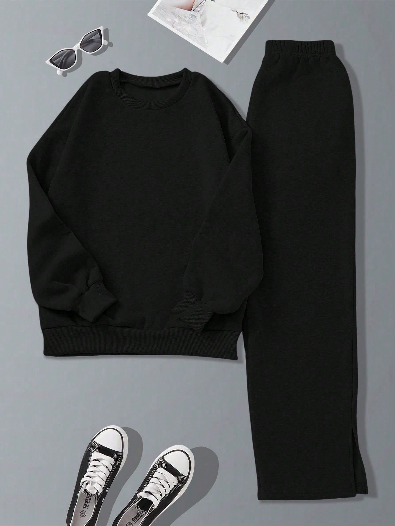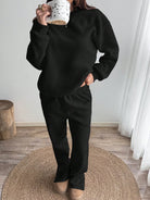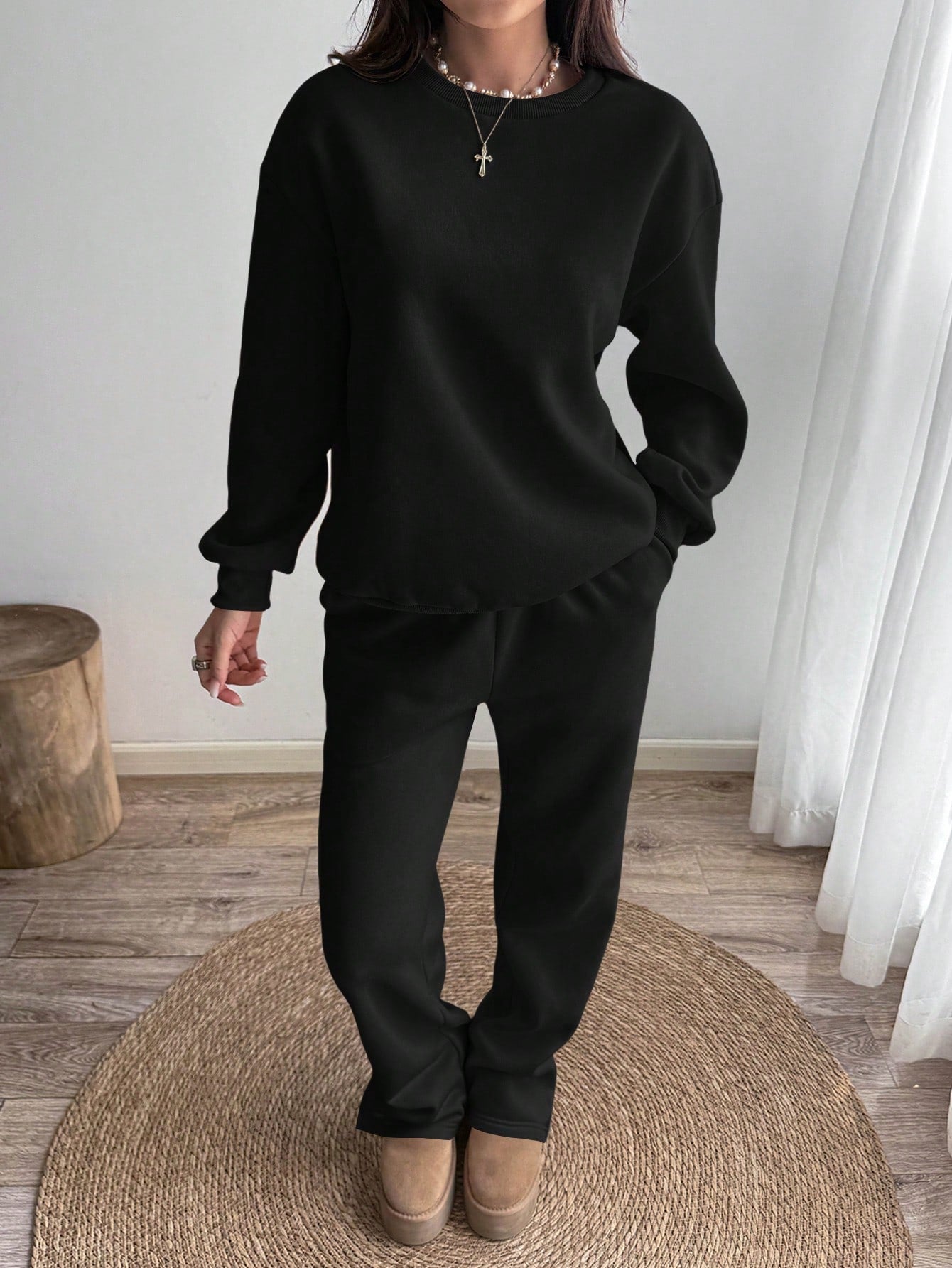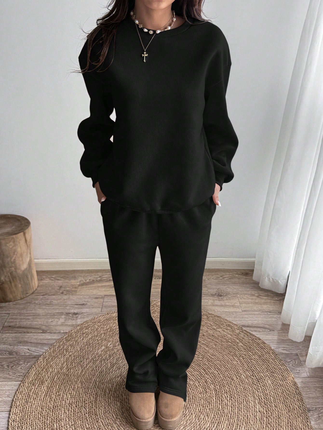 طقم رياضي كاجوال من الصوف بلون موحد، مكون من سويت شيرت وبنطال رياضي برقبة دائرية