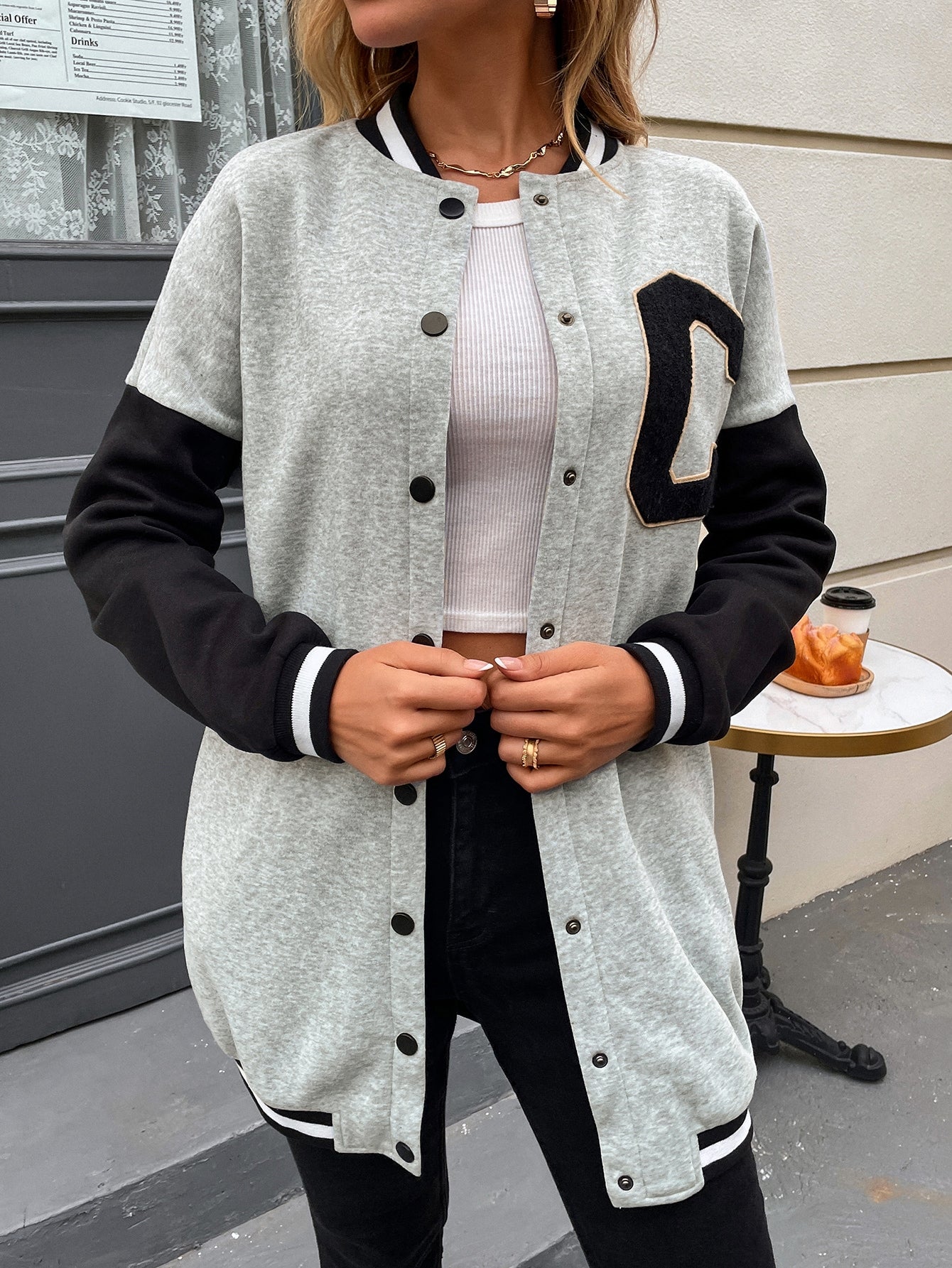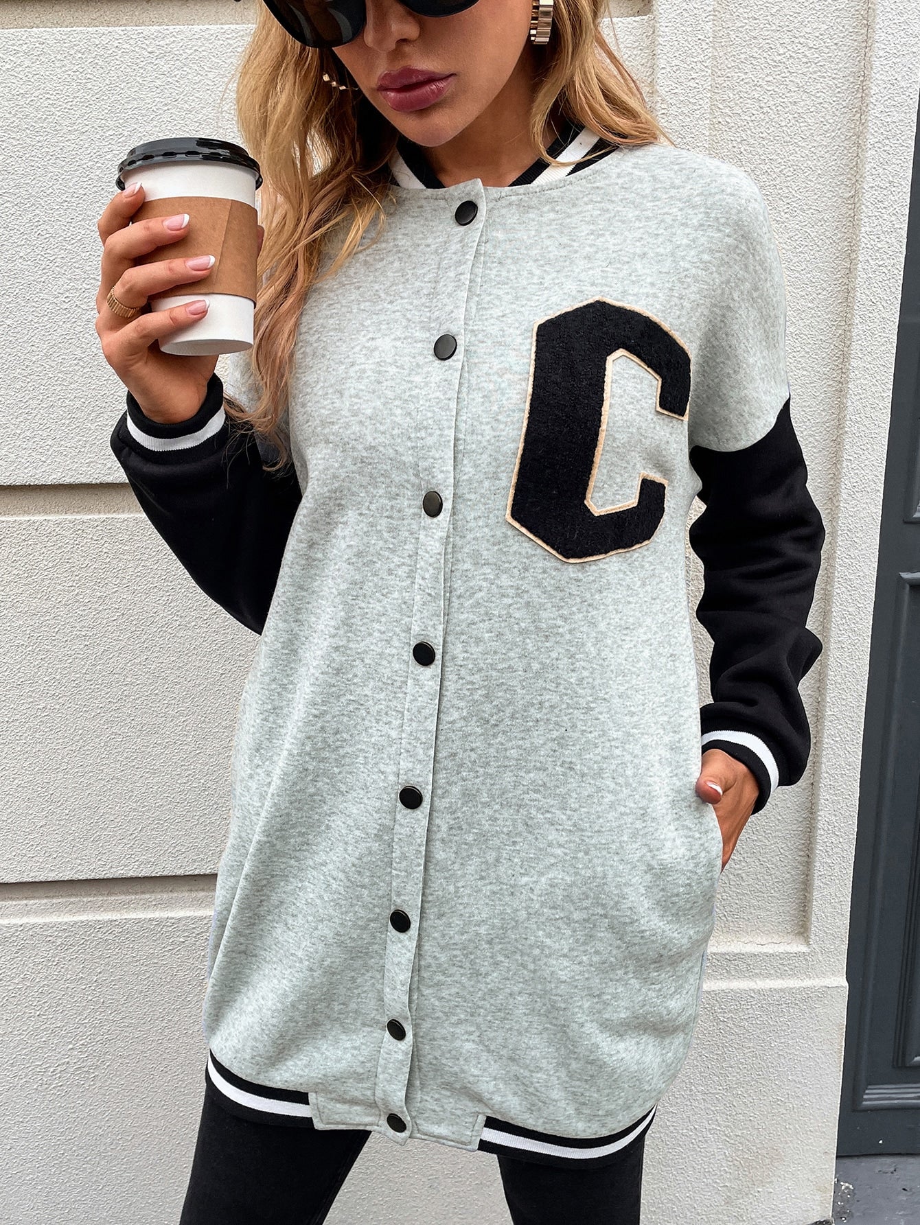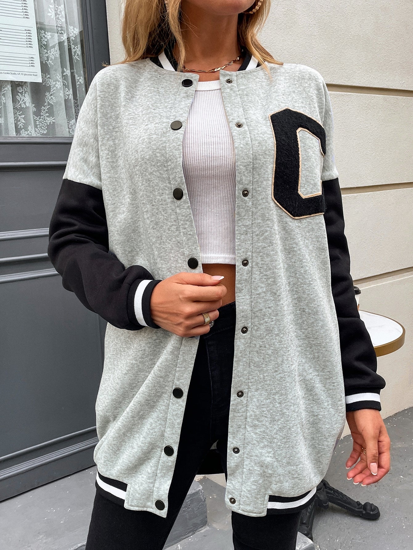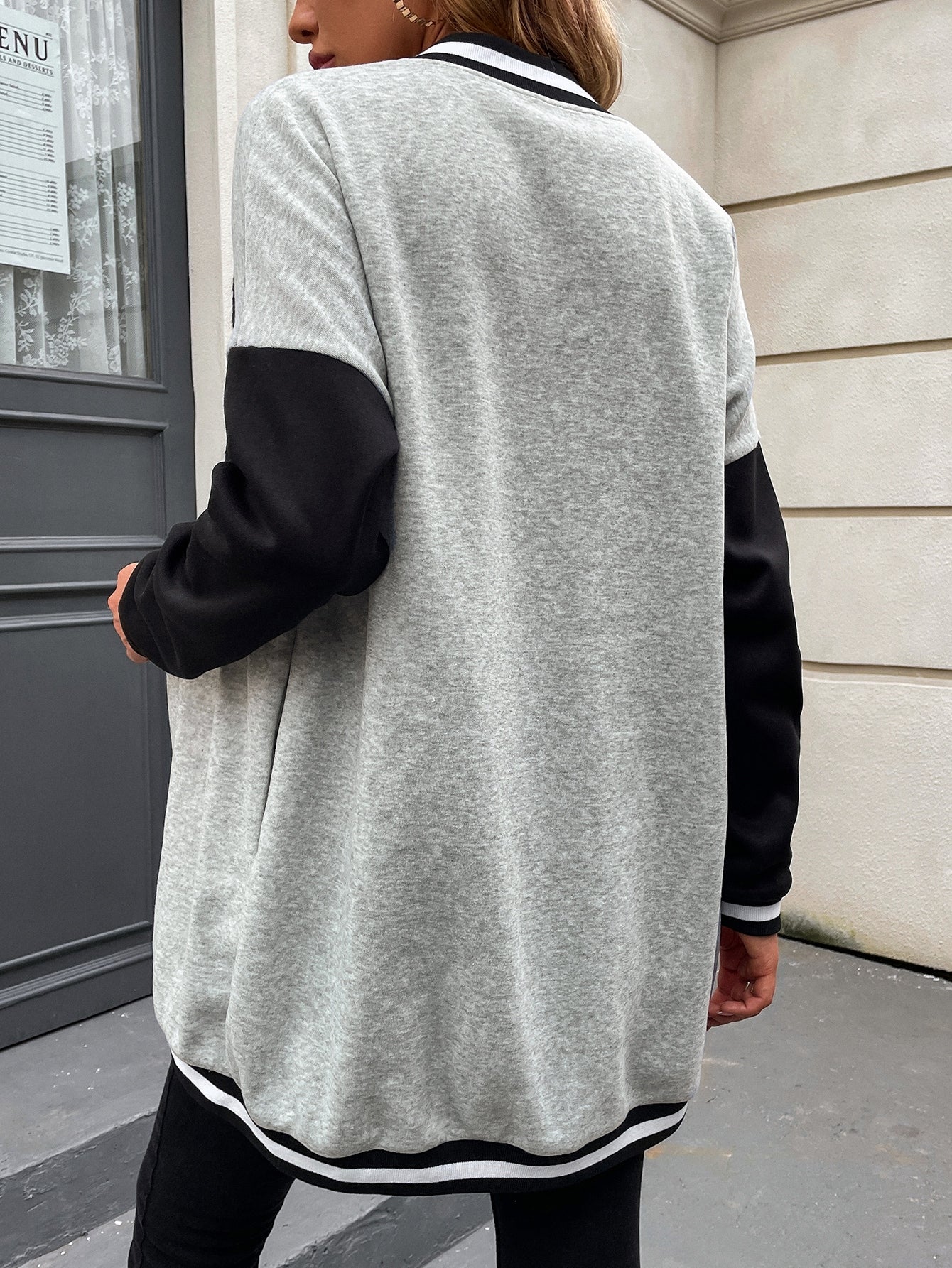 جاكيت رياضي نسائي بأكمام منسدلة وشعار الوحدة، مزين برقعة حروف، بألوان متداخلة، مناسب لفصلي الخريف والشتاء.