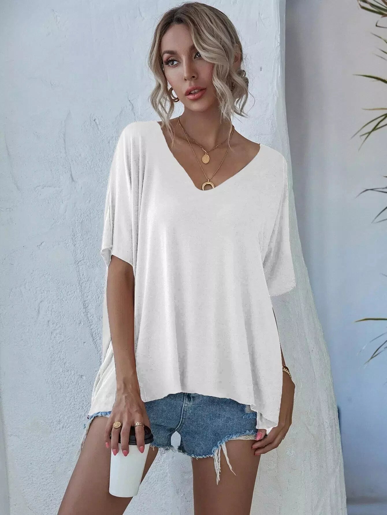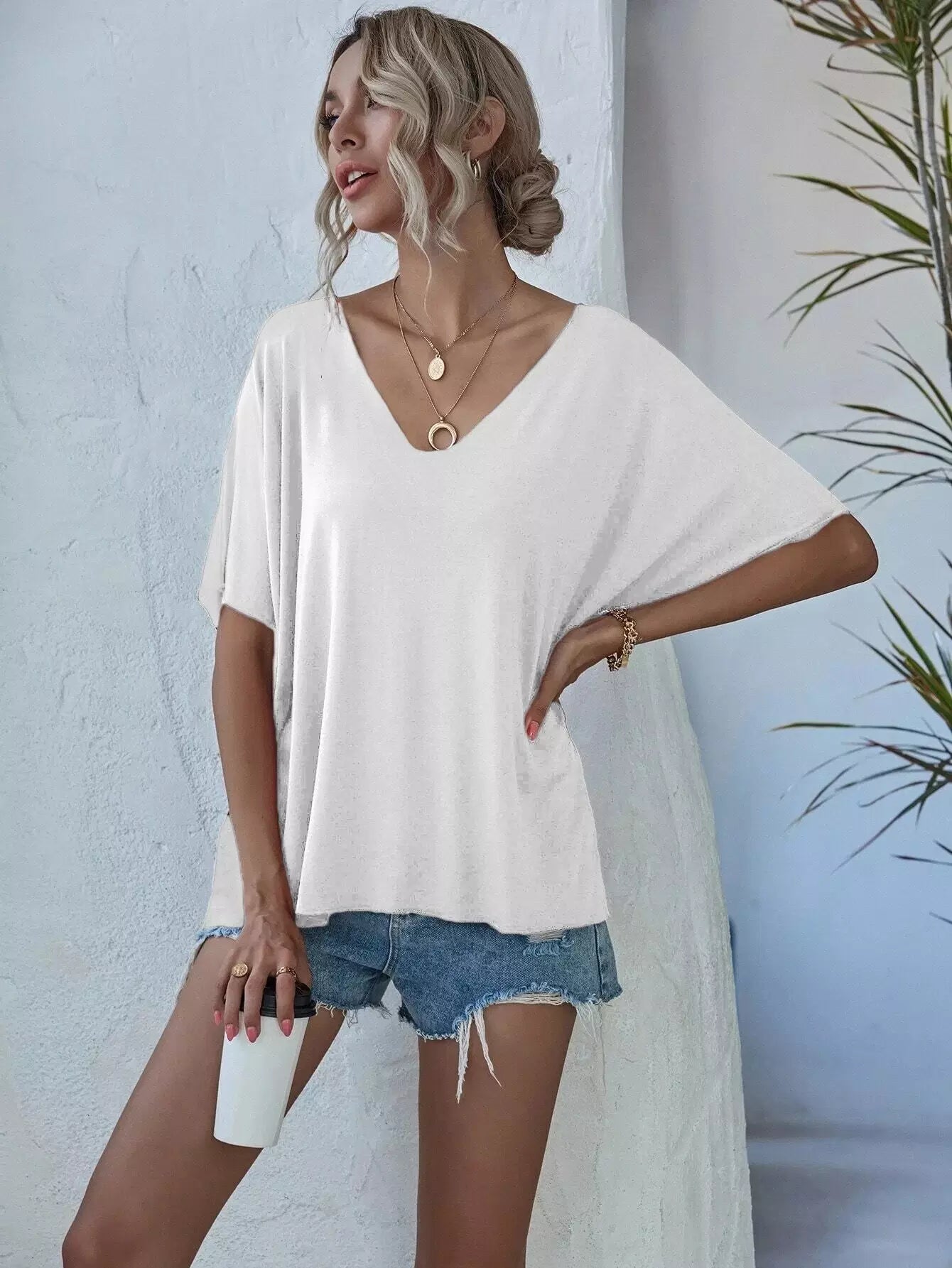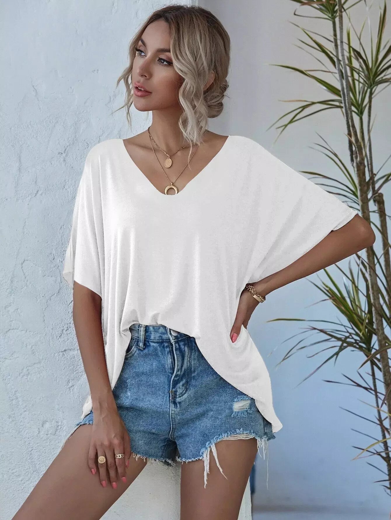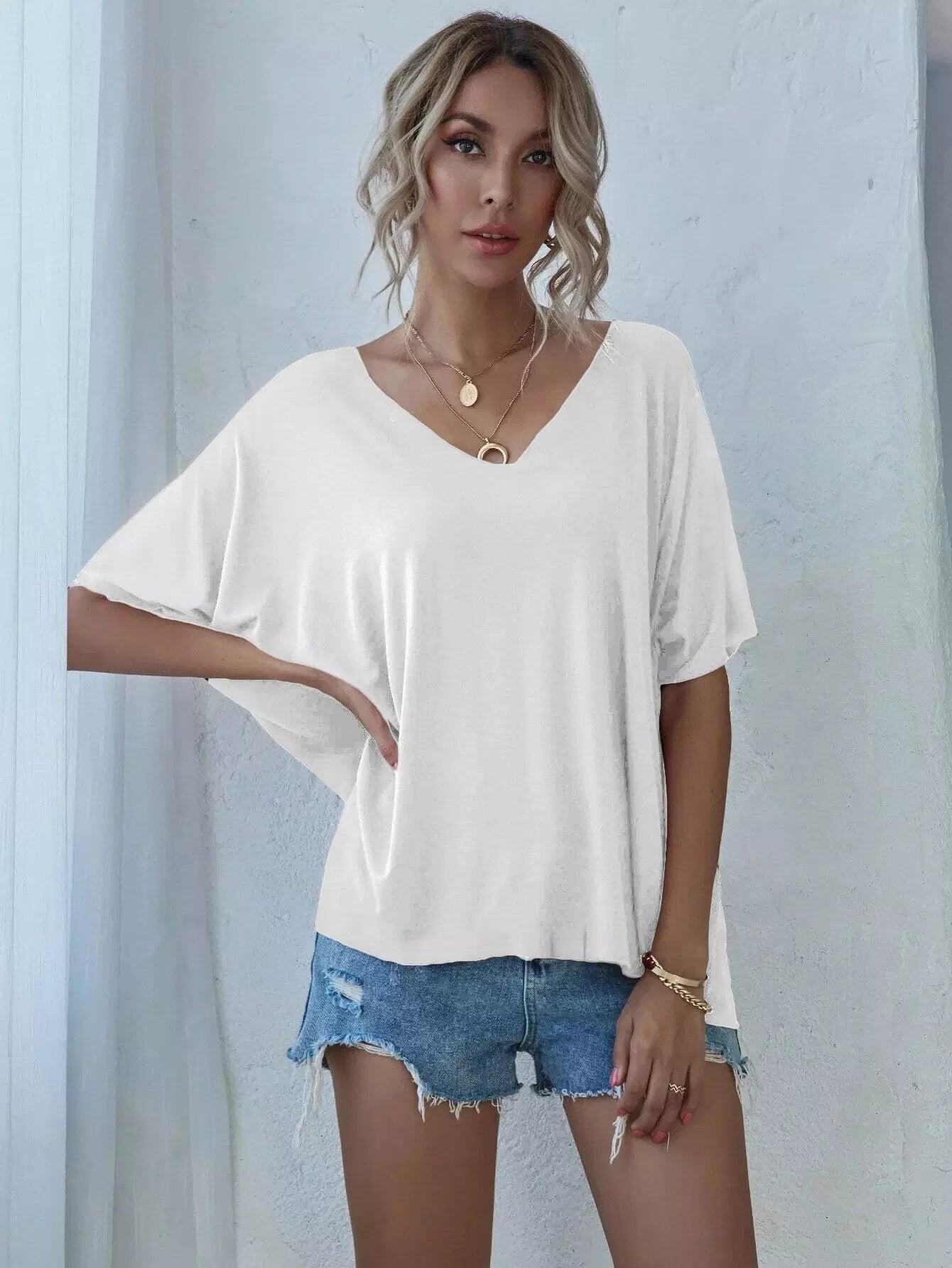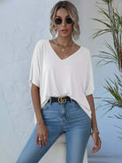 تي شيرت بأكمام على شكل حرف V برقبة على شكل حرف V