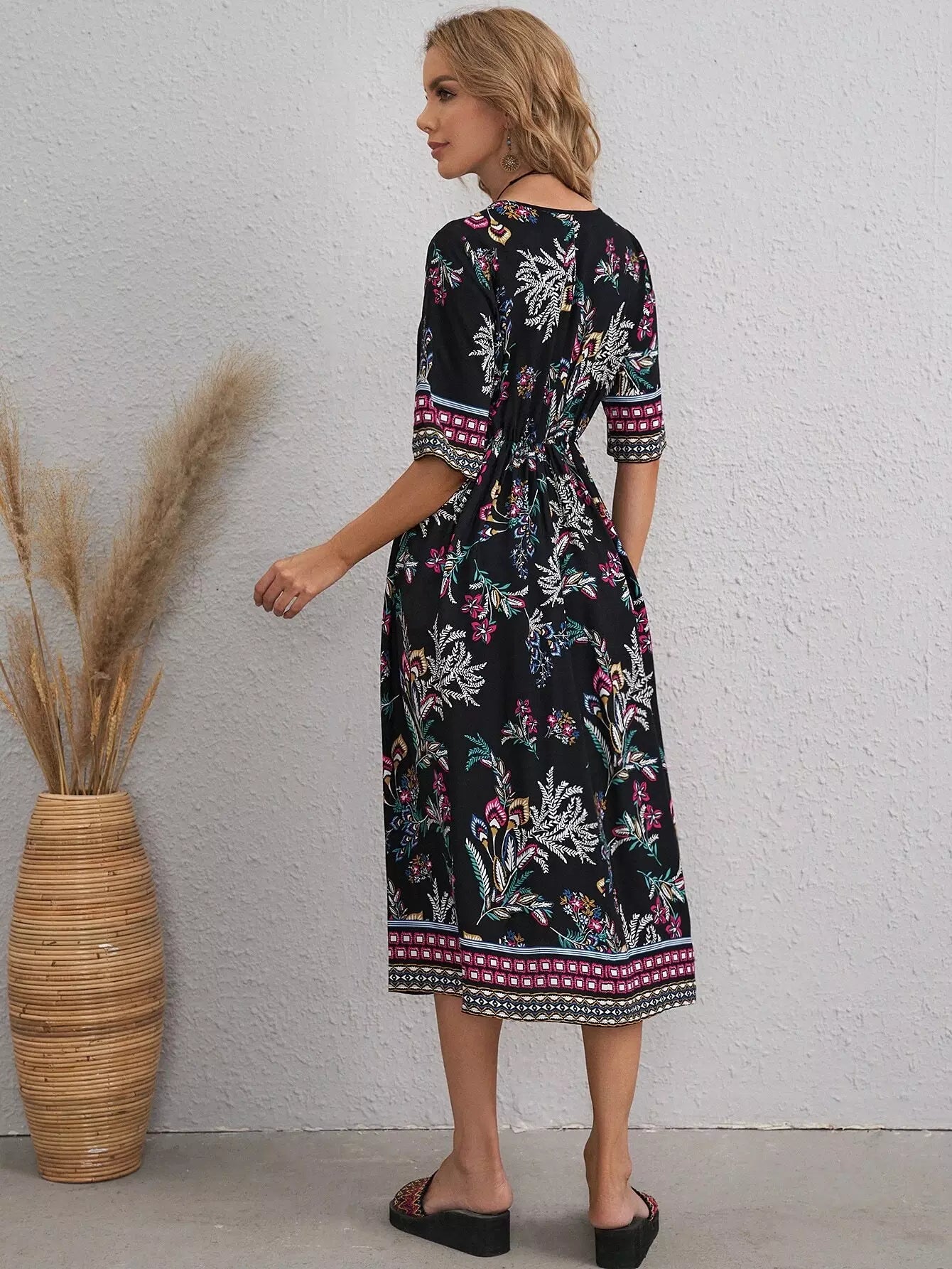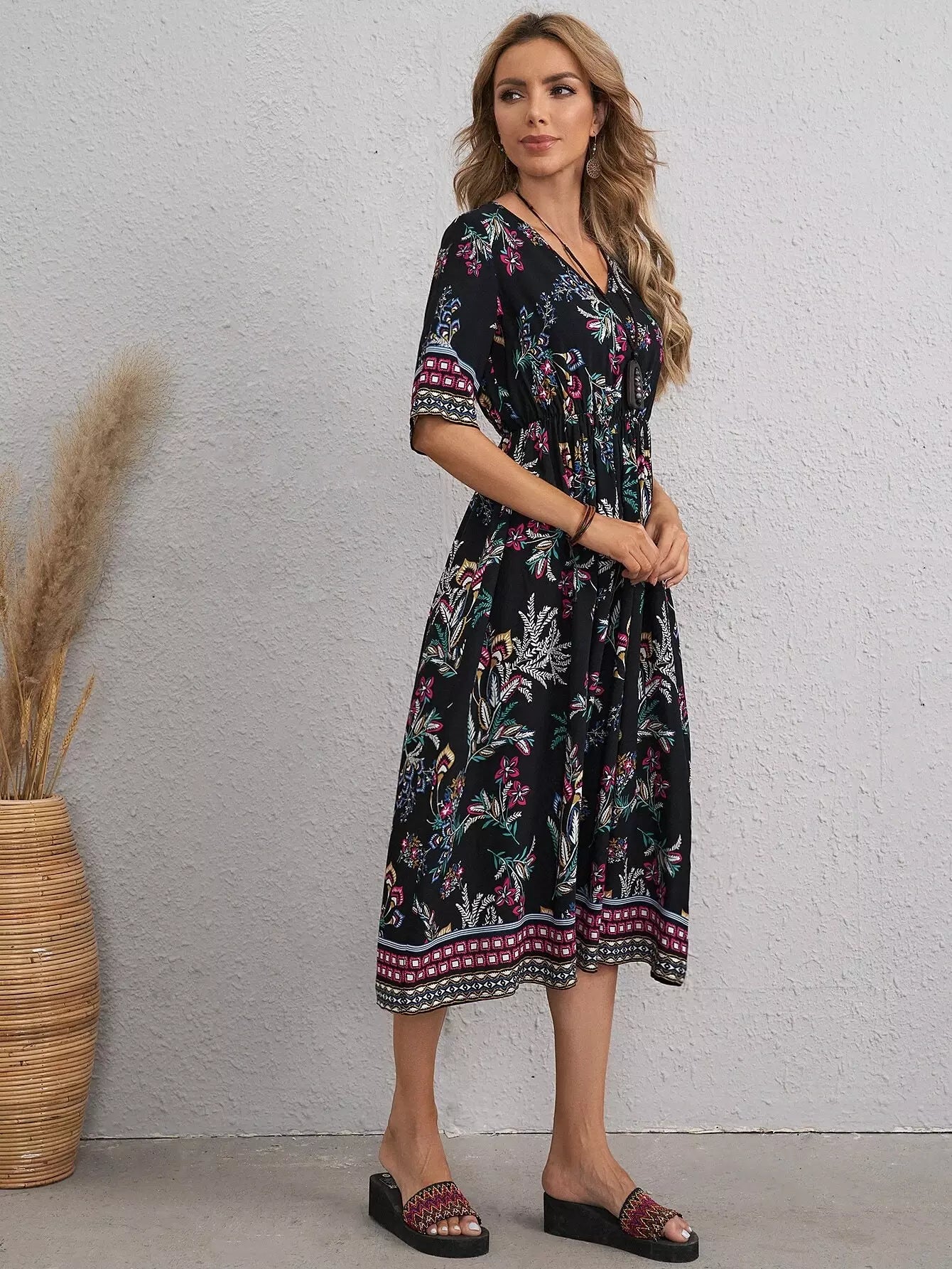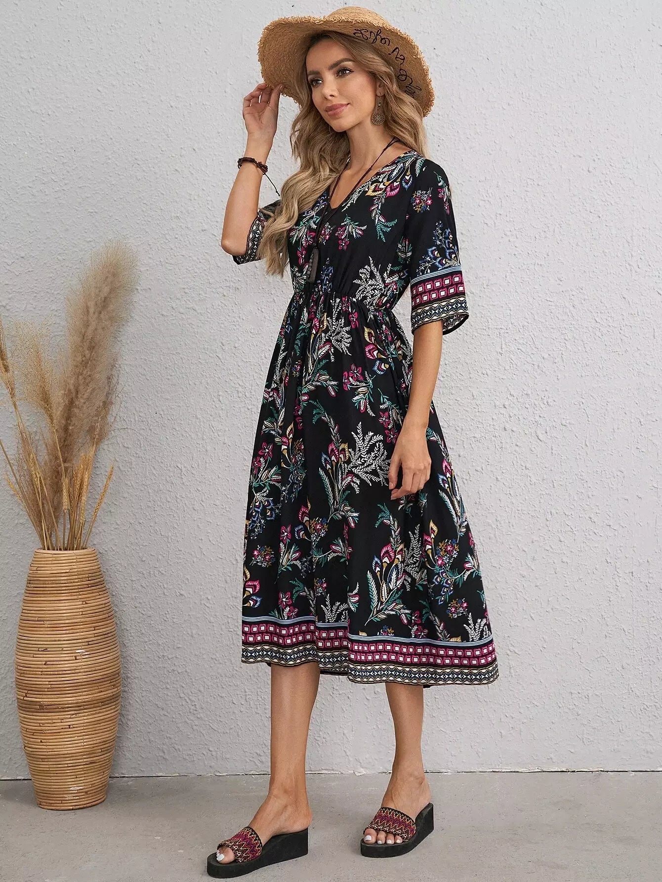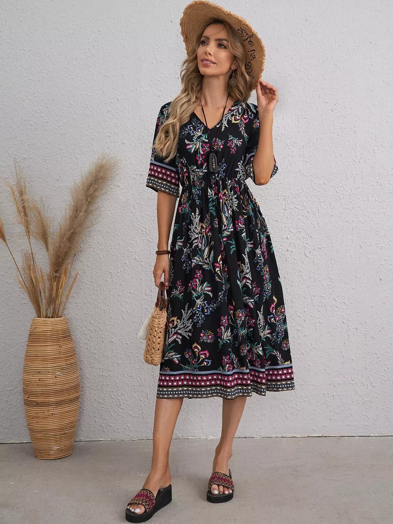 فستان بطبعة زهور وفتحة رقبة على شكل حرف V