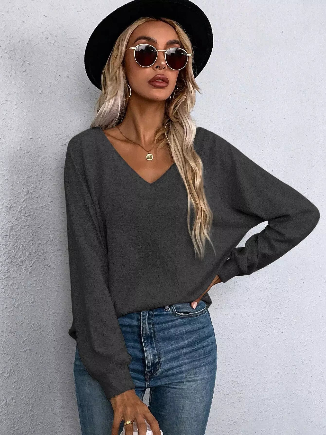 تي شيرت برقبة على شكل حرف V وأكمام راجلان
