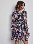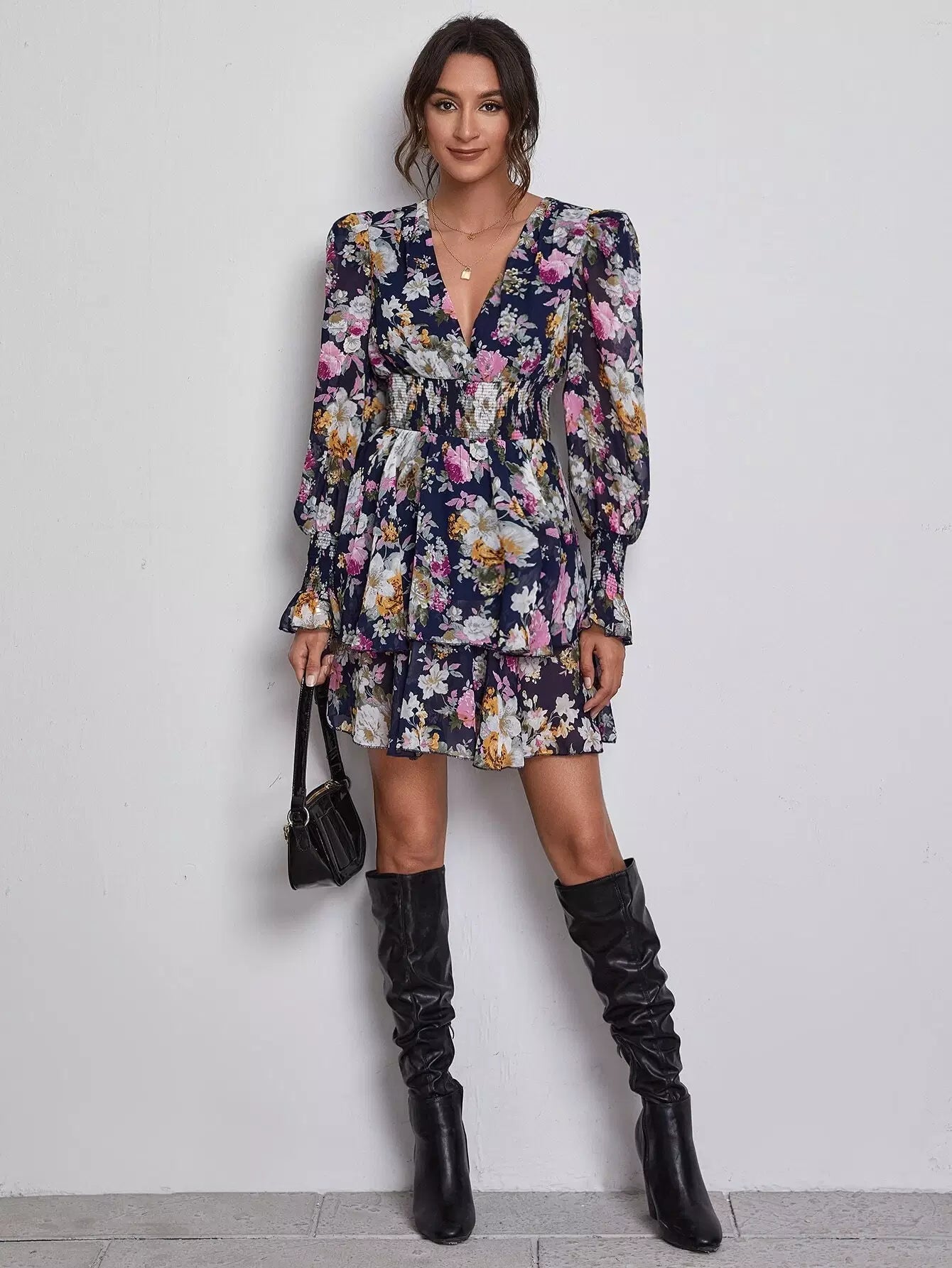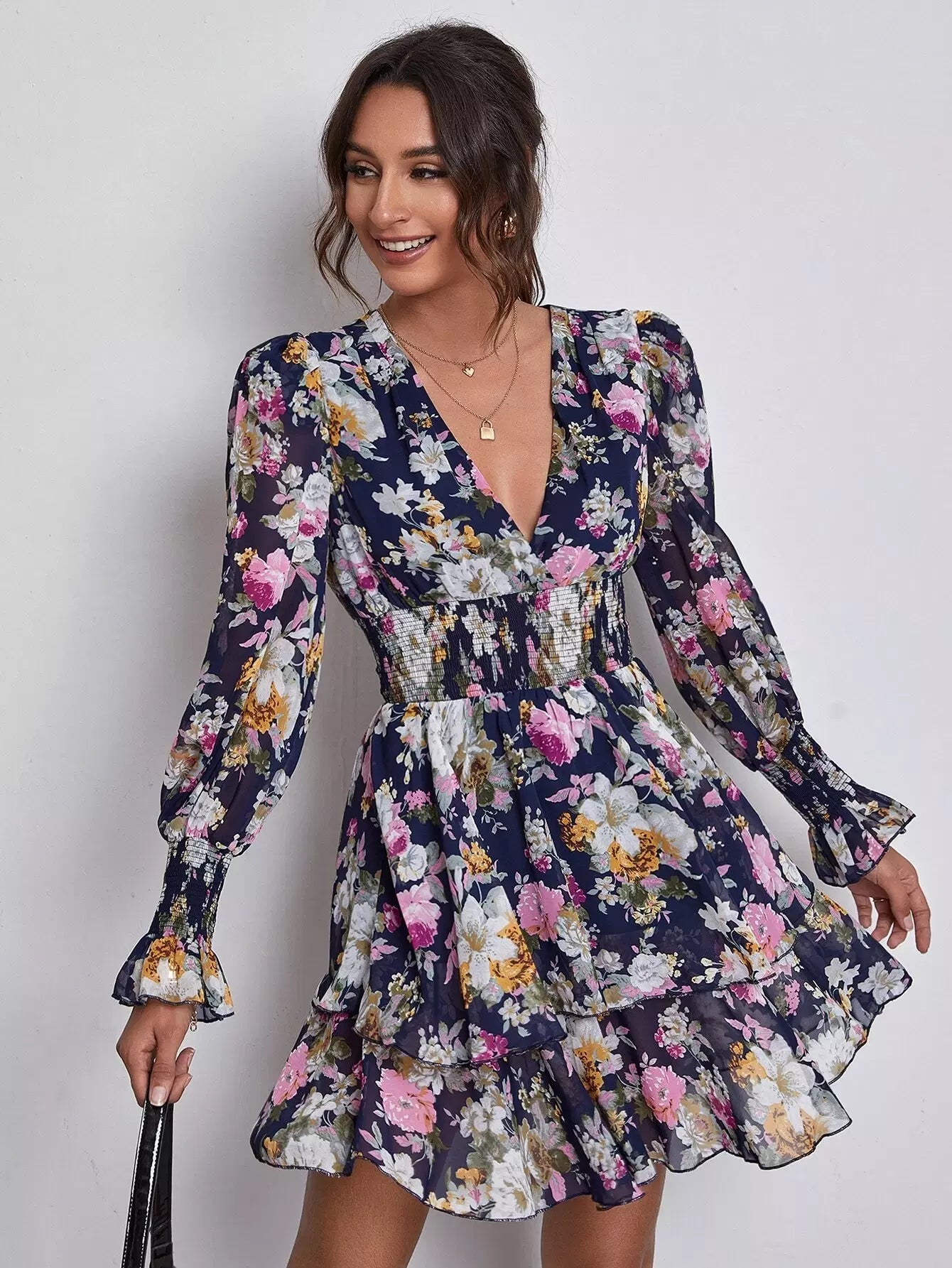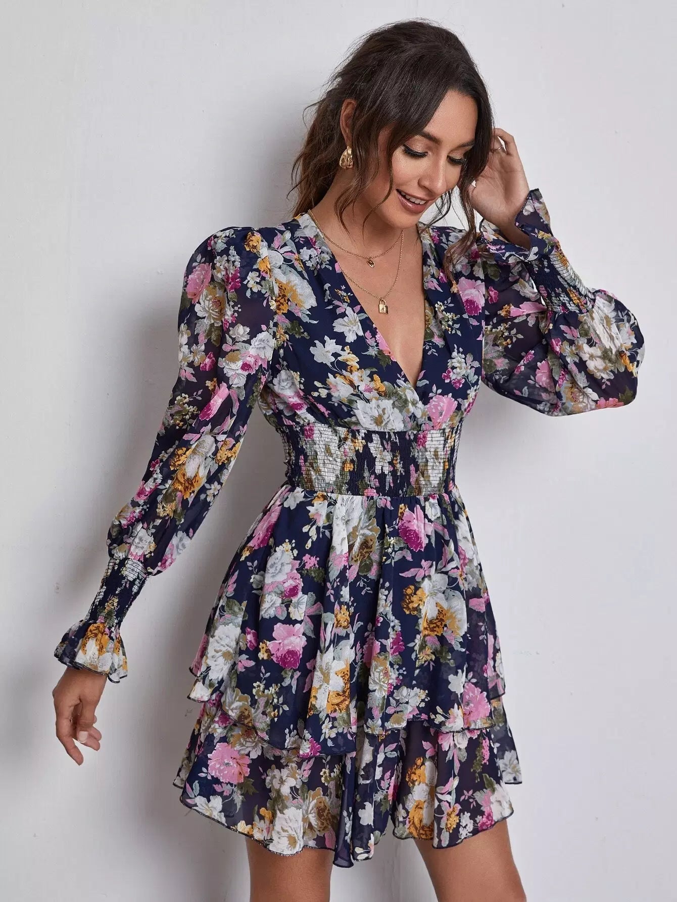 فستان زهري متعدد الطبقات بياقة على شكل حرف V بياقة على شكل حرف V