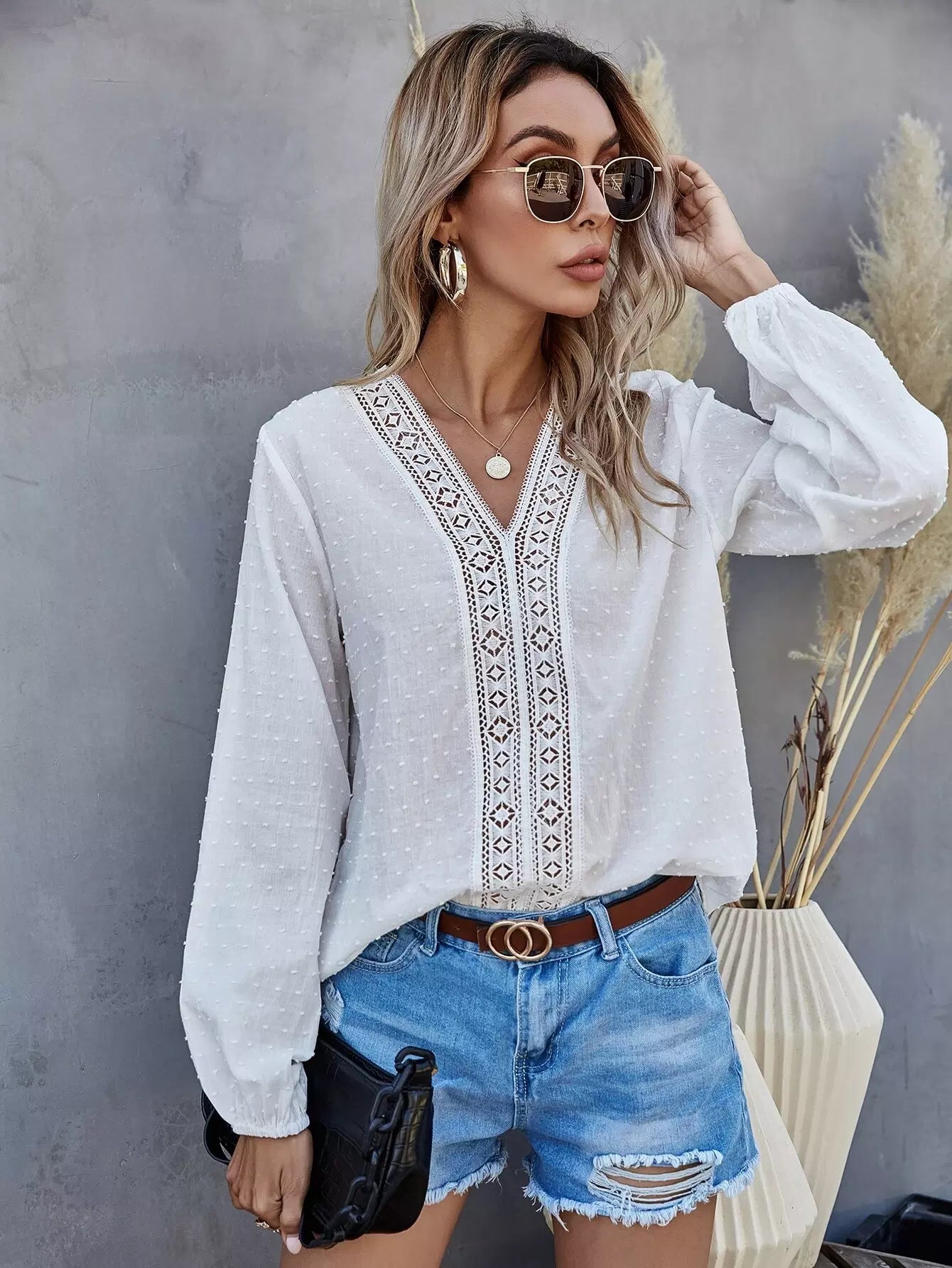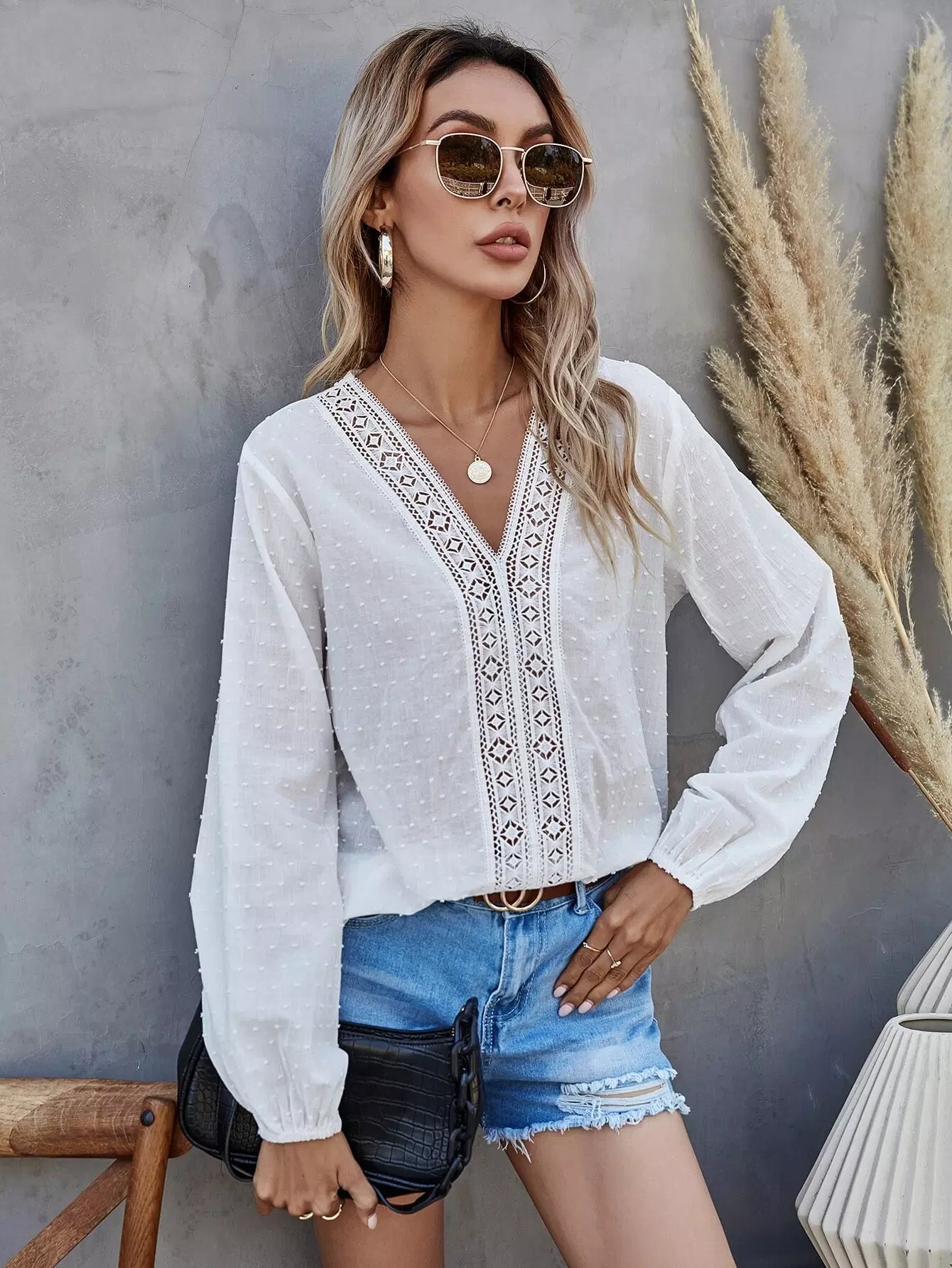 بلوزة دانتيل من الدانتيل المنقط السويسري برقبة على شكل V