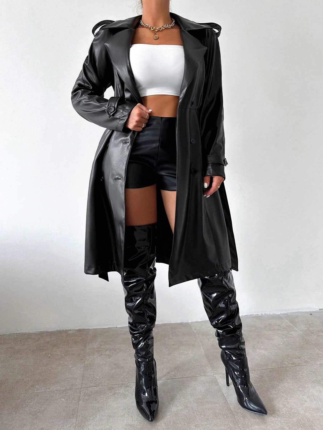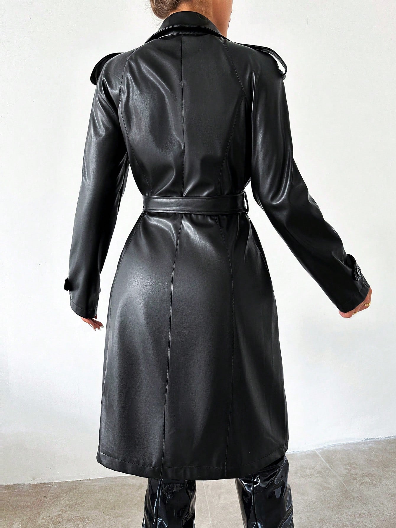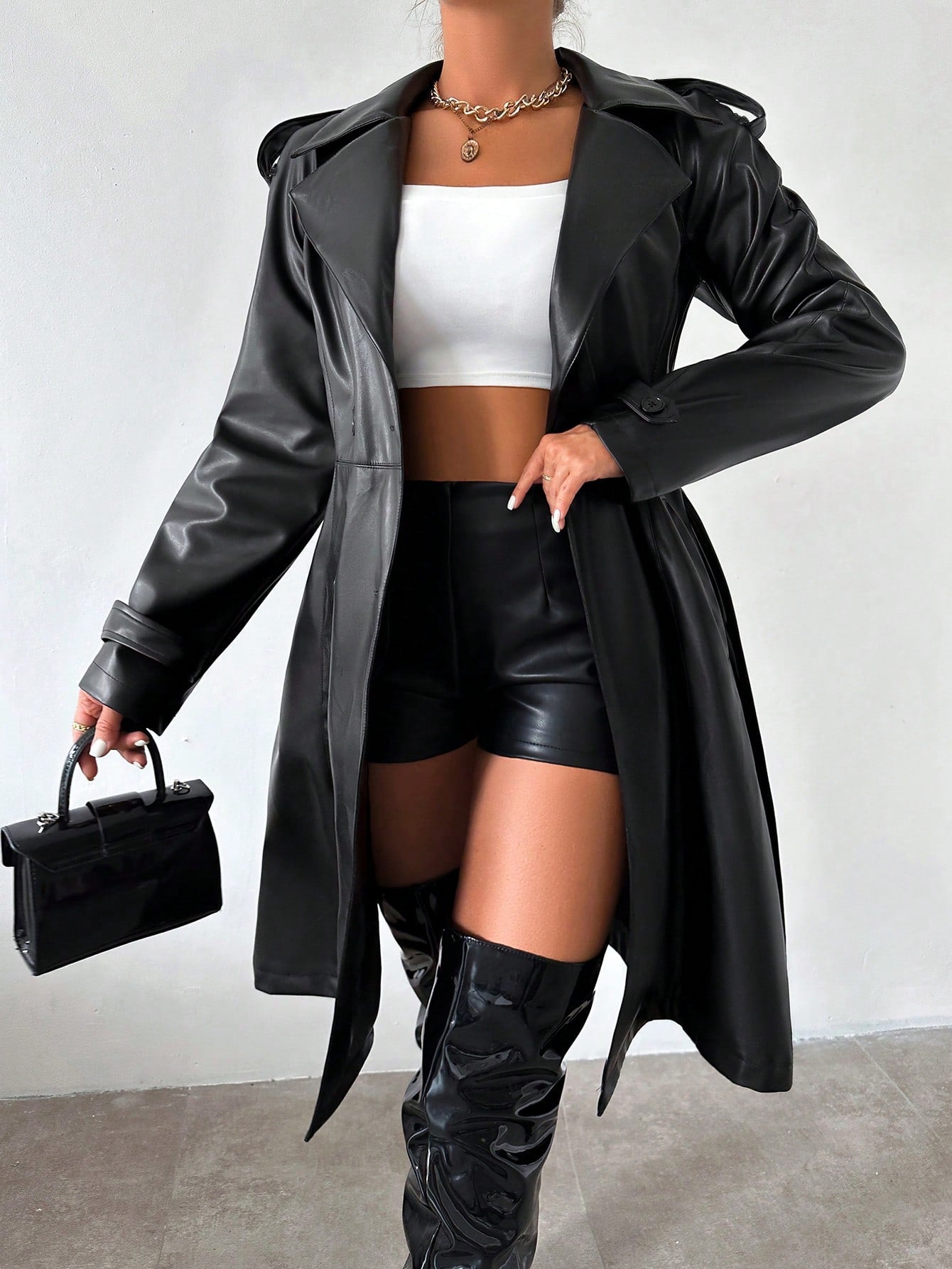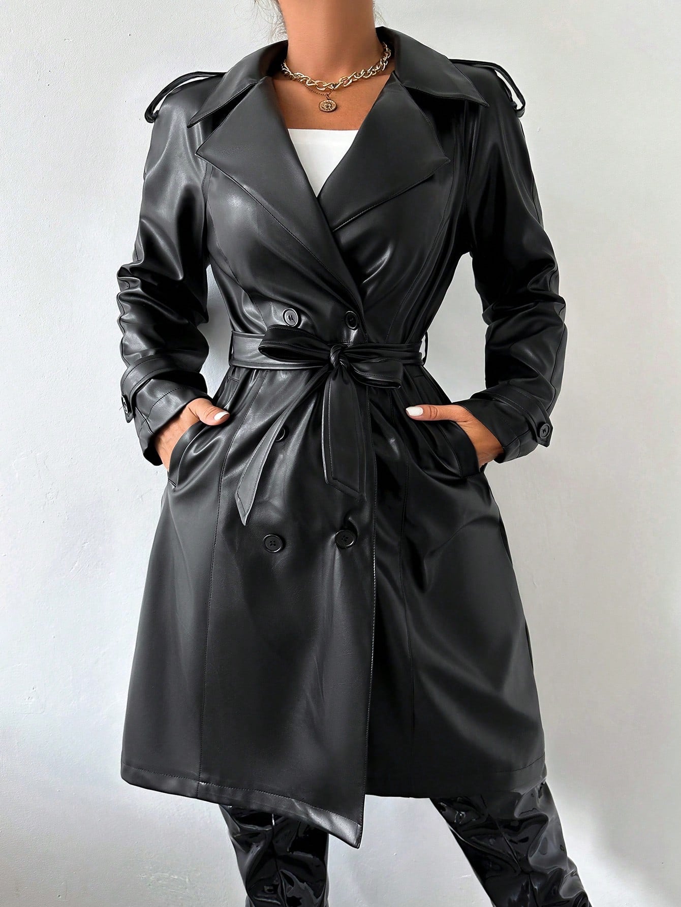 women VaVaBold Pu Notched Collar Long Trench Coat Fall Winter Cloth For Women
