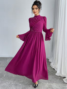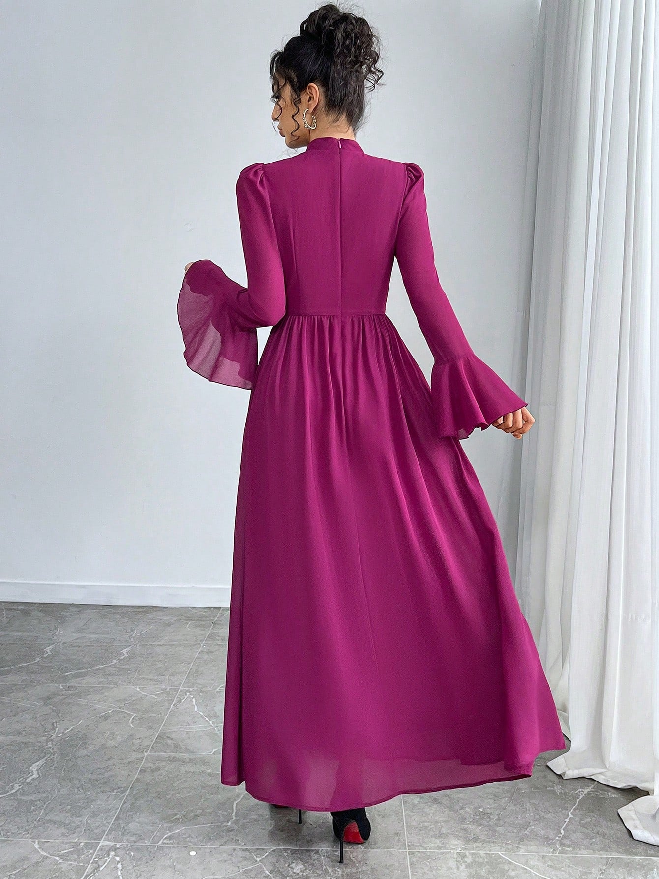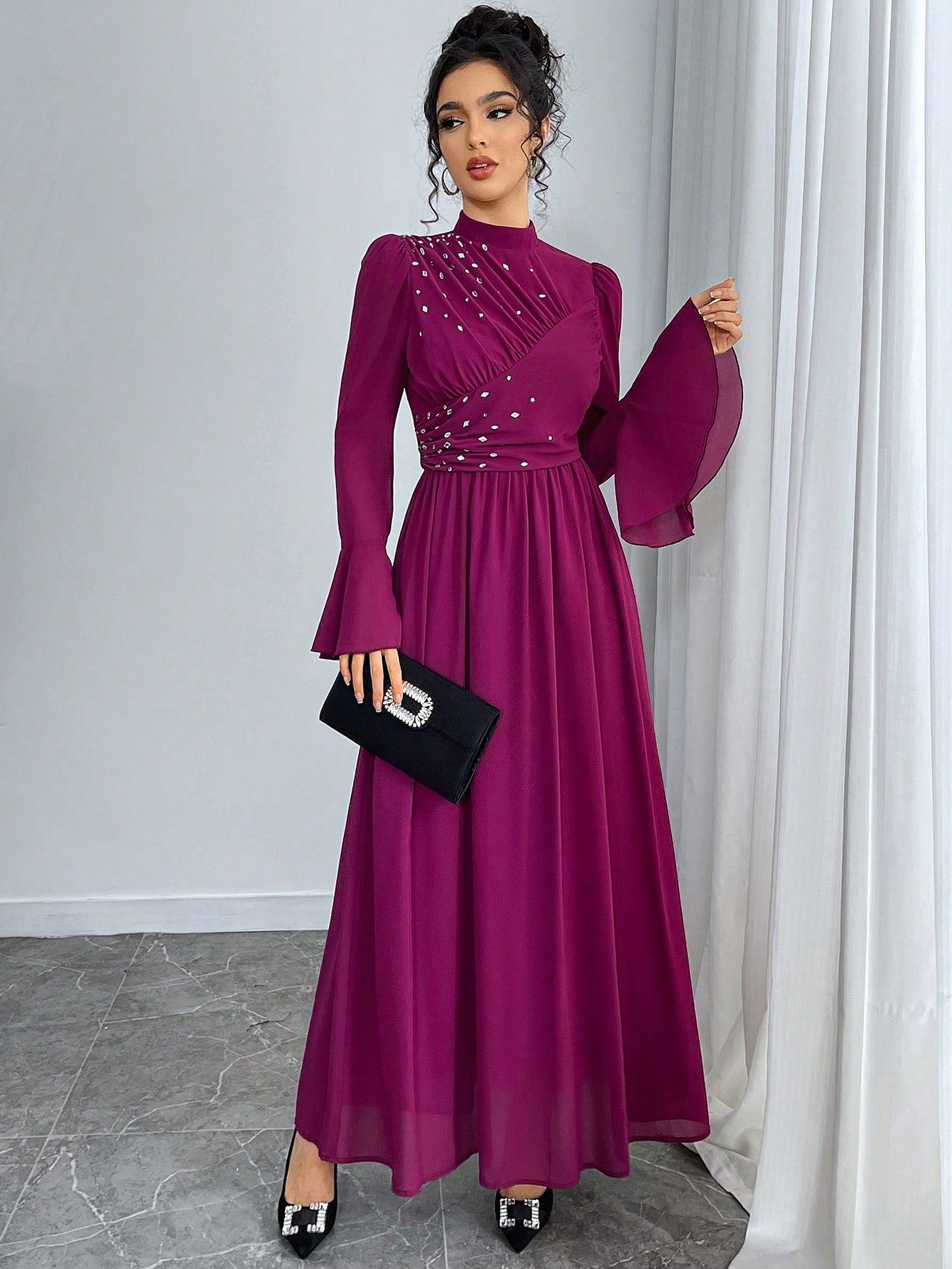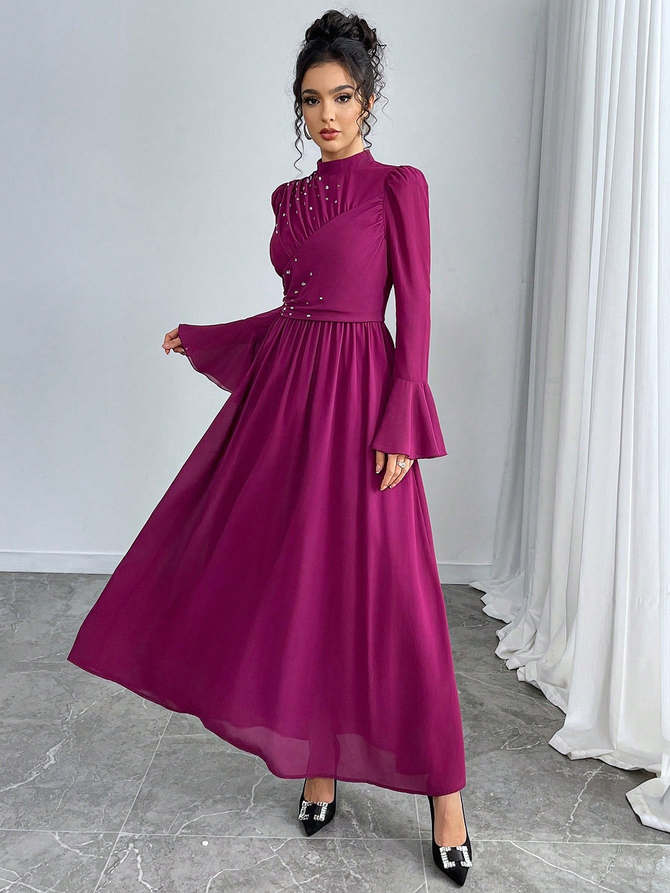 فستان فيلوري الوردي الأحمر المطوي والمزين بأحجار الراين، بتصميم عربي رومانسي وأنيق، بأكمام طويلة على شكل زهرة اللوتس.