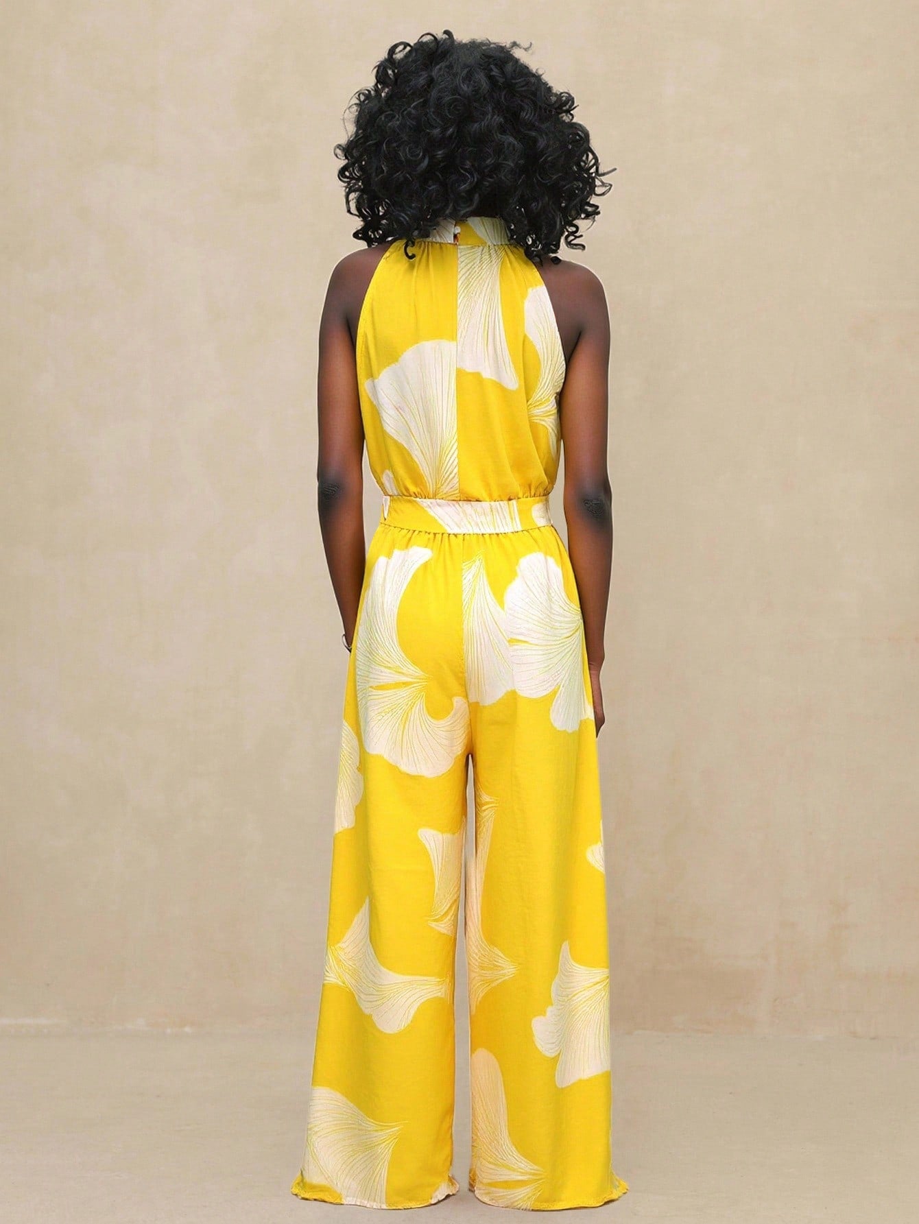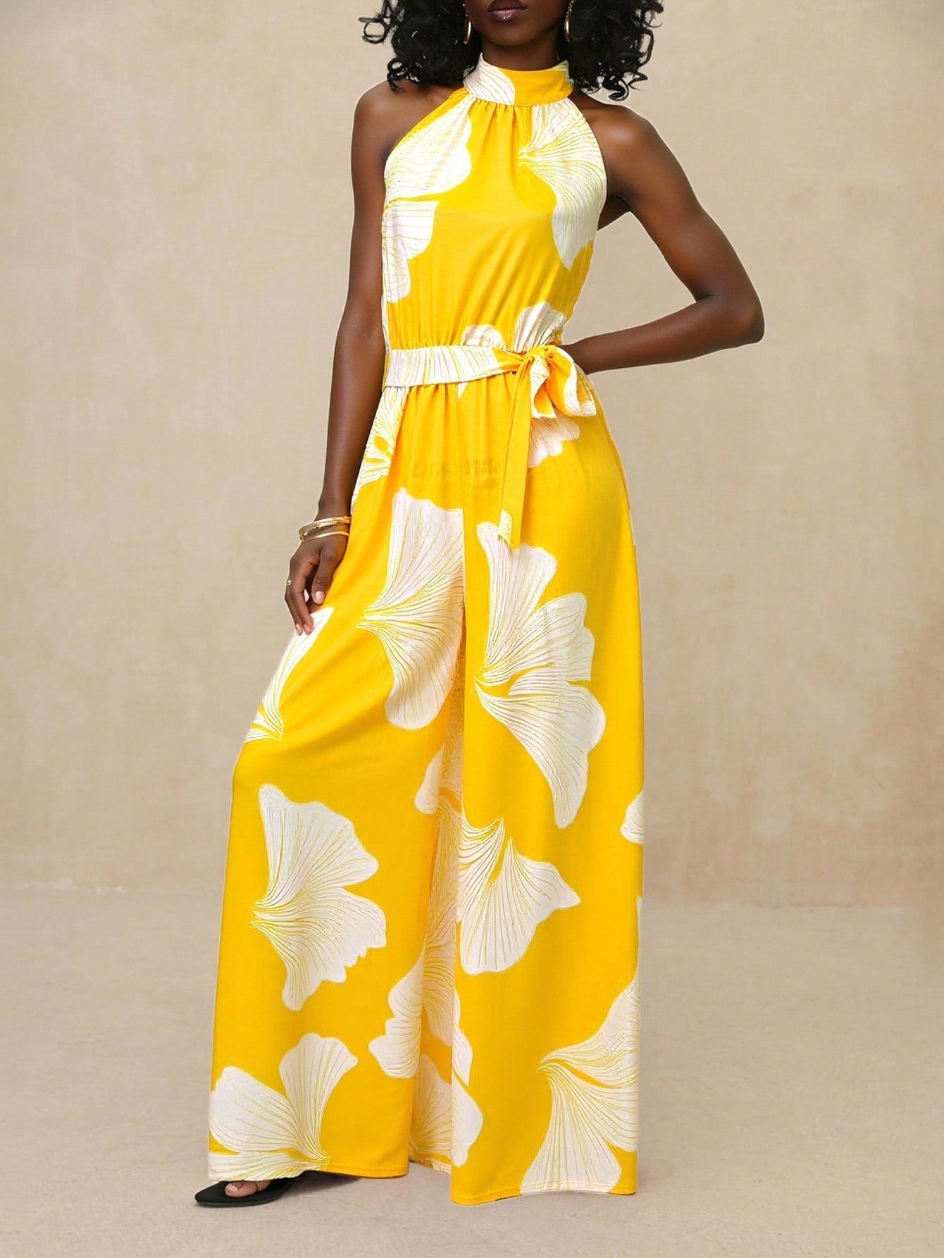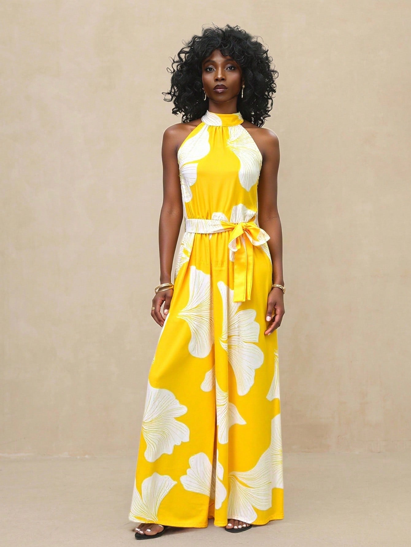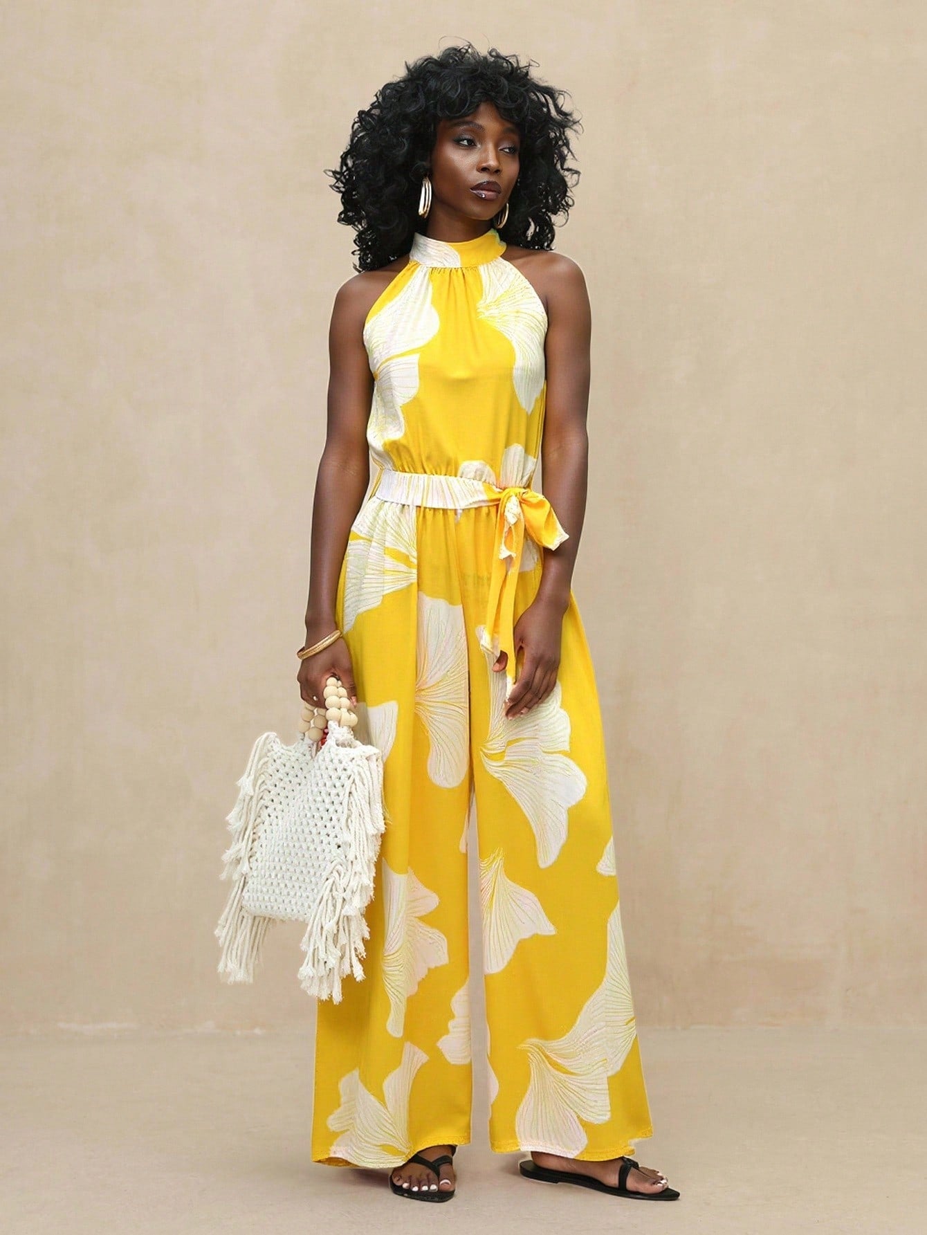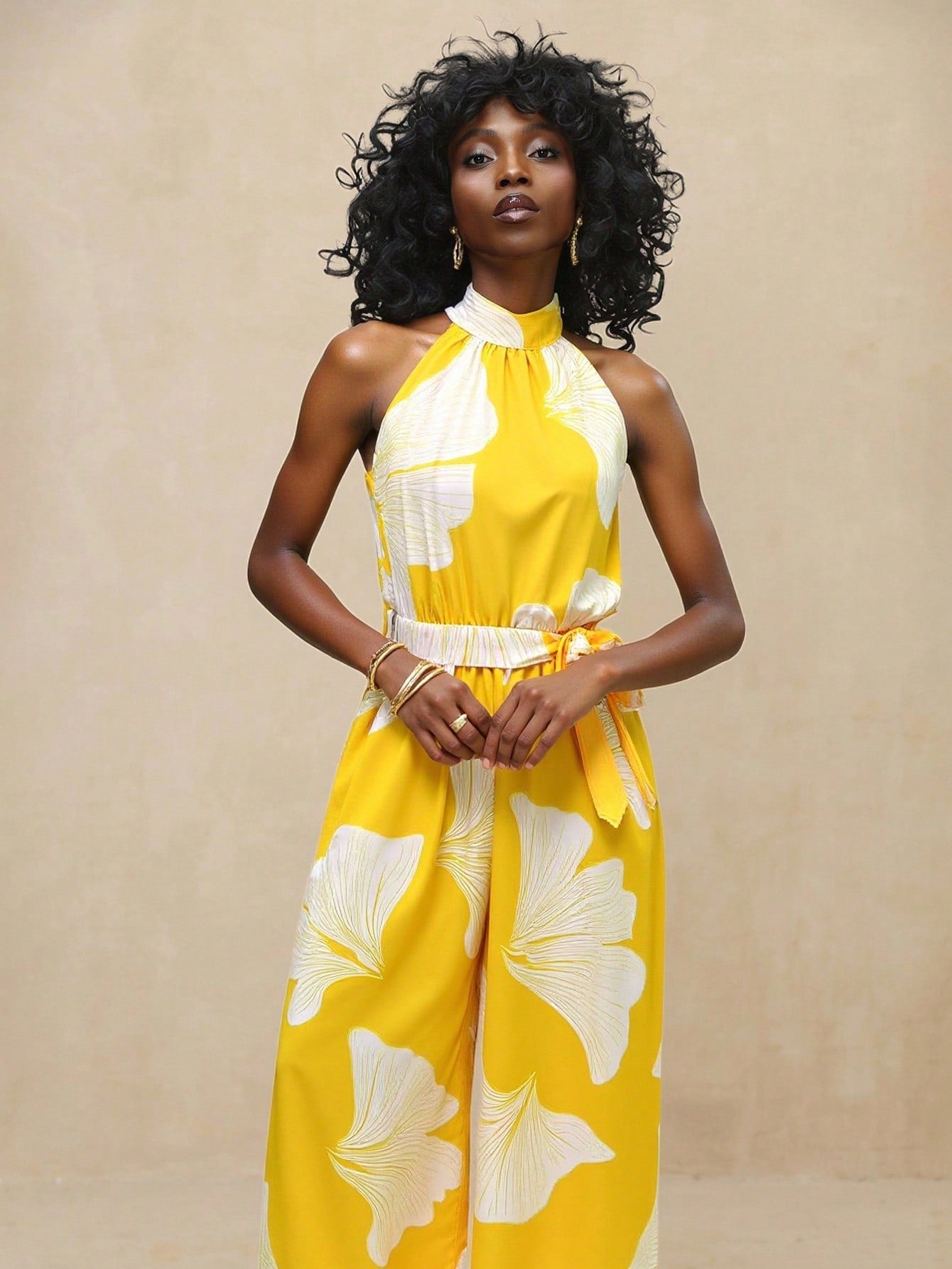Vesra Floral Print Cinched Waist Halter Jumpsuit