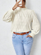 بلوزة فيونيل بلس مزينة بكشكشة وياقة عالية وتطريز بالثقوب، قماش خريفي للنساء